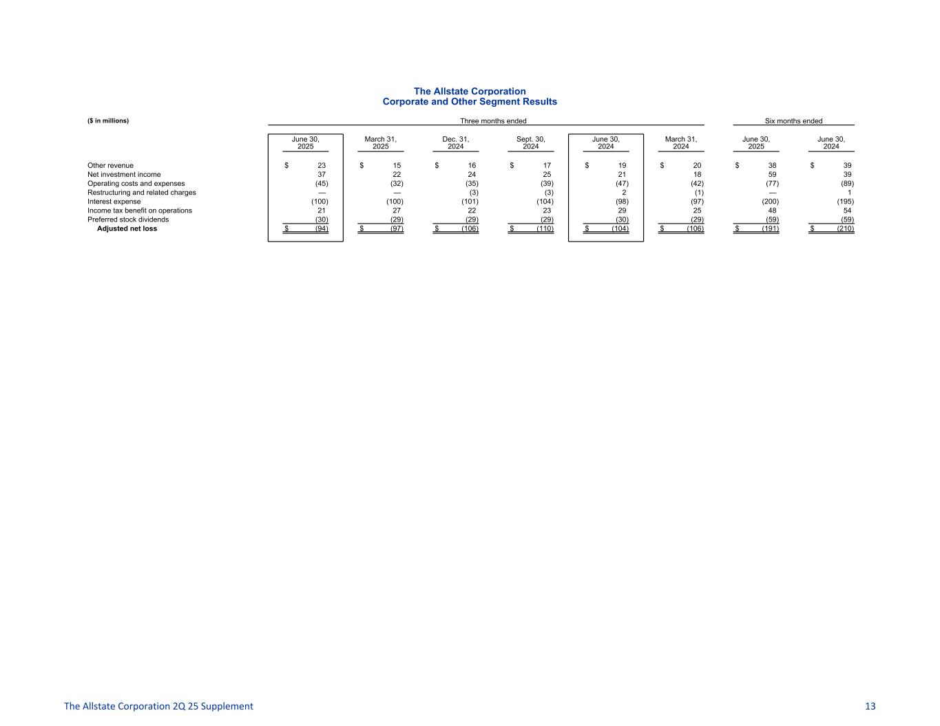 The Allstate Corporation Corporate and Other Segment Results ($ in millions) Three months ended Six months ended June 30, 2025 March 31, 2025 Dec. 31, 2024 Sept. 30, 2024 June 30, 2024 March 31, 2024 June 30, 2025 June 30, 2024 Other revenue $ 23 $ 15 $ 16 $ 17 $ 19 $ 20 $ 38 $ 39 Net investment income 37 22 24 25 21 18 59 39 Operating costs and expenses (45) (32) (35) (39) (47) (42) (77) (89) Restructuring and related charges — — (3) (3) 2 (1) — 1 Interest expense (100) (100) (101) (104) (98) (97) (200) (195) Income tax benefit on operations 21 27 22 23 29 25 48 54 Preferred stock dividends (30) (29) (29) (29) (30) (29) (59) (59) Adjusted net loss $ (94) $ (97) $ (106) $ (110) $ (104) $ (106) $ (191) $ (210) The Allstate Corporation 2Q 25 Supplement 13