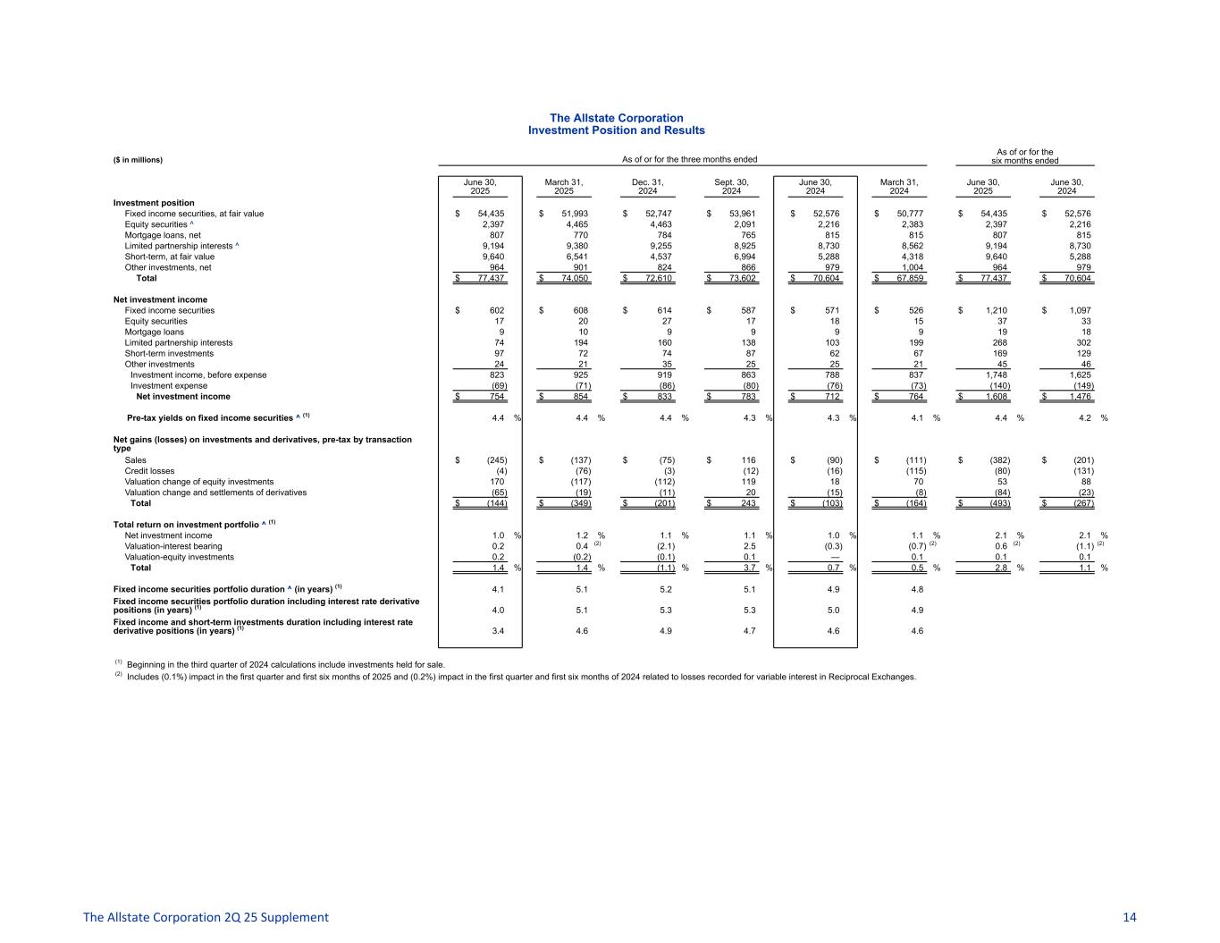 The Allstate Corporation Investment Position and Results ($ in millions) As of or for the three months ended As of or for the six months ended June 30, 2025 March 31, 2025 Dec. 31, 2024 Sept. 30, 2024 June 30, 2024 March 31, 2024 June 30, 2025 June 30, 2024 Investment position Fixed income securities, at fair value $ 54,435 $ 51,993 $ 52,747 $ 53,961 $ 52,576 $ 50,777 $ 54,435 $ 52,576 Equity securities ^ 2,397 4,465 4,463 2,091 2,216 2,383 2,397 2,216 Mortgage loans, net 807 770 784 765 815 815 807 815 Limited partnership interests ^ 9,194 9,380 9,255 8,925 8,730 8,562 9,194 8,730 Short-term, at fair value 9,640 6,541 4,537 6,994 5,288 4,318 9,640 5,288 Other investments, net 964 901 824 866 979 1,004 964 979 Total $ 77,437 $ 74,050 $ 72,610 $ 73,602 $ 70,604 $ 67,859 $ 77,437 $ 70,604 Net investment income Fixed income securities $ 602 $ 608 $ 614 $ 587 $ 571 $ 526 $ 1,210 $ 1,097 Equity securities 17 20 27 17 18 15 37 33 Mortgage loans 9 10 9 9 9 9 19 18 Limited partnership interests 74 194 160 138 103 199 268 302 Short-term investments 97 72 74 87 62 67 169 129 Other investments 24 21 35 25 25 21 45 46 Investment income, before expense 823 925 919 863 788 837 1,748 1,625 Investment expense (69) (71) (86) (80) (76) (73) (140) (149) Net investment income $ 754 $ 854 $ 833 $ 783 $ 712 $ 764 $ 1,608 $ 1,476 Pre-tax yields on fixed income securities ^ (1) 4.4 % 4.4 % 4.4 % 4.3 % 4.3 % 4.1 % 4.4 % 4.2 % Net gains (losses) on investments and derivatives, pre-tax by transaction type Sales $ (245) $ (137) $ (75) $ 116 $ (90) $ (111) $ (382) $ (201) Credit losses (4) (76) (3) (12) (16) (115) (80) (131) Valuation change of equity investments 170 (117) (112) 119 18 70 53 88 Valuation change and settlements of derivatives (65) (19) (11) 20 (15) (8) (84) (23) Total $ (144) $ (349) $ (201) $ 243 $ (103) $ (164) $ (493) $ (267) Total return on investment portfolio ^ (1) Net investment income 1.0 % 1.2 % 1.1 % 1.1 % 1.0 % 1.1 % 2.1 % 2.1 % Valuation-interest bearing 0.2 0.4 (2) (2.1) 2.5 (0.3) (0.7) (2) 0.6 (2) (1.1) (2) Valuation-equity investments 0.2 (0.2) (0.1) 0.1 — 0.1 0.1 0.1 Total 1.4 % 1.4 % (1.1) % 3.7 % 0.7 % 0.5 % 2.8 % 1.1 % Fixed income securities portfolio duration ^ (in years) (1) 4.1 5.1 5.2 5.1 4.9 4.8 Fixed income securities portfolio duration including interest rate derivative positions (in years) (1) 4.0 5.1 5.3 5.3 5.0 4.9 Fixed income and short-term investments duration including interest rate derivative positions (in years) (1) 3.4 4.6 4.9 4.7 4.6 4.6 (1) Beginning in the third quarter of 2024 calculations include investments held for sale. (2) Includes (0.1%) impact in the first quarter and first six months of 2025 and (0.2%) impact in the first quarter and first six months of 2024 related to losses recorded for variable interest in Reciprocal Exchanges. The Allstate Corporation 2Q 25 Supplement 14