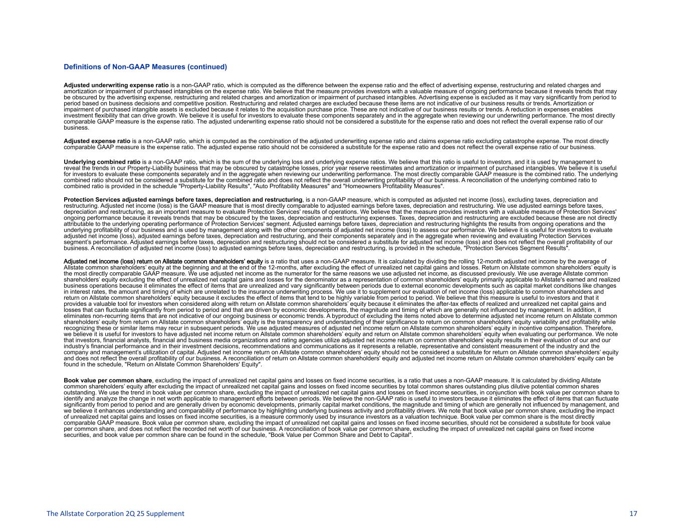 Definitions of Non-GAAP Measures (continued) Adjusted underwriting expense ratio is a non-GAAP ratio, which is computed as the difference between the expense ratio and the effect of advertising expense, restructuring and related charges and amortization or impairment of purchased intangibles on the expense ratio. We believe that the measure provides investors with a valuable measure of ongoing performance because it reveals trends that may be obscured by the advertising expense, restructuring and related charges and amortization or impairment of purchased intangibles. Advertising expense is excluded as it may vary significantly from period to period based on business decisions and competitive position. Restructuring and related charges are excluded because these items are not indicative of our business results or trends. Amortization or impairment of purchased intangible assets is excluded because it relates to the acquisition purchase price. These are not indicative of our business results or trends. A reduction in expenses enables investment flexibility that can drive growth. We believe it is useful for investors to evaluate these components separately and in the aggregate when reviewing our underwriting performance. The most directly comparable GAAP measure is the expense ratio. The adjusted underwriting expense ratio should not be considered a substitute for the expense ratio and does not reflect the overall expense ratio of our business. Adjusted expense ratio is a non-GAAP ratio, which is computed as the combination of the adjusted underwriting expense ratio and claims expense ratio excluding catastrophe expense. The most directly comparable GAAP measure is the expense ratio. The adjusted expense ratio should not be considered a substitute for the expense ratio and does not reflect the overall expense ratio of our business. Underlying combined ratio is a non-GAAP ratio, which is the sum of the underlying loss and underlying expense ratios. We believe that this ratio is useful to investors, and it is used by management to reveal the trends in our Property-Liability business that may be obscured by catastrophe losses, prior year reserve reestimates and amortization or impairment of purchased intangibles. We believe it is useful for investors to evaluate these components separately and in the aggregate when reviewing our underwriting performance. The most directly comparable GAAP measure is the combined ratio. The underlying combined ratio should not be considered a substitute for the combined ratio and does not reflect the overall underwriting profitability of our business. A reconciliation of the underlying combined ratio to combined ratio is provided in the schedule "Property-Liability Results", "Auto Profitability Measures" and "Homeowners Profitability Measures". Protection Services adjusted earnings before taxes, depreciation and restructuring, is a non-GAAP measure, which is computed as adjusted net income (loss), excluding taxes, depreciation and restructuring. Adjusted net income (loss) is the GAAP measure that is most directly comparable to adjusted earnings before taxes, depreciation and restructuring. We use adjusted earnings before taxes, depreciation and restructuring, as an important measure to evaluate Protection Services' results of operations. We believe that the measure provides investors with a valuable measure of Protection Services' ongoing performance because it reveals trends that may be obscured by the taxes, depreciation and restructuring expenses. Taxes, depreciation and restructuring are excluded because these are not directly attributable to the underlying operating performance of Protection Services' segment. Adjusted earnings before taxes, depreciation and restructuring highlights the results from ongoing operations and the underlying profitability of our business and is used by management along with the other components of adjusted net income (loss) to assess our performance. We believe it is useful for investors to evaluate adjusted net income (loss), adjusted earnings before taxes, depreciation and restructuring, and their components separately and in the aggregate when reviewing and evaluating Protection Services segment’s performance. Adjusted earnings before taxes, depreciation and restructuring should not be considered a substitute for adjusted net income (loss) and does not reflect the overall profitability of our business. A reconciliation of adjusted net income (loss) to adjusted earnings before taxes, depreciation and restructuring, is provided in the schedule, "Protection Services Segment Results". Adjusted net income (loss) return on Allstate common shareholders’ equity is a ratio that uses a non-GAAP measure. It is calculated by dividing the rolling 12-month adjusted net income by the average of Allstate common shareholders’ equity at the beginning and at the end of the 12-months, after excluding the effect of unrealized net capital gains and losses. Return on Allstate common shareholders’ equity is the most directly comparable GAAP measure. We use adjusted net income as the numerator for the same reasons we use adjusted net income, as discussed previously. We use average Allstate common shareholders’ equity excluding the effect of unrealized net capital gains and losses for the denominator as a representation of common shareholders’ equity primarily applicable to Allstate's earned and realized business operations because it eliminates the effect of items that are unrealized and vary significantly between periods due to external economic developments such as capital market conditions like changes in interest rates, the amount and timing of which are unrelated to the insurance underwriting process. We use it to supplement our evaluation of net income (loss) applicable to common shareholders and return on Allstate common shareholders’ equity because it excludes the effect of items that tend to be highly variable from period to p