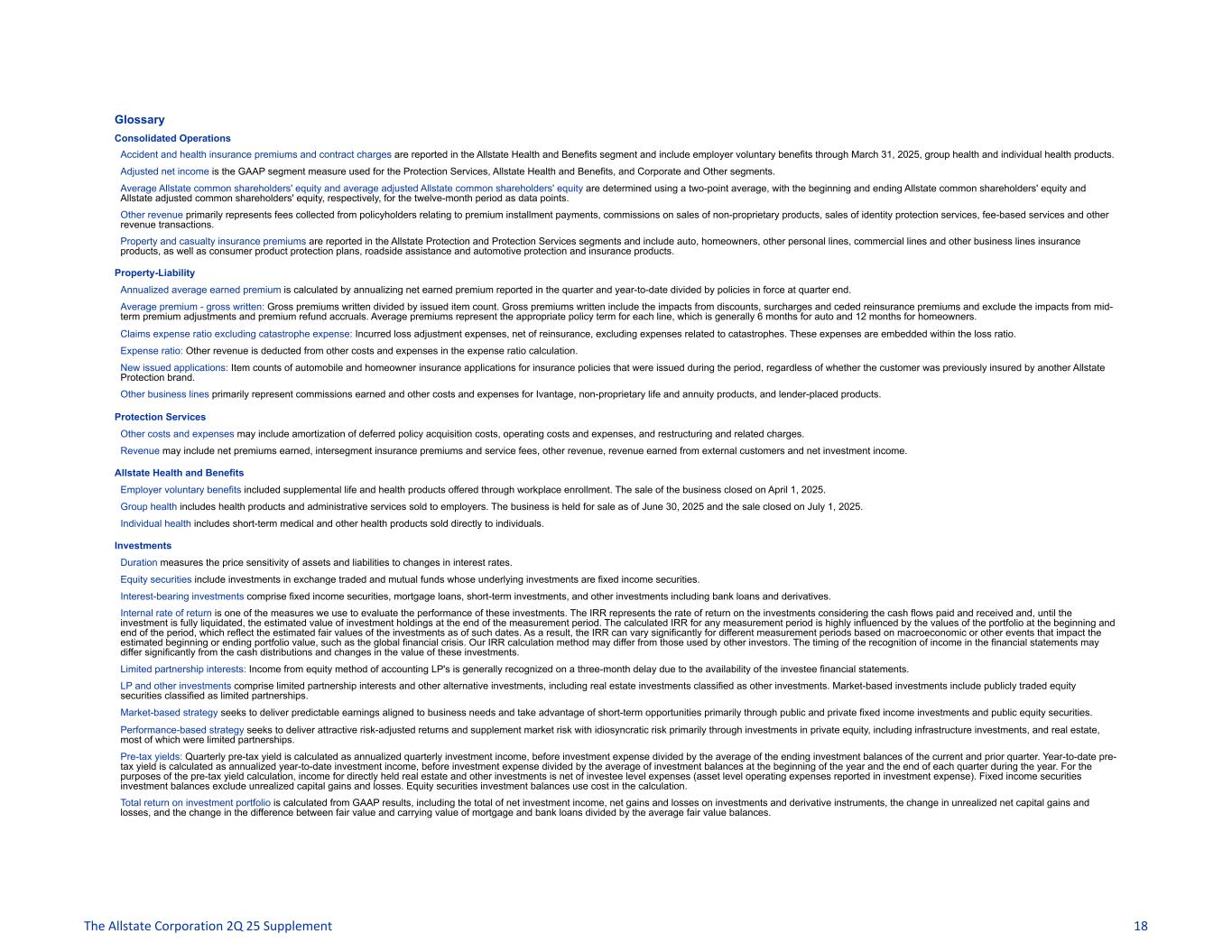 Glossary Consolidated Operations Accident and health insurance premiums and contract charges are reported in the Allstate Health and Benefits segment and include employer voluntary benefits through March 31, 2025, group health and individual health products. Adjusted net income is the GAAP segment measure used for the Protection Services, Allstate Health and Benefits, and Corporate and Other segments. Average Allstate common shareholders' equity and average adjusted Allstate common shareholders' equity are determined using a two-point average, with the beginning and ending Allstate common shareholders' equity and Allstate adjusted common shareholders' equity, respectively, for the twelve-month period as data points. Other revenue primarily represents fees collected from policyholders relating to premium installment payments, commissions on sales of non-proprietary products, sales of identity protection services, fee-based services and other revenue transactions. Property and casualty insurance premiums are reported in the Allstate Protection and Protection Services segments and include auto, homeowners, other personal lines, commercial lines and other business lines insurance products, as well as consumer product protection plans, roadside assistance and automotive protection and insurance products. Property-Liability Annualized average earned premium is calculated by annualizing net earned premium reported in the quarter and year-to-date divided by policies in force at quarter end. Average premium - gross written: Gross premiums written divided by issued item count. Gross premiums written include the impacts from discounts, surcharges and ceded reinsurance premiums and exclude the impacts from mid- term premium adjustments and premium refund accruals. Average premiums represent the appropriate policy term for each line, which is generally 6 months for auto and 12 months for homeowners. Claims expense ratio excluding catastrophe expense: Incurred loss adjustment expenses, net of reinsurance, excluding expenses related to catastrophes. These expenses are embedded within the loss ratio. Expense ratio: Other revenue is deducted from other costs and expenses in the expense ratio calculation. New issued applications: Item counts of automobile and homeowner insurance applications for insurance policies that were issued during the period, regardless of whether the customer was previously insured by another Allstate Protection brand. Other business lines primarily represent commissions earned and other costs and expenses for Ivantage, non-proprietary life and annuity products, and lender-placed products. Protection Services Other costs and expenses may include amortization of deferred policy acquisition costs, operating costs and expenses, and restructuring and related charges. Revenue may include net premiums earned, intersegment insurance premiums and service fees, other revenue, revenue earned from external customers and net investment income. Allstate Health and Benefits Employer voluntary benefits included supplemental life and health products offered through workplace enrollment. The sale of the business closed on April 1, 2025. Group health includes health products and administrative services sold to employers. The business is held for sale as of June 30, 2025 and the sale closed on July 1, 2025. Individual health includes short-term medical and other health products sold directly to individuals. Investments Duration measures the price sensitivity of assets and liabilities to changes in interest rates. Equity securities include investments in exchange traded and mutual funds whose underlying investments are fixed income securities. Interest-bearing investments comprise fixed income securities, mortgage loans, short-term investments, and other investments including bank loans and derivatives. Internal rate of return is one of the measures we use to evaluate the performance of these investments. The IRR represents the rate of return on the investments considering the cash flows paid and received and, until the investment is fully liquidated, the estimated value of investment holdings at the end of the measurement period. The calculated IRR for any measurement period is highly influenced by the values of the portfolio at the beginning and end of the period, which reflect the estimated fair values of the investments as of such dates. As a result, the IRR can vary significantly for different measurement periods based on macroeconomic or other events that impact the estimated beginning or ending portfolio value, such as the global financial crisis. Our IRR calculation method may differ from those used by other investors. The timing of the recognition of income in the financial statements may differ significantly from the cash distributions and changes in the value of these investments. Limited partnership interests: Income from equity method of accounting LP's is generally recognized on a three-month delay due to the availability of the investee financial statements. LP and other investments comprise limited partnership interests and other alternative investments, including real estate investments classified as other investments. Market-based investments include publicly traded equity securities classified as limited partnerships. Market-based strategy seeks to deliver predictable earnings aligned to business needs and take advantage of short-term opportunities primarily through public and private fixed income investments and public equity securities. Performance-based strategy seeks to deliver attractive risk-adjusted returns and supplement market risk with idiosyncratic risk primarily through investments in private equity, including infrastructure investments, and real estate, most of which were limited partnerships. Pre-tax yields: Quarterly pre-tax yield is calculated as annualized quarterly investment income, before investment expense divided by the average of the ending investment balance