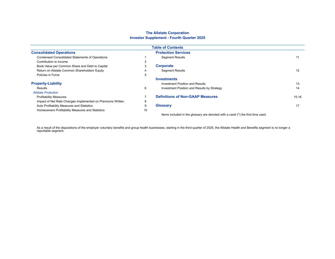 The Allstate Corporation Investor Supplement - Fourth Quarter 2025 Table of Contents Consolidated Operations Protection Services Condensed Consolidated Statements of Operations 1 Segment Results 11 Contribution to Income 2 Book Value per Common Share and Debt to Capital 3 Corporate Return on Allstate Common Shareholders' Equity 4 Segment Results 12 Policies in Force 5 Investments Property-Liability Investment Position and Results 13 Results 6 Investment Position and Results by Strategy 14 Allstate Protection Profitability Measures 7 Definitions of Non-GAAP Measures 15,16 Impact of Net Rate Changes Implemented on Premiums Written 8 Auto Profitability Measures and Statistics 9 Glossary 17 Homeowners Profitability Measures and Statistics 10 Items included in the glossary are denoted with a caret (^) the first time used. As a result of the dispositions of the employer voluntary benefits and group health businesses, starting in the third quarter of 2025, the Allstate Health and Benefits segment is no longer a reportable segment.