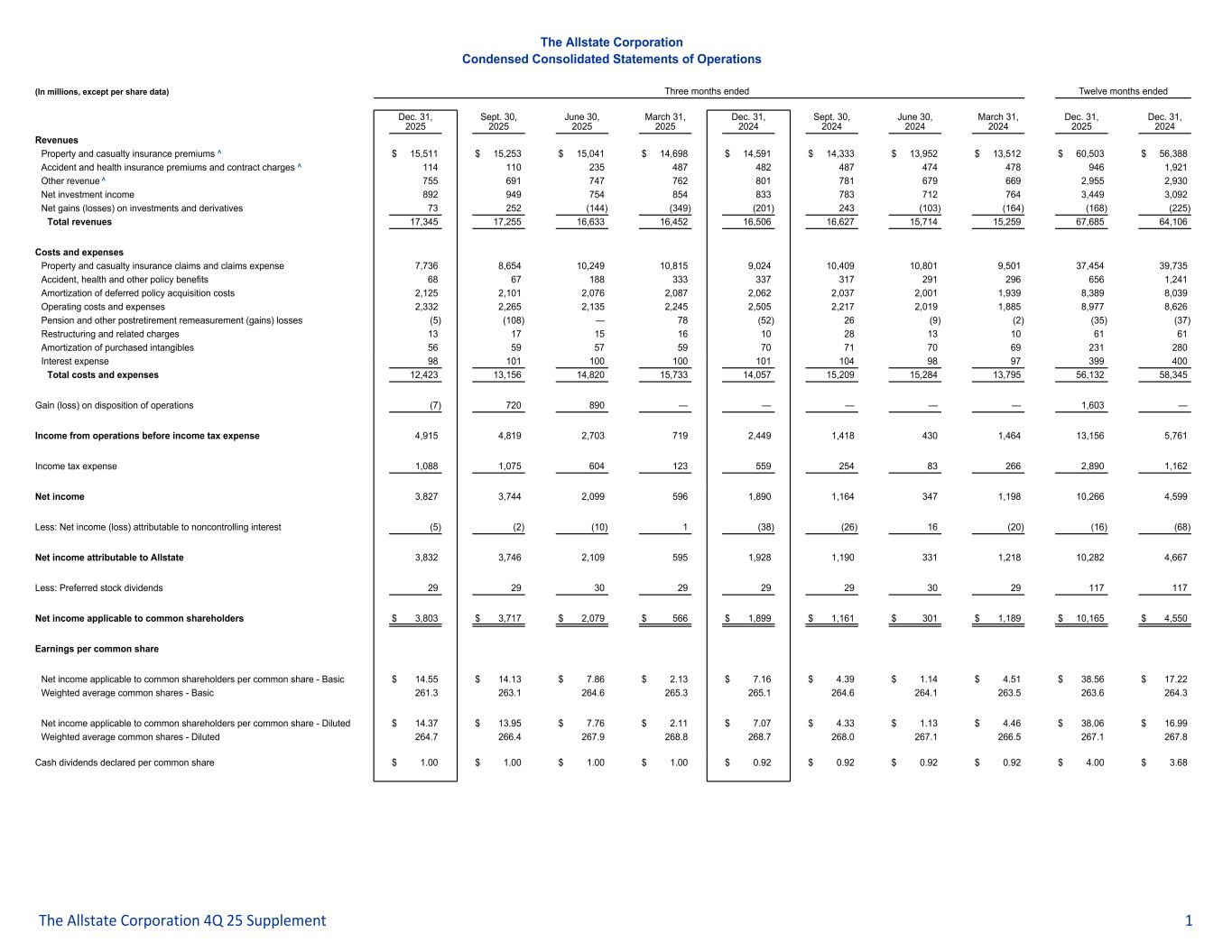 The Allstate Corporation Condensed Consolidated Statements of Operations (In millions, except per share data) Three months ended Twelve months ended Dec. 31, 2025 Sept. 30, 2025 June 30, 2025 March 31, 2025 Dec. 31, 2024 Sept. 30, 2024 June 30, 2024 March 31, 2024 Dec. 31, 2025 Dec. 31, 2024 Revenues Property and casualty insurance premiums ^ $ 15,511 $ 15,253 $ 15,041 $ 14,698 $ 14,591 $ 14,333 $ 13,952 $ 13,512 $ 60,503 $ 56,388 Accident and health insurance premiums and contract charges ^ 114 110 235 487 482 487 474 478 946 1,921 Other revenue ^ 755 691 747 762 801 781 679 669 2,955 2,930 Net investment income 892 949 754 854 833 783 712 764 3,449 3,092 Net gains (losses) on investments and derivatives 73 252 (144) (349) (201) 243 (103) (164) (168) (225) Total revenues 17,345 17,255 16,633 16,452 16,506 16,627 15,714 15,259 67,685 64,106 Costs and expenses Property and casualty insurance claims and claims expense 7,736 8,654 10,249 10,815 9,024 10,409 10,801 9,501 37,454 39,735 Accident, health and other policy benefits 68 67 188 333 337 317 291 296 656 1,241 Amortization of deferred policy acquisition costs 2,125 2,101 2,076 2,087 2,062 2,037 2,001 1,939 8,389 8,039 Operating costs and expenses 2,332 2,265 2,135 2,245 2,505 2,217 2,019 1,885 8,977 8,626 Pension and other postretirement remeasurement (gains) losses (5) (108) — 78 (52) 26 (9) (2) (35) (37) Restructuring and related charges 13 17 15 16 10 28 13 10 61 61 Amortization of purchased intangibles 56 59 57 59 70 71 70 69 231 280 Interest expense 98 101 100 100 101 104 98 97 399 400 Total costs and expenses 12,423 13,156 14,820 15,733 14,057 15,209 15,284 13,795 56,132 58,345 Gain (loss) on disposition of operations (7) 720 890 — — — — — 1,603 — Income from operations before income tax expense 4,915 4,819 2,703 719 2,449 1,418 430 1,464 13,156 5,761 Income tax expense 1,088 1,075 604 123 559 254 83 266 2,890 1,162 Net income 3,827 3,744 2,099 596 1,890 1,164 347 1,198 10,266 4,599 Less: Net income (loss) attributable to noncontrolling interest (5) (2) (10) 1 (38) (26) 16 (20) (16) (68) Net income attributable to Allstate 3,832 3,746 2,109 595 1,928 1,190 331 1,218 10,282 4,667 Less: Preferred stock dividends 29 29 30 29 29 29 30 29 117 117 Net income applicable to common shareholders $ 3,803 $ 3,717 $ 2,079 $ 566 $ 1,899 $ 1,161 $ 301 $ 1,189 $ 10,165 $ 4,550 Earnings per common share Net income applicable to common shareholders per common share - Basic $ 14.55 $ 14.13 $ 7.86 $ 2.13 $ 7.16 $ 4.39 $ 1.14 $ 4.51 $ 38.56 $ 17.22 Weighted average common shares - Basic 261.3 263.1 264.6 265.3 265.1 264.6 264.1 263.5 263.6 264.3 Net income applicable to common shareholders per common share - Diluted $ 14.37 $ 13.95 $ 7.76 $ 2.11 $ 7.07 $ 4.33 $ 1.13 $ 4.46 $ 38.06 $ 16.99 Weighted average common shares - Diluted 264.7 266.4 267.9 268.8 268.7 268.0 267.1 266.5 267.1 267.8 Cash dividends declared per common share $ 1.00 $ 1.00 $ 1.00 $ 1.00 $ 0.92 $ 0.92 $ 0.92 $ 0.92 $ 4.00 $ 3.68 The Allstate Corporation 4Q 25 Supplement 1