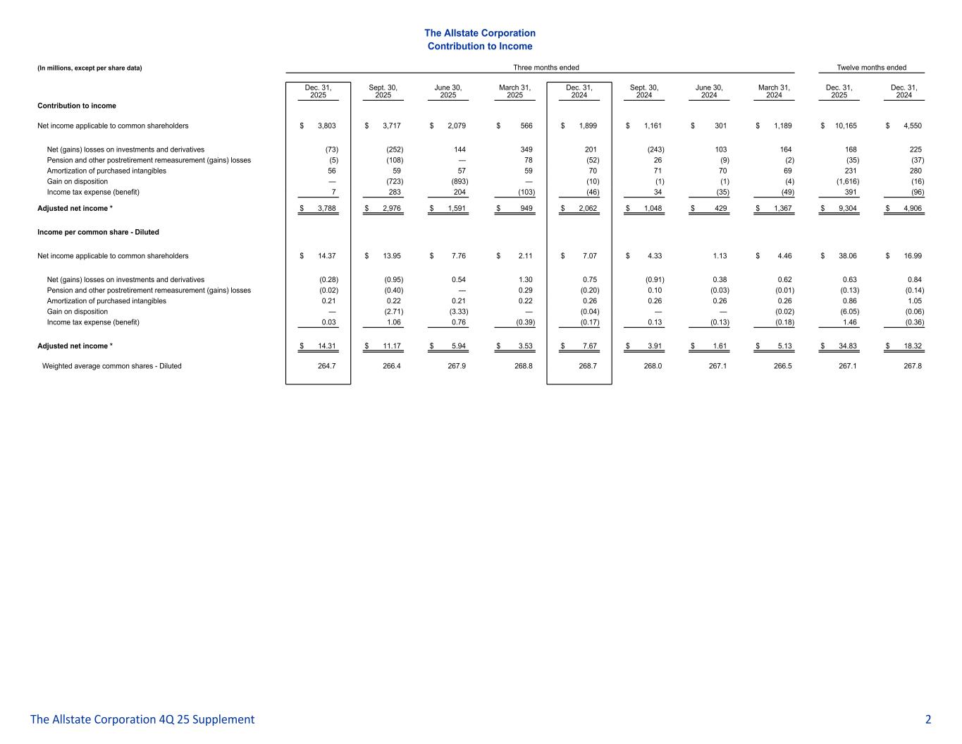 The Allstate Corporation Contribution to Income (In millions, except per share data) Three months ended Twelve months ended Dec. 31, 2025 Sept. 30, 2025 June 30, 2025 March 31, 2025 Dec. 31, 2024 Sept. 30, 2024 June 30, 2024 March 31, 2024 Dec. 31, 2025 Dec. 31, 2024 Contribution to income Net income applicable to common shareholders $ 3,803 $ 3,717 $ 2,079 $ 566 $ 1,899 $ 1,161 $ 301 $ 1,189 $ 10,165 $ 4,550 Net (gains) losses on investments and derivatives (73) (252) 144 349 201 (243) 103 164 168 225 Pension and other postretirement remeasurement (gains) losses (5) (108) — 78 (52) 26 (9) (2) (35) (37) Amortization of purchased intangibles 56 59 57 59 70 71 70 69 231 280 Gain on disposition — (723) (893) — (10) (1) (1) (4) (1,616) (16) Income tax expense (benefit) 7 283 204 (103) (46) 34 (35) (49) 391 (96) Adjusted net income * $ 3,788 $ 2,976 $ 1,591 $ 949 $ 2,062 $ 1,048 $ 429 $ 1,367 $ 9,304 $ 4,906 Income per common share - Diluted Net income applicable to common shareholders $ 14.37 $ 13.95 $ 7.76 $ 2.11 $ 7.07 $ 4.33 1.13 $ 4.46 $ 38.06 $ 16.99 Net (gains) losses on investments and derivatives (0.28) (0.95) 0.54 1.30 0.75 (0.91) 0.38 0.62 0.63 0.84 Pension and other postretirement remeasurement (gains) losses (0.02) (0.40) — 0.29 (0.20) 0.10 (0.03) (0.01) (0.13) (0.14) Amortization of purchased intangibles 0.21 0.22 0.21 0.22 0.26 0.26 0.26 0.26 0.86 1.05 Gain on disposition — (2.71) (3.33) — (0.04) — — (0.02) (6.05) (0.06) Income tax expense (benefit) 0.03 1.06 0.76 (0.39) (0.17) 0.13 (0.13) (0.18) 1.46 (0.36) Adjusted net income * $ 14.31 $ 11.17 $ 5.94 $ 3.53 $ 7.67 $ 3.91 $ 1.61 $ 5.13 $ 34.83 $ 18.32 Weighted average common shares - Diluted 264.7 266.4 267.9 268.8 268.7 268.0 267.1 266.5 267.1 267.8 The Allstate Corporation 4Q 25 Supplement 2