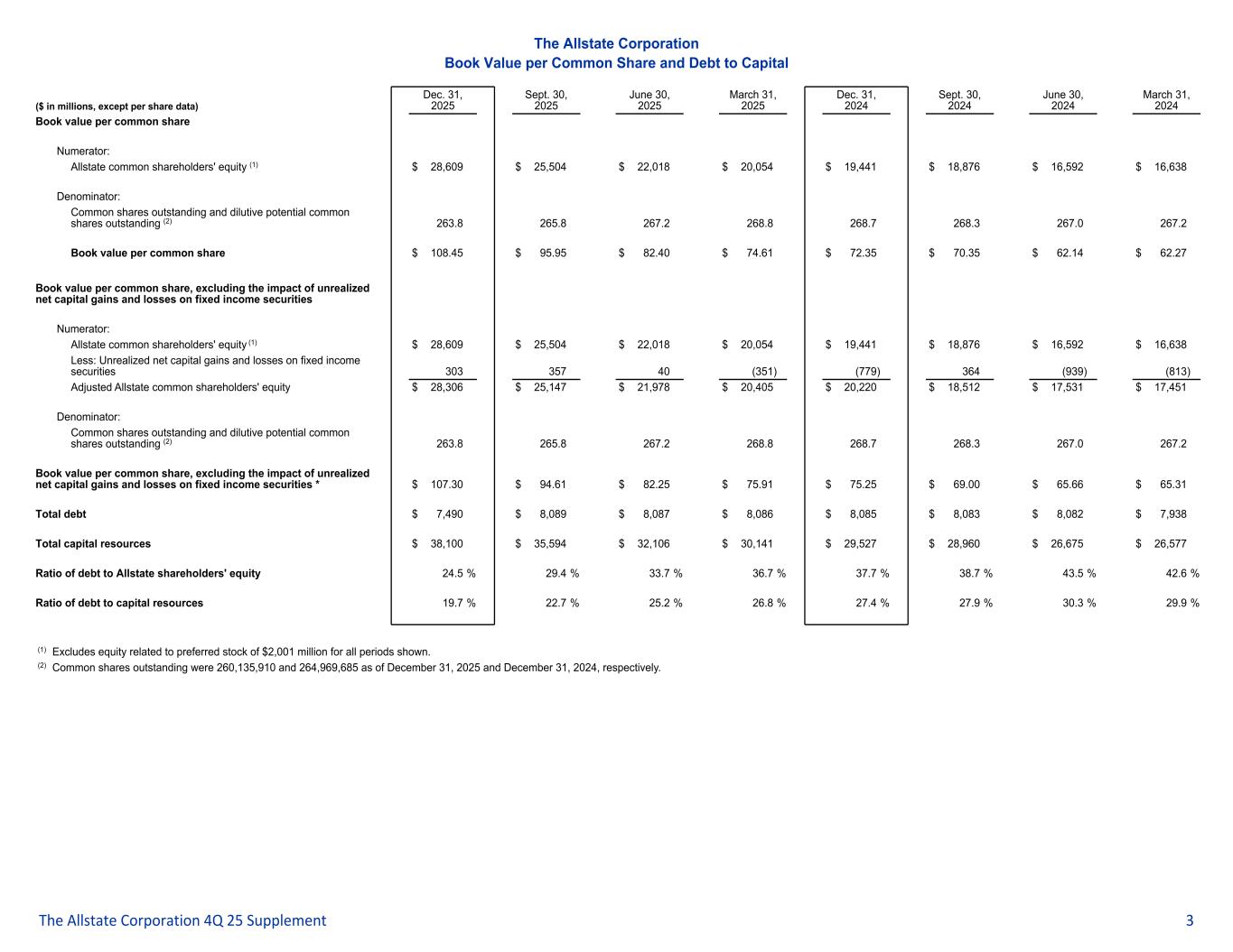 The Allstate Corporation Book Value per Common Share and Debt to Capital ($ in millions, except per share data) Dec. 31, 2025 Sept. 30, 2025 June 30, 2025 March 31, 2025 Dec. 31, 2024 Sept. 30, 2024 June 30, 2024 March 31, 2024 Book value per common share Numerator: Allstate common shareholders' equity (1) $ 28,609 $ 25,504 $ 22,018 $ 20,054 $ 19,441 $ 18,876 $ 16,592 $ 16,638 Denominator: Common shares outstanding and dilutive potential common shares outstanding (2) 263.8 265.8 267.2 268.8 268.7 268.3 267.0 267.2 Book value per common share $ 108.45 $ 95.95 $ 82.40 $ 74.61 $ 72.35 $ 70.35 $ 62.14 $ 62.27 Book value per common share, excluding the impact of unrealized net capital gains and losses on fixed income securities Numerator: Allstate common shareholders' equity (1) $ 28,609 $ 25,504 $ 22,018 $ 20,054 $ 19,441 $ 18,876 $ 16,592 $ 16,638 Less: Unrealized net capital gains and losses on fixed income securities 303 357 40 (351) (779) 364 (939) (813) Adjusted Allstate common shareholders' equity $ 28,306 $ 25,147 $ 21,978 $ 20,405 $ 20,220 $ 18,512 $ 17,531 $ 17,451 Denominator: Common shares outstanding and dilutive potential common shares outstanding (2) 263.8 265.8 267.2 268.8 268.7 268.3 267.0 267.2 Book value per common share, excluding the impact of unrealized net capital gains and losses on fixed income securities * $ 107.30 $ 94.61 $ 82.25 $ 75.91 $ 75.25 $ 69.00 $ 65.66 $ 65.31 Total debt $ 7,490 $ 8,089 $ 8,087 $ 8,086 $ 8,085 $ 8,083 $ 8,082 $ 7,938 Total capital resources $ 38,100 $ 35,594 $ 32,106 $ 30,141 $ 29,527 $ 28,960 $ 26,675 $ 26,577 Ratio of debt to Allstate shareholders' equity 24.5 % 29.4 % 33.7 % 36.7 % 37.7 % 38.7 % 43.5 % 42.6 % Ratio of debt to capital resources 19.7 % 22.7 % 25.2 % 26.8 % 27.4 % 27.9 % 30.3 % 29.9 % (1) Excludes equity related to preferred stock of $2,001 million for all periods shown. (2) Common shares outstanding were 260,135,910 and 264,969,685 as of December 31, 2025 and December 31, 2024, respectively. The Allstate Corporation 4Q 25 Supplement 3
