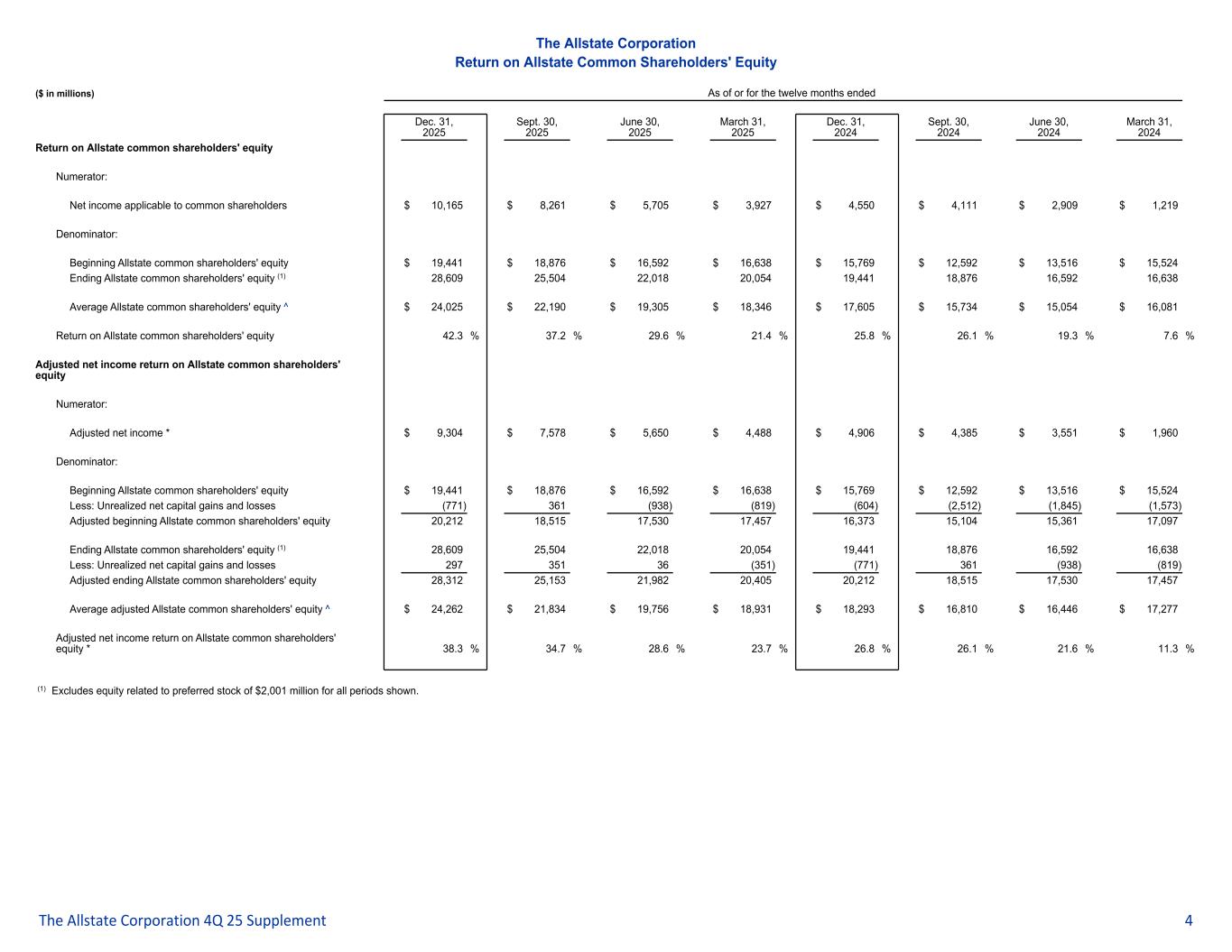 The Allstate Corporation Return on Allstate Common Shareholders' Equity ($ in millions) As of or for the twelve months ended Dec. 31, 2025 Sept. 30, 2025 June 30, 2025 March 31, 2025 Dec. 31, 2024 Sept. 30, 2024 June 30, 2024 March 31, 2024 Return on Allstate common shareholders' equity Numerator: Net income applicable to common shareholders $ 10,165 $ 8,261 $ 5,705 $ 3,927 $ 4,550 $ 4,111 $ 2,909 $ 1,219 Denominator: Beginning Allstate common shareholders' equity $ 19,441 $ 18,876 $ 16,592 $ 16,638 $ 15,769 $ 12,592 $ 13,516 $ 15,524 Ending Allstate common shareholders' equity (1) 28,609 25,504 22,018 20,054 19,441 18,876 16,592 16,638 Average Allstate common shareholders' equity ^ $ 24,025 $ 22,190 $ 19,305 $ 18,346 $ 17,605 $ 15,734 $ 15,054 $ 16,081 Return on Allstate common shareholders' equity 42.3 % 37.2 % 29.6 % 21.4 % 25.8 % 26.1 % 19.3 % 7.6 % Adjusted net income return on Allstate common shareholders' equity Numerator: Adjusted net income * $ 9,304 $ 7,578 $ 5,650 $ 4,488 $ 4,906 $ 4,385 $ 3,551 $ 1,960 Denominator: Beginning Allstate common shareholders' equity $ 19,441 $ 18,876 $ 16,592 $ 16,638 $ 15,769 $ 12,592 $ 13,516 $ 15,524 Less: Unrealized net capital gains and losses (771) 361 (938) (819) (604) (2,512) (1,845) (1,573) Adjusted beginning Allstate common shareholders' equity 20,212 18,515 17,530 17,457 16,373 15,104 15,361 17,097 Ending Allstate common shareholders' equity (1) 28,609 25,504 22,018 20,054 19,441 18,876 16,592 16,638 Less: Unrealized net capital gains and losses 297 351 36 (351) (771) 361 (938) (819) Adjusted ending Allstate common shareholders' equity 28,312 25,153 21,982 20,405 20,212 18,515 17,530 17,457 Average adjusted Allstate common shareholders' equity ^ $ 24,262 $ 21,834 $ 19,756 $ 18,931 $ 18,293 $ 16,810 $ 16,446 $ 17,277 Adjusted net income return on Allstate common shareholders' equity * 38.3 % 34.7 % 28.6 % 23.7 % 26.8 % 26.1 % 21.6 % 11.3 % (1) Excludes equity related to preferred stock of $2,001 million for all periods shown. The Allstate Corporation 4Q 25 Supplement 4