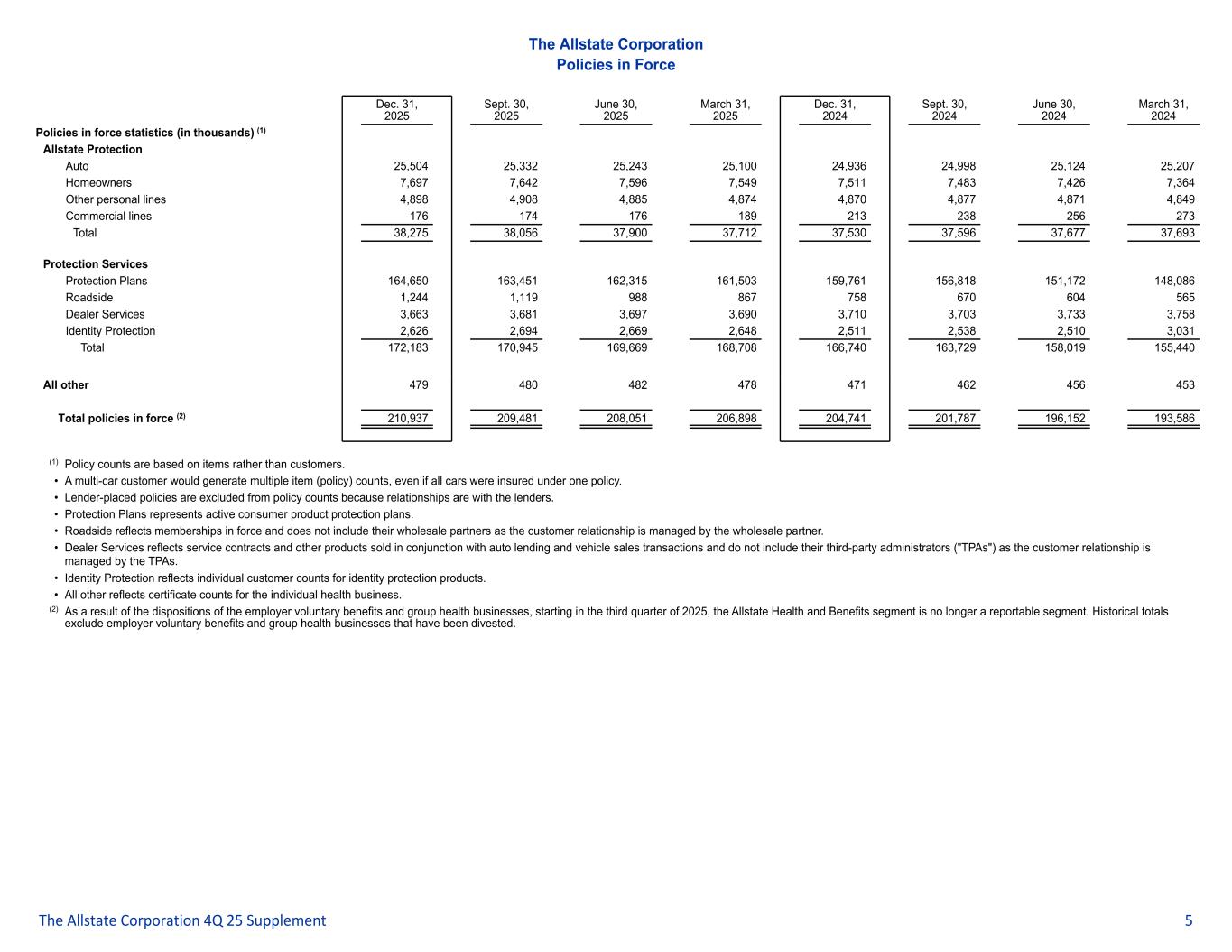The Allstate Corporation Policies in Force Dec. 31, 2025 Sept. 30, 2025 June 30, 2025 March 31, 2025 Dec. 31, 2024 Sept. 30, 2024 June 30, 2024 March 31, 2024 Policies in force statistics (in thousands) (1) Allstate Protection Auto 25,504 25,332 25,243 25,100 24,936 24,998 25,124 25,207 Homeowners 7,697 7,642 7,596 7,549 7,511 7,483 7,426 7,364 Other personal lines 4,898 4,908 4,885 4,874 4,870 4,877 4,871 4,849 Commercial lines 176 174 176 189 213 238 256 273 Total 38,275 38,056 37,900 37,712 37,530 37,596 37,677 37,693 Protection Services Protection Plans 164,650 163,451 162,315 161,503 159,761 156,818 151,172 148,086 Roadside 1,244 1,119 988 867 758 670 604 565 Dealer Services 3,663 3,681 3,697 3,690 3,710 3,703 3,733 3,758 Identity Protection 2,626 2,694 2,669 2,648 2,511 2,538 2,510 3,031 Total 172,183 170,945 169,669 168,708 166,740 163,729 158,019 155,440 All other 479 480 482 478 471 462 456 453 Total policies in force (2) 210,937 209,481 208,051 206,898 204,741 201,787 196,152 193,586 (1) Policy counts are based on items rather than customers. • A multi-car customer would generate multiple item (policy) counts, even if all cars were insured under one policy. • Lender-placed policies are excluded from policy counts because relationships are with the lenders. • Protection Plans represents active consumer product protection plans. • Roadside reflects memberships in force and does not include their wholesale partners as the customer relationship is managed by the wholesale partner. • Dealer Services reflects service contracts and other products sold in conjunction with auto lending and vehicle sales transactions and do not include their third-party administrators ("TPAs") as the customer relationship is managed by the TPAs. • Identity Protection reflects individual customer counts for identity protection products. • All other reflects certificate counts for the individual health business. (2) As a result of the dispositions of the employer voluntary benefits and group health businesses, starting in the third quarter of 2025, the Allstate Health and Benefits segment is no longer a reportable segment. Historical totals exclude employer voluntary benefits and group health businesses that have been divested. The Allstate Corporation 4Q 25 Supplement 5