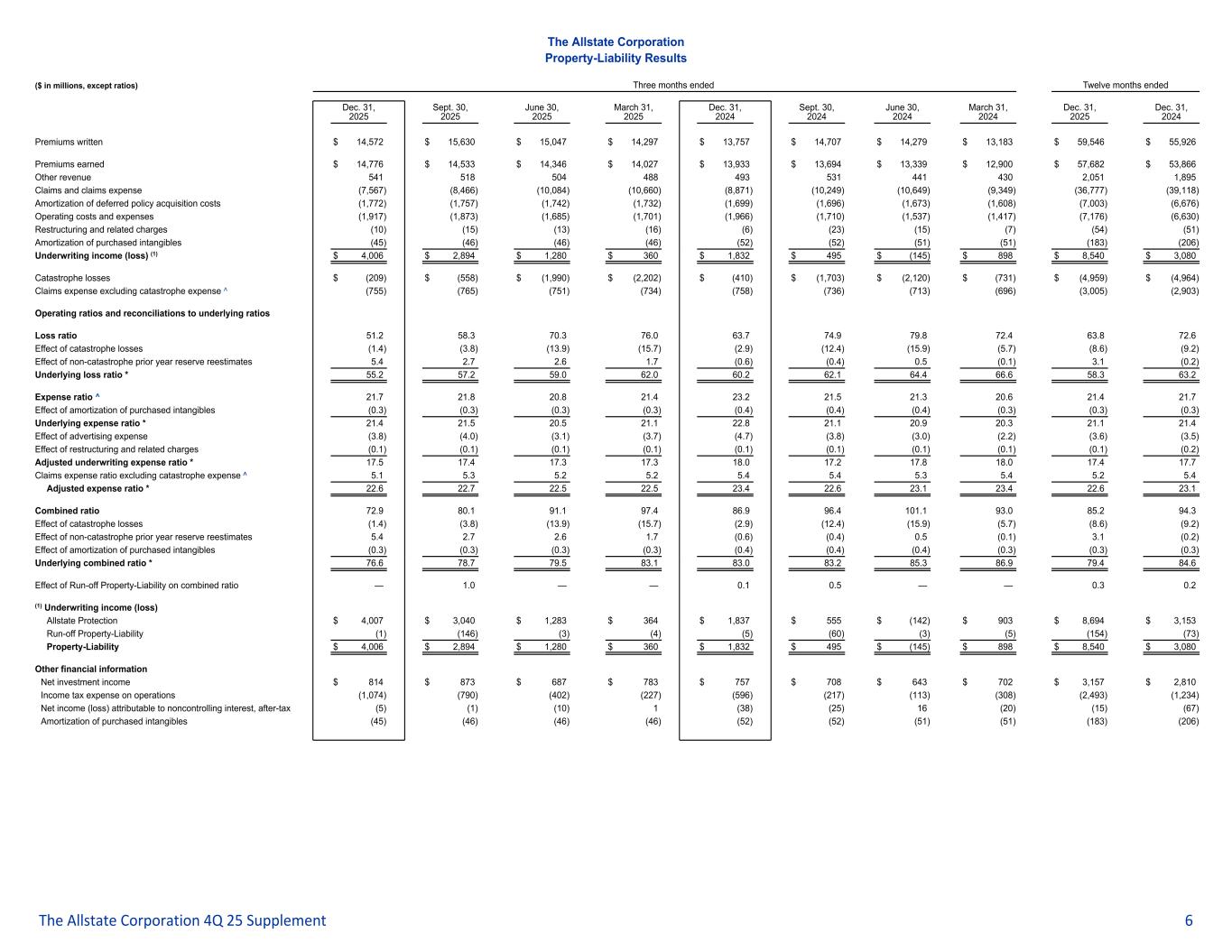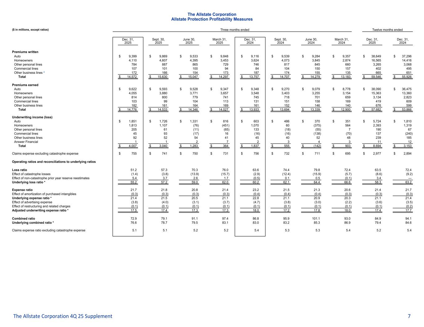 The Allstate Corporation Property-Liability Results ($ in millions, except ratios) Three months ended Twelve months ended Dec. 31, 2025 Sept. 30, 2025 June 30, 2025 March 31, 2025 Dec. 31, 2024 Sept. 30, 2024 June 30, 2024 March 31, 2024 Dec. 31, 2025 Dec. 31, 2024 Premiums written $ 14,572 $ 15,630 $ 15,047 $ 14,297 $ 13,757 $ 14,707 $ 14,279 $ 13,183 $ 59,546 $ 55,926 Premiums earned $ 14,776 $ 14,533 $ 14,346 $ 14,027 $ 13,933 $ 13,694 $ 13,339 $ 12,900 $ 57,682 $ 53,866 Other revenue 541 518 504 488 493 531 441 430 2,051 1,895 Claims and claims expense (7,567) (8,466) (10,084) (10,660) (8,871) (10,249) (10,649) (9,349) (36,777) (39,118) Amortization of deferred policy acquisition costs (1,772) (1,757) (1,742) (1,732) (1,699) (1,696) (1,673) (1,608) (7,003) (6,676) Operating costs and expenses (1,917) (1,873) (1,685) (1,701) (1,966) (1,710) (1,537) (1,417) (7,176) (6,630) Restructuring and related charges (10) (15) (13) (16) (6) (23) (15) (7) (54) (51) Amortization of purchased intangibles (45) (46) (46) (46) (52) (52) (51) (51) (183) (206) Underwriting income (loss) (1) $ 4,006 $ 2,894 $ 1,280 $ 360 $ 1,832 $ 495 $ (145) $ 898 $ 8,540 $ 3,080 Catastrophe losses $ (209) $ (558) $ (1,990) $ (2,202) $ (410) $ (1,703) $ (2,120) $ (731) $ (4,959) $ (4,964) Claims expense excluding catastrophe expense ^ (755) (765) (751) (734) (758) (736) (713) (696) (3,005) (2,903) Operating ratios and reconciliations to underlying ratios Loss ratio 51.2 58.3 70.3 76.0 63.7 74.9 79.8 72.4 63.8 72.6 Effect of catastrophe losses (1.4) (3.8) (13.9) (15.7) (2.9) (12.4) (15.9) (5.7) (8.6) (9.2) Effect of non-catastrophe prior year reserve reestimates 5.4 2.7 2.6 1.7 (0.6) (0.4) 0.5 (0.1) 3.1 (0.2) Underlying loss ratio * 55.2 57.2 59.0 62.0 60.2 62.1 64.4 66.6 58.3 63.2 Expense ratio ^ 21.7 21.8 20.8 21.4 23.2 21.5 21.3 20.6 21.4 21.7 Effect of amortization of purchased intangibles (0.3) (0.3) (0.3) (0.3) (0.4) (0.4) (0.4) (0.3) (0.3) (0.3) Underlying expense ratio * 21.4 21.5 20.5 21.1 22.8 21.1 20.9 20.3 21.1 21.4 Effect of advertising expense (3.8) (4.0) (3.1) (3.7) (4.7) (3.8) (3.0) (2.2) (3.6) (3.5) Effect of restructuring and related charges (0.1) (0.1) (0.1) (0.1) (0.1) (0.1) (0.1) (0.1) (0.1) (0.2) Adjusted underwriting expense ratio * 17.5 17.4 17.3 17.3 18.0 17.2 17.8 18.0 17.4 17.7 Claims expense ratio excluding catastrophe expense ^ 5.1 5.3 5.2 5.2 5.4 5.4 5.3 5.4 5.2 5.4 Adjusted expense ratio * 22.6 22.7 22.5 22.5 23.4 22.6 23.1 23.4 22.6 23.1 Combined ratio 72.9 80.1 91.1 97.4 86.9 96.4 101.1 93.0 85.2 94.3 Effect of catastrophe losses (1.4) (3.8) (13.9) (15.7) (2.9) (12.4) (15.9) (5.7) (8.6) (9.2) Effect of non-catastrophe prior year reserve reestimates 5.4 2.7 2.6 1.7 (0.6) (0.4) 0.5 (0.1) 3.1 (0.2) Effect of amortization of purchased intangibles (0.3) (0.3) (0.3) (0.3) (0.4) (0.4) (0.4) (0.3) (0.3) (0.3) Underlying combined ratio * 76.6 78.7 79.5 83.1 83.0 83.2 85.3 86.9 79.4 84.6 Effect of Run-off Property-Liability on combined ratio — 1.0 — — 0.1 0.5 — — 0.3 0.2 (1) Underwriting income (loss) Allstate Protection $ 4,007 $ 3,040 $ 1,283 $ 364 $ 1,837 $ 555 $ (142) $ 903 $ 8,694 $ 3,153 Run-off Property-Liability (1) (146) (3) (4) (5) (60) (3) (5) (154) (73) Property-Liability $ 4,006 $ 2,894 $ 1,280 $ 360 $ 1,832 $ 495 $ (145) $ 898 $ 8,540 $ 3,080 Other financial information Net investment income $ 814 $ 873 $ 687 $ 783 $ 757 $ 708 $ 643 $ 702 $ 3,157 $ 2,810 Income tax expense on operations (1,074) (790) (402) (227) (596) (217) (113) (308) (2,493) (1,234) Net income (loss) attributable to noncontrolling interest, after-tax (5) (1) (10) 1 (38) (25) 16 (20) (15) (67) Amortization of purchased intangibles (45) (46) (46) (46) (52) (52) (51) (51) (183) (206) The Allstate Corporation 4Q 25 Supplement 6