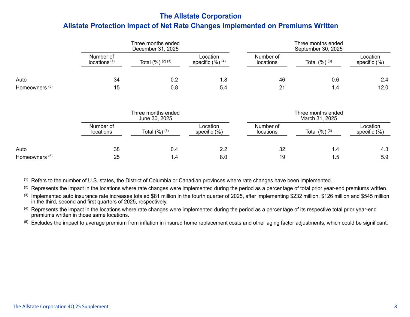 The Allstate Corporation Allstate Protection Profitability Measures ($ in millions, except ratios) Three months ended Twelve months ended Dec. 31, 2025 Sept. 30, 2025 June 30, 2025 March 31, 2025 Dec. 31, 2024 Sept. 30, 2024 June 30, 2024 March 31, 2024 Dec. 31, 2025 Dec. 31, 2024 Premiums written Auto $ 9,399 $ 9,869 $ 9,533 $ 9,848 $ 9,116 $ 9,539 $ 9,284 $ 9,357 $ 38,649 $ 37,296 Homeowners 4,110 4,607 4,395 3,453 3,624 4,073 3,845 2,874 16,565 14,416 Other personal lines 784 887 865 729 746 817 845 660 3,265 3,068 Commercial lines 107 101 100 94 84 104 150 157 402 495 Other business lines ^ 172 166 154 173 187 174 155 135 665 651 Total $ 14,572 $ 15,630 $ 15,047 $ 14,297 $ 13,757 $ 14,707 $ 14,279 $ 13,183 $ 59,546 $ 55,926 Premiums earned Auto $ 9,622 $ 9,593 $ 9,528 $ 9,347 $ 9,348 $ 9,270 $ 9,079 $ 8,778 $ 38,090 $ 36,475 Homeowners 4,055 3,880 3,771 3,657 3,548 3,403 3,255 3,154 15,363 13,360 Other personal lines 814 800 779 741 745 718 701 659 3,134 2,823 Commercial lines 103 99 104 113 131 151 158 169 419 609 Other business lines 182 161 164 169 161 152 146 140 676 599 Total $ 14,776 $ 14,533 $ 14,346 $ 14,027 $ 13,933 $ 13,694 $ 13,339 $ 12,900 $ 57,682 $ 53,866 Underwriting income (loss) Auto $ 1,851 $ 1,726 $ 1,331 $ 816 $ 603 $ 486 $ 370 $ 351 $ 5,724 $ 1,810 Homeowners 1,813 1,107 (76) (451) 1,070 60 (375) 564 2,393 1,319 Other personal lines 205 61 (11) (65) 133 (18) (55) 7 190 67 Commercial lines 45 93 (17) 16 (16) (16) (138) (70) 137 (240) Other business lines 92 52 54 41 45 40 52 48 239 185 Answer Financial 1 1 2 7 2 3 4 3 11 12 Total $ 4,007 $ 3,040 $ 1,283 $ 364 $ 1,837 $ 555 $ (142) $ 903 $ 8,694 $ 3,153 Claims expense excluding catastrophe expense $ 755 $ 741 $ 750 $ 731 $ 756 $ 732 $ 711 $ 695 $ 2,977 $ 2,894 Operating ratios and reconciliations to underlying ratios Loss ratio 51.2 57.3 70.3 76.0 63.6 74.4 79.8 72.4 63.5 72.4 Effect of catastrophe losses (1.4) (3.8) (13.9) (15.7) (2.9) (12.4) (15.9) (5.7) (8.6) (9.2) Effect of non-catastrophe prior year reserve reestimates 5.4 3.7 2.6 1.7 (0.5) 0.1 0.5 (0.1) 3.4 — Underlying loss ratio * 55.2 57.2 59.0 62.0 60.2 62.1 64.4 66.6 58.3 63.2 Expense ratio 21.7 21.8 20.8 21.4 23.2 21.5 21.3 20.6 21.4 21.7 Effect of amortization of purchased intangibles (0.3) (0.3) (0.3) (0.3) (0.4) (0.4) (0.4) (0.3) (0.3) (0.3) Underlying expense ratio * 21.4 21.5 20.5 21.1 22.8 21.1 20.9 20.3 21.1 21.4 Effect of advertising expense (3.8) (4.0) (3.1) (3.7) (4.7) (3.8) (3.0) (2.2) (3.6) (3.5) Effect of restructuring and related charges (0.1) (0.1) (0.1) (0.1) (0.1) (0.1) (0.1) (0.1) (0.1) (0.2) Adjusted underwriting expense ratio * 17.5 17.4 17.3 17.3 18.0 17.2 17.8 18.0 17.4 17.7 Combined ratio 72.9 79.1 91.1 97.4 86.8 95.9 101.1 93.0 84.9 94.1 Underlying combined ratio * 76.6 78.7 79.5 83.1 83.0 83.2 85.3 86.9 79.4 84.6 Claims expense ratio excluding catastrophe expense 5.1 5.1 5.2 5.2 5.4 5.3 5.3 5.4 5.2 5.4 The Allstate Corporation 4Q 25 Supplement 7