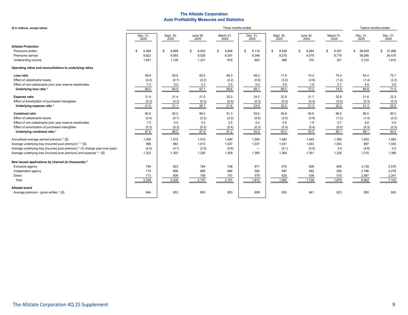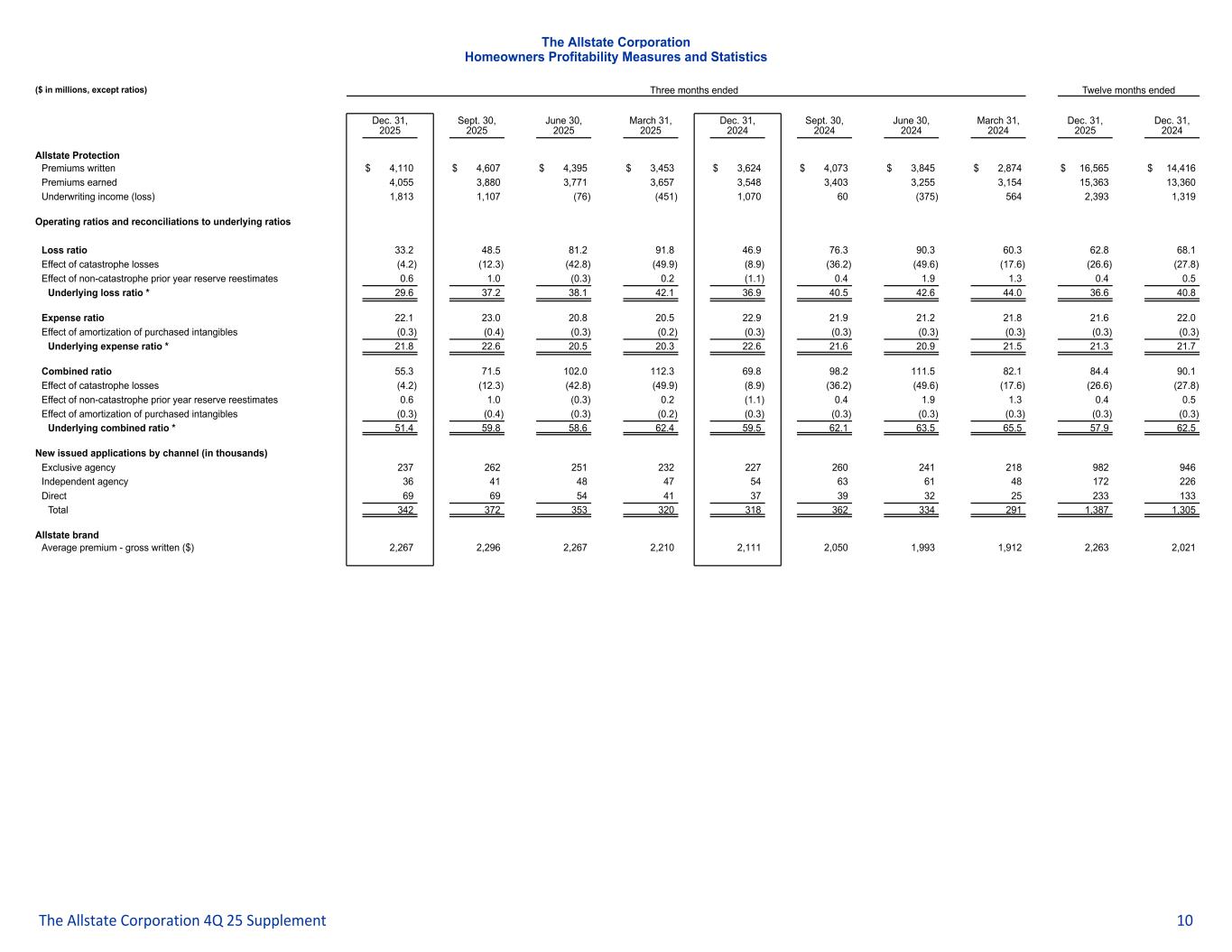 The Allstate Corporation Auto Profitability Measures and Statistics ($ in millions, except ratios) Three months ended Twelve months ended Dec. 31, 2025 Sept. 30, 2025 June 30, 2025 March 31, 2025 Dec. 31, 2024 Sept. 30, 2024 June 30, 2024 March 31, 2024 Dec. 31, 2025 Dec. 31, 2024 Allstate Protection Premiums written $ 9,399 $ 9,869 $ 9,533 $ 9,848 $ 9,116 $ 9,539 $ 9,284 $ 9,357 $ 38,649 $ 37,296 Premiums earned 9,622 9,593 9,528 9,347 9,348 9,270 9,079 8,778 38,090 36,475 Underwriting income 1,851 1,726 1,331 816 603 486 370 351 5,724 1,810 Operating ratios and reconciliations to underlying ratios Loss ratio 58.9 60.6 65.0 69.3 69.3 71.9 74.2 75.4 63.4 72.7 Effect of catastrophe losses (0.4) (0.7) (2.2) (2.2) (0.6) (3.0) (3.9) (1.2) (1.4) (2.2) Effect of non-catastrophe prior year reserve reestimates 7.5 5.0 4.3 2.5 0.4 0.6 1.9 0.7 4.8 0.9 Underlying loss ratio * 66.0 64.9 67.1 69.6 69.1 69.5 72.2 74.9 66.8 71.4 Expense ratio 21.9 21.4 21.0 22.0 24.2 22.9 21.7 20.6 21.6 22.3 Effect of amortization of purchased intangibles (0.3) (0.3) (0.3) (0.4) (0.3) (0.4) (0.4) (0.4) (0.3) (0.3) Underlying expense ratio * 21.6 21.1 20.7 21.6 23.9 22.5 21.3 20.2 21.3 22.0 Combined ratio 80.8 82.0 86.0 91.3 93.5 94.8 95.9 96.0 85.0 95.0 Effect of catastrophe losses (0.4) (0.7) (2.2) (2.2) (0.6) (3.0) (3.9) (1.2) (1.4) (2.2) Effect of non-catastrophe prior year reserve reestimates 7.5 5.0 4.3 2.5 0.4 0.6 1.9 0.7 4.8 0.9 Effect of amortization of purchased intangibles (0.3) (0.3) (0.3) (0.4) (0.3) (0.4) (0.4) (0.4) (0.3) (0.3) Underlying combined ratio * 87.6 86.0 87.8 91.2 93.0 92.0 93.5 95.1 88.1 93.4 Annualized average earned premium ^ ($) 1,509 1,515 1,510 1,490 1,500 1,483 1,445 1,393 1,493 1,463 Average underlying loss (incurred pure premium) * ^ ($) 996 983 1,013 1,037 1,037 1,031 1,043 1,043 997 1,045 Average underlying loss (incurred pure premium) * (% change year-over-year) (4.0) (4.7) (2.9) (0.6) — (0.1) (0.5) 3.4 (4.6) 0.5 Average underlying loss (incurred pure premium) and expense * ^ ($) 1,322 1,303 1,326 1,359 1,395 1,364 1,351 1,325 1,315 1,366 New issued applications by channel (in thousands) ^ Exclusive agency 794 823 764 748 671 675 628 605 3,129 2,579 Independent agency 719 696 685 686 562 597 562 555 2,786 2,276 Direct 713 809 708 757 579 620 538 510 2,987 2,247 Total 2,226 2,328 2,157 2,191 1,812 1,892 1,728 1,670 8,902 7,102 Allstate brand Average premium - gross written ^ ($) 844 853 850 853 858 852 841 823 850 843 The Allstate Corporation 4Q 25 Supplement 9