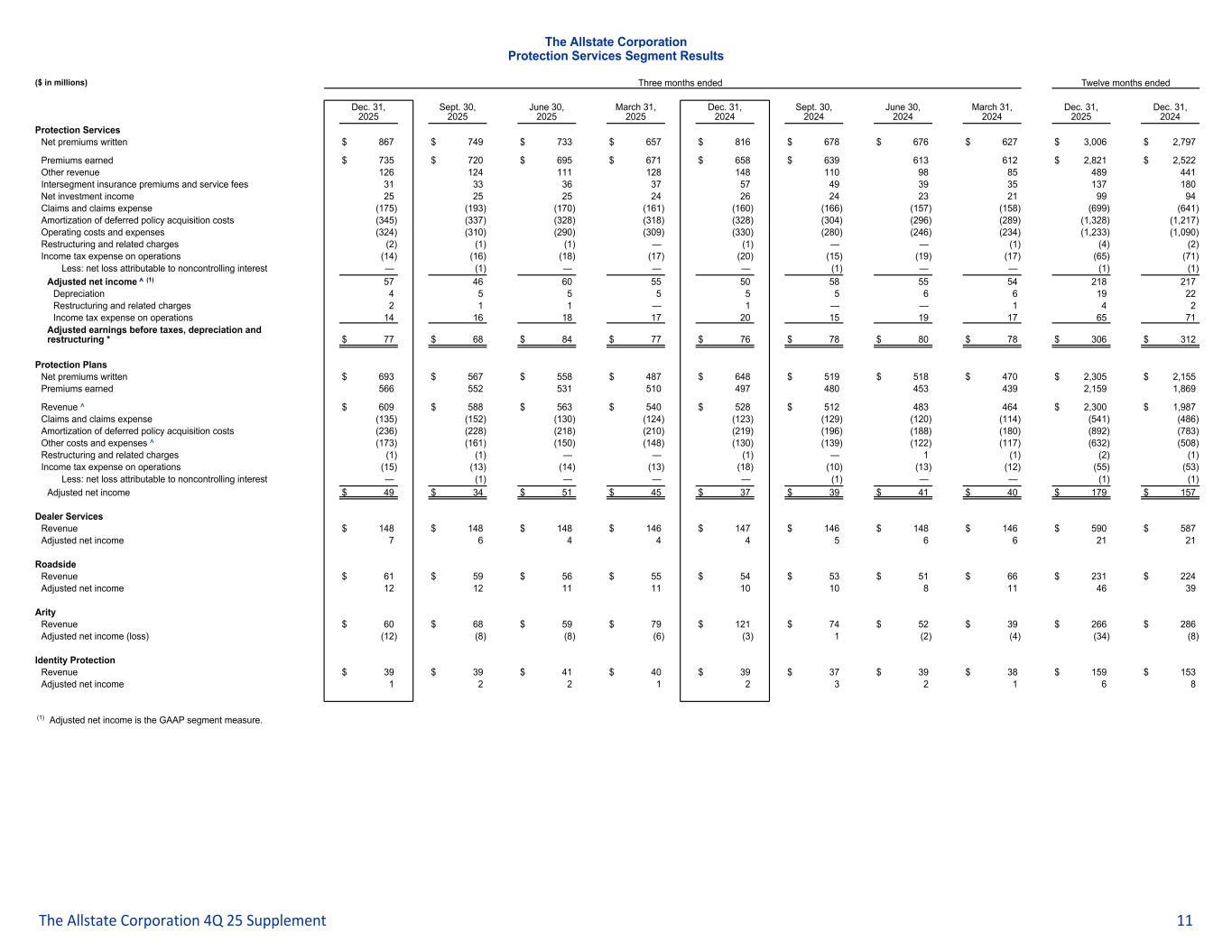 The Allstate Corporation Protection Services Segment Results ($ in millions) Three months ended Twelve months ended Dec. 31, 2025 Sept. 30, 2025 June 30, 2025 March 31, 2025 Dec. 31, 2024 Sept. 30, 2024 June 30, 2024 March 31, 2024 Dec. 31, 2025 Dec. 31, 2024 Protection Services Net premiums written $ 867 $ 749 $ 733 $ 657 $ 816 $ 678 $ 676 $ 627 $ 3,006 $ 2,797 Premiums earned $ 735 $ 720 $ 695 $ 671 $ 658 $ 639 613 612 $ 2,821 $ 2,522 Other revenue 126 124 111 128 148 110 98 85 489 441 Intersegment insurance premiums and service fees 31 33 36 37 57 49 39 35 137 180 Net investment income 25 25 25 24 26 24 23 21 99 94 Claims and claims expense (175) (193) (170) (161) (160) (166) (157) (158) (699) (641) Amortization of deferred policy acquisition costs (345) (337) (328) (318) (328) (304) (296) (289) (1,328) (1,217) Operating costs and expenses (324) (310) (290) (309) (330) (280) (246) (234) (1,233) (1,090) Restructuring and related charges (2) (1) (1) — (1) — — (1) (4) (2) Income tax expense on operations (14) (16) (18) (17) (20) (15) (19) (17) (65) (71) Less: net loss attributable to noncontrolling interest — (1) — — — (1) — — (1) (1) Adjusted net income ^ (1) 57 46 60 55 50 58 55 54 218 217 Depreciation 4 5 5 5 5 5 6 6 19 22 Restructuring and related charges 2 1 1 — 1 — — 1 4 2 Income tax expense on operations 14 16 18 17 20 15 19 17 65 71 Adjusted earnings before taxes, depreciation and restructuring * $ 77 $ 68 $ 84 $ 77 $ 76 $ 78 $ 80 $ 78 $ 306 $ 312 Protection Plans Net premiums written $ 693 $ 567 $ 558 $ 487 $ 648 $ 519 $ 518 $ 470 $ 2,305 $ 2,155 Premiums earned 566 552 531 510 497 480 453 439 2,159 1,869 Revenue ^ $ 609 $ 588 $ 563 $ 540 $ 528 $ 512 483 464 $ 2,300 $ 1,987 Claims and claims expense (135) (152) (130) (124) (123) (129) (120) (114) (541) (486) Amortization of deferred policy acquisition costs (236) (228) (218) (210) (219) (196) (188) (180) (892) (783) Other costs and expenses ^ (173) (161) (150) (148) (130) (139) (122) (117) (632) (508) Restructuring and related charges (1) (1) — — (1) — 1 (1) (2) (1) Income tax expense on operations (15) (13) (14) (13) (18) (10) (13) (12) (55) (53) Less: net loss attributable to noncontrolling interest — (1) — — — (1) — — (1) (1) Adjusted net income $ 49 $ 34 $ 51 $ 45 $ 37 $ 39 $ 41 $ 40 $ 179 $ 157 Dealer Services Revenue $ 148 $ 148 $ 148 $ 146 $ 147 $ 146 $ 148 $ 146 $ 590 $ 587 Adjusted net income 7 6 4 4 4 5 6 6 21 21 Roadside Revenue $ 61 $ 59 $ 56 $ 55 $ 54 $ 53 $ 51 $ 66 $ 231 $ 224 Adjusted net income 12 12 11 11 10 10 8 11 46 39 Arity Revenue $ 60 $ 68 $ 59 $ 79 $ 121 $ 74 $ 52 $ 39 $ 266 $ 286 Adjusted net income (loss) (12) (8) (8) (6) (3) 1 (2) (4) (34) (8) Identity Protection Revenue $ 39 $ 39 $ 41 $ 40 $ 39 $ 37 $ 39 $ 38 $ 159 $ 153 Adjusted net income 1 2 2 1 2 3 2 1 6 8 (1) Adjusted net income is the GAAP segment measure. The Allstate Corporation 4Q 25 Supplement 11