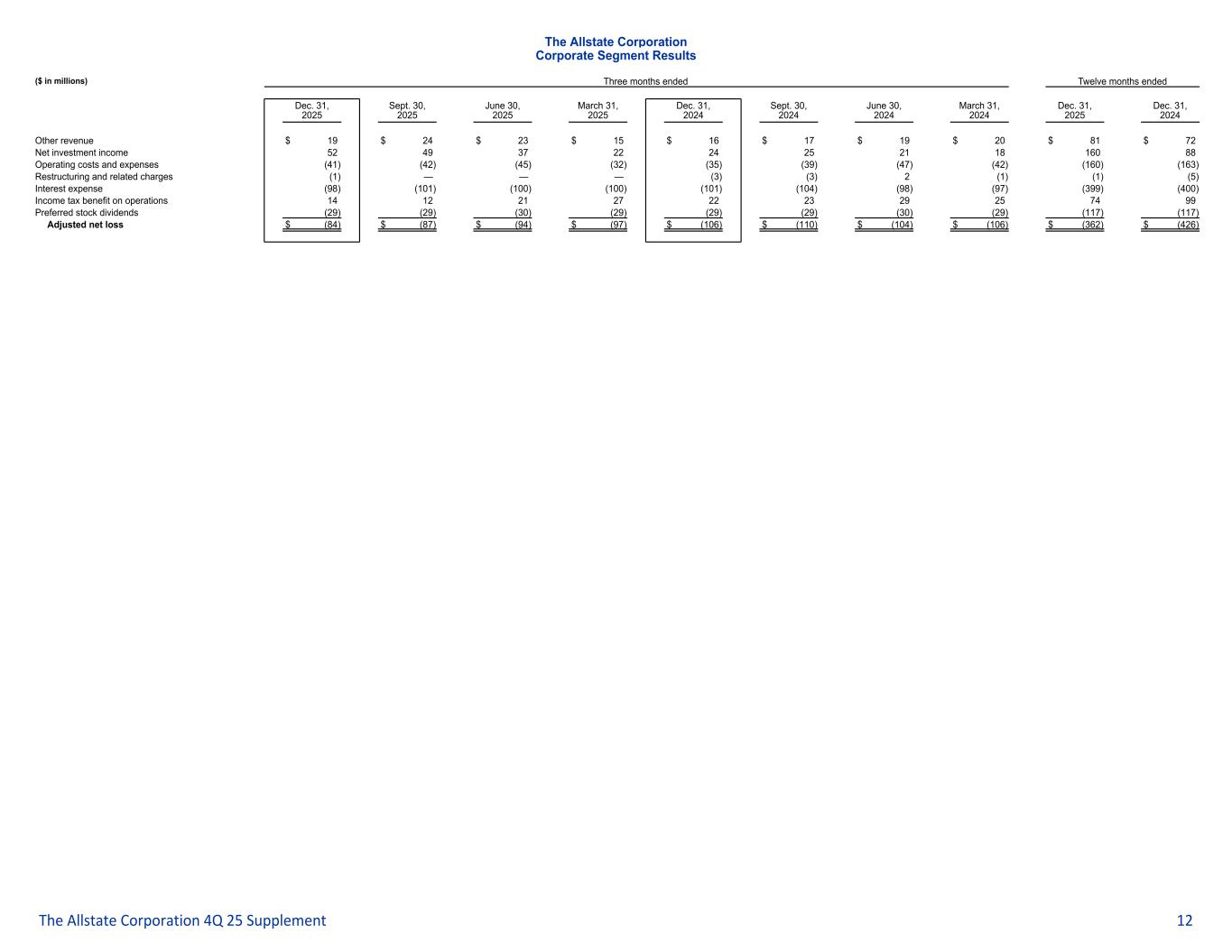 The Allstate Corporation Corporate Segment Results ($ in millions) Three months ended Twelve months ended Dec. 31, 2025 Sept. 30, 2025 June 30, 2025 March 31, 2025 Dec. 31, 2024 Sept. 30, 2024 June 30, 2024 March 31, 2024 Dec. 31, 2025 Dec. 31, 2024 Other revenue $ 19 $ 24 $ 23 $ 15 $ 16 $ 17 $ 19 $ 20 $ 81 $ 72 Net investment income 52 49 37 22 24 25 21 18 160 88 Operating costs and expenses (41) (42) (45) (32) (35) (39) (47) (42) (160) (163) Restructuring and related charges (1) — — — (3) (3) 2 (1) (1) (5) Interest expense (98) (101) (100) (100) (101) (104) (98) (97) (399) (400) Income tax benefit on operations 14 12 21 27 22 23 29 25 74 99 Preferred stock dividends (29) (29) (30) (29) (29) (29) (30) (29) (117) (117) Adjusted net loss $ (84) $ (87) $ (94) $ (97) $ (106) $ (110) $ (104) $ (106) $ (362) $ (426) The Allstate Corporation 4Q 25 Supplement 12