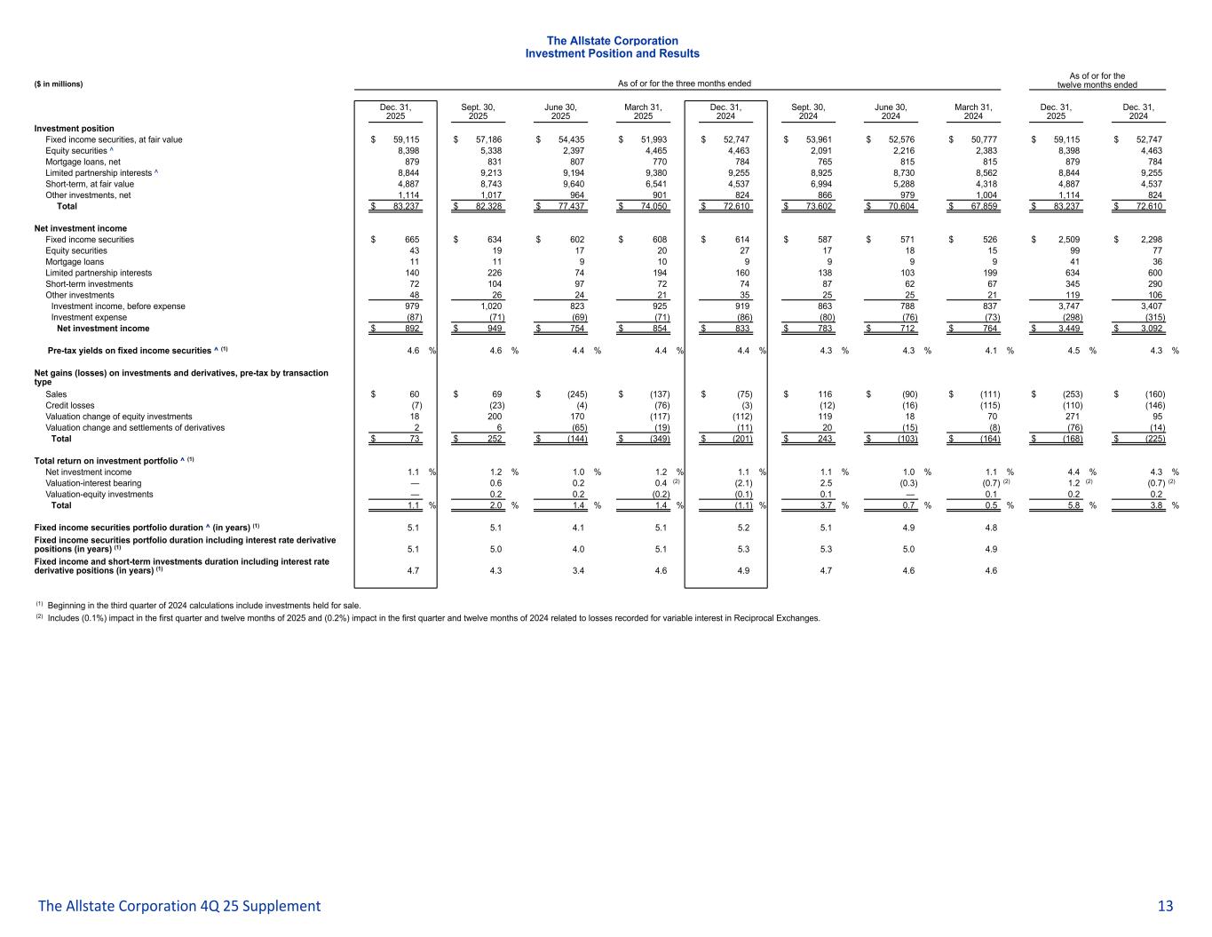 The Allstate Corporation Investment Position and Results ($ in millions) As of or for the three months ended As of or for the twelve months ended Dec. 31, 2025 Sept. 30, 2025 June 30, 2025 March 31, 2025 Dec. 31, 2024 Sept. 30, 2024 June 30, 2024 March 31, 2024 Dec. 31, 2025 Dec. 31, 2024 Investment position Fixed income securities, at fair value $ 59,115 $ 57,186 $ 54,435 $ 51,993 $ 52,747 $ 53,961 $ 52,576 $ 50,777 $ 59,115 $ 52,747 Equity securities ^ 8,398 5,338 2,397 4,465 4,463 2,091 2,216 2,383 8,398 4,463 Mortgage loans, net 879 831 807 770 784 765 815 815 879 784 Limited partnership interests ^ 8,844 9,213 9,194 9,380 9,255 8,925 8,730 8,562 8,844 9,255 Short-term, at fair value 4,887 8,743 9,640 6,541 4,537 6,994 5,288 4,318 4,887 4,537 Other investments, net 1,114 1,017 964 901 824 866 979 1,004 1,114 824 Total $ 83,237 $ 82,328 $ 77,437 $ 74,050 $ 72,610 $ 73,602 $ 70,604 $ 67,859 $ 83,237 $ 72,610 Net investment income Fixed income securities $ 665 $ 634 $ 602 $ 608 $ 614 $ 587 $ 571 $ 526 $ 2,509 $ 2,298 Equity securities 43 19 17 20 27 17 18 15 99 77 Mortgage loans 11 11 9 10 9 9 9 9 41 36 Limited partnership interests 140 226 74 194 160 138 103 199 634 600 Short-term investments 72 104 97 72 74 87 62 67 345 290 Other investments 48 26 24 21 35 25 25 21 119 106 Investment income, before expense 979 1,020 823 925 919 863 788 837 3,747 3,407 Investment expense (87) (71) (69) (71) (86) (80) (76) (73) (298) (315) Net investment income $ 892 $ 949 $ 754 $ 854 $ 833 $ 783 $ 712 $ 764 $ 3,449 $ 3,092 Pre-tax yields on fixed income securities ^ (1) 4.6 % 4.6 % 4.4 % 4.4 % 4.4 % 4.3 % 4.3 % 4.1 % 4.5 % 4.3 % Net gains (losses) on investments and derivatives, pre-tax by transaction type Sales $ 60 $ 69 $ (245) $ (137) $ (75) $ 116 $ (90) $ (111) $ (253) $ (160) Credit losses (7) (23) (4) (76) (3) (12) (16) (115) (110) (146) Valuation change of equity investments 18 200 170 (117) (112) 119 18 70 271 95 Valuation change and settlements of derivatives 2 6 (65) (19) (11) 20 (15) (8) (76) (14) Total $ 73 $ 252 $ (144) $ (349) $ (201) $ 243 $ (103) $ (164) $ (168) $ (225) Total return on investment portfolio ^ (1) Net investment income 1.1 % 1.2 % 1.0 % 1.2 % 1.1 % 1.1 % 1.0 % 1.1 % 4.4 % 4.3 % Valuation-interest bearing — 0.6 0.2 0.4 (2) (2.1) 2.5 (0.3) (0.7) (2) 1.2 (2) (0.7) (2) Valuation-equity investments — 0.2 0.2 (0.2) (0.1) 0.1 — 0.1 0.2 0.2 Total 1.1 % 2.0 % 1.4 % 1.4 % (1.1) % 3.7 % 0.7 % 0.5 % 5.8 % 3.8 % Fixed income securities portfolio duration ^ (in years) (1) 5.1 5.1 4.1 5.1 5.2 5.1 4.9 4.8 Fixed income securities portfolio duration including interest rate derivative positions (in years) (1) 5.1 5.0 4.0 5.1 5.3 5.3 5.0 4.9 Fixed income and short-term investments duration including interest rate derivative positions (in years) (1) 4.7 4.3 3.4 4.6 4.9 4.7 4.6 4.6 (1) Beginning in the third quarter of 2024 calculations include investments held for sale. (2) Includes (0.1%) impact in the first quarter and twelve months of 2025 and (0.2%) impact in the first quarter and twelve months of 2024 related to losses recorded for variable interest in Reciprocal Exchanges. The Allstate Corporation 4Q 25 Supplement 13