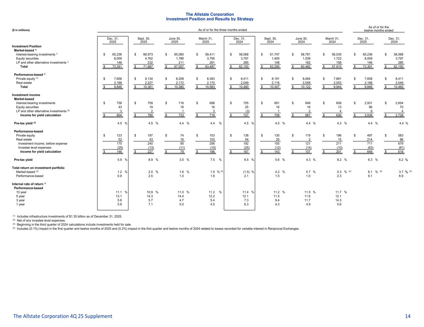 The Allstate Corporation Investment Position and Results by Strategy ($ in millions) As of or for the three months ended As of or for the twelve months ended Dec. 31, 2025 Sept. 30, 2025 June 30, 2025 March 31, 2025 Dec. 31, 2024 Sept. 30, 2024 June 30, 2024 March 31, 2024 Dec. 31, 2025 Dec. 31, 2024 Investment Position Market-based ^ Interest-bearing investments ^ $ 65,236 $ 66,973 $ 65,060 $ 59,411 $ 58,068 $ 61,747 $ 58,781 $ 56,035 $ 65,236 $ 58,068 Equity securities 8,009 4,762 1,786 3,795 3,797 1,400 1,539 1,722 8,009 3,797 LP and other alternative investments ^ 146 232 211 281 285 148 162 158 146 285 Total $ 73,391 $ 71,967 $ 67,057 $ 63,487 $ 62,150 $ 63,295 $ 60,482 $ 57,915 $ 73,391 $ 62,150 Performance-based ^ Private equity (1) $ 7,658 $ 8,134 $ 8,208 $ 8,393 $ 8,411 $ 8,191 $ 8,064 $ 7,891 $ 7,658 $ 8,411 Real estate 2,188 2,227 2,172 2,170 2,049 2,116 2,058 2,053 2,188 2,049 Total $ 9,846 $ 10,361 $ 10,380 $ 10,563 $ 10,460 $ 10,307 $ 10,122 $ 9,944 $ 9,846 $ 10,460 Investment income Market-based Interest-bearing investments $ 758 $ 759 $ 716 $ 698 $ 705 $ 691 $ 649 $ 609 $ 2,931 $ 2,654 Equity securities 43 19 16 18 25 16 16 13 96 70 LP and other alternative investments (2) 3 2 1 3 (3) 1 2 4 9 4 Income for yield calculation $ 804 $ 780 $ 733 $ 719 $ 727 $ 708 $ 667 $ 626 $ 3,036 $ 2,728 Pre-tax yield (3) 4.5 % 4.5 % 4.4 % 4.4 % 4.5 % 4.5 % 4.4 % 4.3 % 4.4 % 4.4 % Performance-based Private equity $ 123 $ 197 $ 74 $ 103 $ 138 $ 130 $ 119 $ 196 $ 497 $ 583 Real estate 52 43 16 103 54 25 2 15 214 96 Investment income, before expense 175 240 90 206 192 155 121 211 711 679 Investee level expenses (29) (13) (11) (10) (25) (12) (14) (10) (63) (61) Income for yield calculation $ 146 $ 227 $ 79 $ 196 $ 167 $ 143 $ 107 $ 201 $ 648 $ 618 Pre-tax yield 5.9 % 8.9 % 3.0 % 7.5 % 6.5 % 5.6 % 4.3 % 8.2 % 6.3 % 6.2 % Total return on investment portfolio Market-based (3) 1.2 % 2.0 % 1.6 % 1.5 % (4) (1.5) % 4.2 % 0.7 % 0.3 % (4) 6.1 % (4) 3.7 % (4) Performance-based 0.9 2.5 1.0 1.6 2.1 1.5 1.0 2.3 6.1 6.9 Internal rate of return ^ Performance-based 10 year 11.1 % 10.9 % 11.0 % 11.2 % 11.4 % 11.2 % 11.5 % 11.7 % 5 year 13.1 14.3 14.4 12.2 12.1 11.5 11.6 12.1 3 year 5.6 5.7 4.7 5.4 7.3 9.4 11.7 14.3 1 year 5.8 7.1 5.0 4.5 6.3 4.3 4.9 5.6 (1) Includes infrastructure investments of $1.35 billion as of December 31, 2025. (2) Net of any investee level expenses. (3) Beginning in the third quarter of 2024 calculations include investments held for sale. (4) Includes (0.1%) impact in the first quarter and twelve months of 2025 and (0.2%) impact in the first quarter and twelve months of 2024 related to losses recorded for variable interest in Reciprocal Exchanges. The Allstate Corporation 4Q 25 Supplement 14