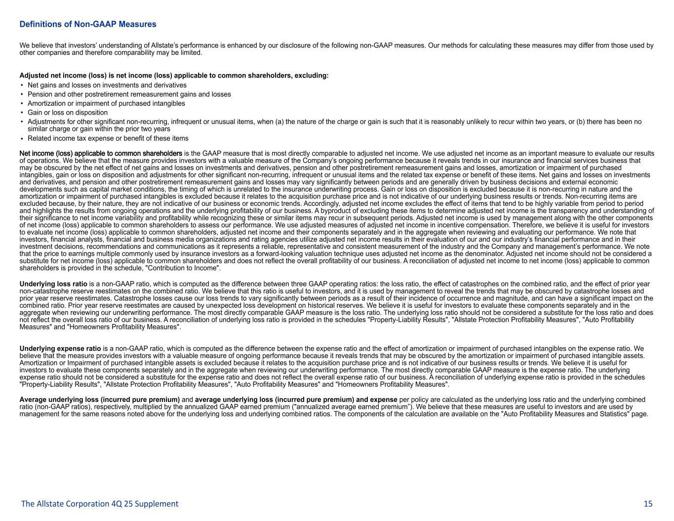 Definitions of Non-GAAP Measures We believe that investors’ understanding of Allstate’s performance is enhanced by our disclosure of the following non-GAAP measures. Our methods for calculating these measures may differ from those used by other companies and therefore comparability may be limited. Adjusted net income (loss) is net income (loss) applicable to common shareholders, excluding: • Net gains and losses on investments and derivatives • Pension and other postretirement remeasurement gains and losses • Amortization or impairment of purchased intangibles • Gain or loss on disposition • Adjustments for other significant non-recurring, infrequent or unusual items, when (a) the nature of the charge or gain is such that it is reasonably unlikely to recur within two years, or (b) there has been no similar charge or gain within the prior two years • Related income tax expense or benefit of these items Net income (loss) applicable to common shareholders is the GAAP measure that is most directly comparable to adjusted net income. We use adjusted net income as an important measure to evaluate our results of operations. We believe that the measure provides investors with a valuable measure of the Company’s ongoing performance because it reveals trends in our insurance and financial services business that may be obscured by the net effect of net gains and losses on investments and derivatives, pension and other postretirement remeasurement gains and losses, amortization or impairment of purchased intangibles, gain or loss on disposition and adjustments for other significant non-recurring, infrequent or unusual items and the related tax expense or benefit of these items. Net gains and losses on investments and derivatives, and pension and other postretirement remeasurement gains and losses may vary significantly between periods and are generally driven by business decisions and external economic developments such as capital market conditions, the timing of which is unrelated to the insurance underwriting process. Gain or loss on disposition is excluded because it is non-recurring in nature and the amortization or impairment of purchased intangibles is excluded because it relates to the acquisition purchase price and is not indicative of our underlying business results or trends. Non-recurring items are excluded because, by their nature, they are not indicative of our business or economic trends. Accordingly, adjusted net income excludes the effect of items that tend to be highly variable from period to period and highlights the results from ongoing operations and the underlying profitability of our business. A byproduct of excluding these items to determine adjusted net income is the transparency and understanding of their significance to net income variability and profitability while recognizing these or similar items may recur in subsequent periods. Adjusted net income is used by management along with the other components of net income (loss) applicable to common shareholders to assess our performance. We use adjusted measures of adjusted net income in incentive compensation. Therefore, we believe it is useful for investors to evaluate net income (loss) applicable to common shareholders, adjusted net income and their components separately and in the aggregate when reviewing and evaluating our performance. We note that investors, financial analysts, financial and business media organizations and rating agencies utilize adjusted net income results in their evaluation of our and our industry’s financial performance and in their investment decisions, recommendations and communications as it represents a reliable, representative and consistent measurement of the industry and the Company and management’s performance. We note that the price to earnings multiple commonly used by insurance investors as a forward-looking valuation technique uses adjusted net income as the denominator. Adjusted net income should not be considered a substitute for net income (loss) applicable to common shareholders and does not reflect the overall profitability of our business. A reconciliation of adjusted net income to net income (loss) applicable to common shareholders is provided in the schedule, "Contribution to Income". Underlying loss ratio is a non-GAAP ratio, which is computed as the difference between three GAAP operating ratios: the loss ratio, the effect of catastrophes on the combined ratio, and the effect of prior year non-catastrophe reserve reestimates on the combined ratio. We believe that this ratio is useful to investors, and it is used by management to reveal the trends that may be obscured by catastrophe losses and prior year reserve reestimates. Catastrophe losses cause our loss trends to vary significantly between periods as a result of their incidence of occurrence and magnitude, and can have a significant impact on the combined ratio. Prior year reserve reestimates are caused by unexpected loss development on historical reserves. We believe it is useful for investors to evaluate these components separately and in the aggregate when reviewing our underwriting performance. The most directly comparable GAAP measure is the loss ratio. The underlying loss ratio should not be considered a substitute for the loss ratio and does not reflect the overall loss ratio of our business. A reconciliation of underlying loss ratio is provided in the schedules "Property-Liability Results", "Allstate Protection Profitability Measures", "Auto Profitability Measures" and "Homeowners Profitability Measures". Underlying expense ratio is a non-GAAP ratio, which is computed as the difference between the expense ratio and the effect of amortization or impairment of purchased intangibles on the expense ratio. We believe that the measure provides investors with a valuable measure of ongoing performance because it reveals trends that may be obscured by the amortization or impairment of purchased intangib