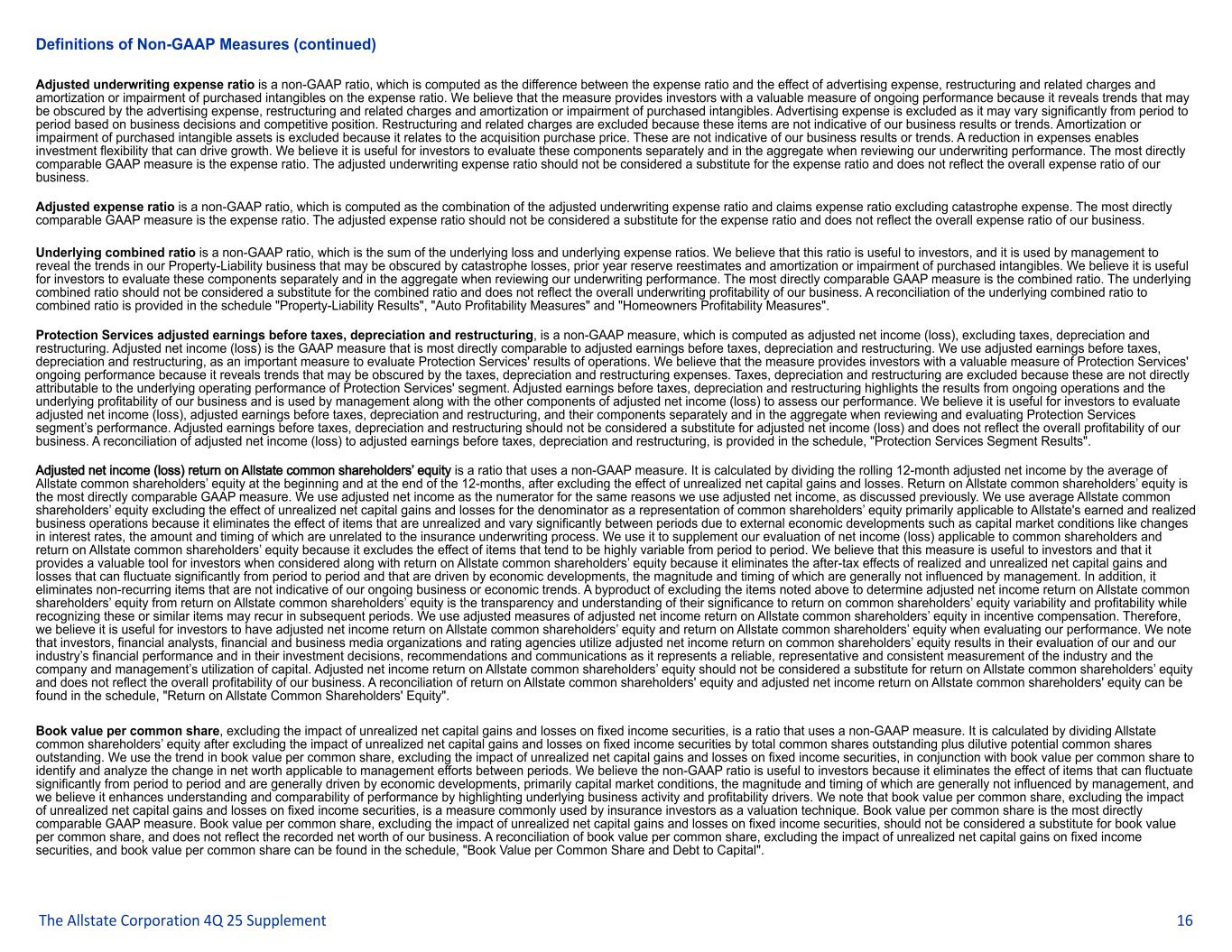 Definitions of Non-GAAP Measures (continued) Adjusted underwriting expense ratio is a non-GAAP ratio, which is computed as the difference between the expense ratio and the effect of advertising expense, restructuring and related charges and amortization or impairment of purchased intangibles on the expense ratio. We believe that the measure provides investors with a valuable measure of ongoing performance because it reveals trends that may be obscured by the advertising expense, restructuring and related charges and amortization or impairment of purchased intangibles. Advertising expense is excluded as it may vary significantly from period to period based on business decisions and competitive position. Restructuring and related charges are excluded because these items are not indicative of our business results or trends. Amortization or impairment of purchased intangible assets is excluded because it relates to the acquisition purchase price. These are not indicative of our business results or trends. A reduction in expenses enables investment flexibility that can drive growth. We believe it is useful for investors to evaluate these components separately and in the aggregate when reviewing our underwriting performance. The most directly comparable GAAP measure is the expense ratio. The adjusted underwriting expense ratio should not be considered a substitute for the expense ratio and does not reflect the overall expense ratio of our business. Adjusted expense ratio is a non-GAAP ratio, which is computed as the combination of the adjusted underwriting expense ratio and claims expense ratio excluding catastrophe expense. The most directly comparable GAAP measure is the expense ratio. The adjusted expense ratio should not be considered a substitute for the expense ratio and does not reflect the overall expense ratio of our business. Underlying combined ratio is a non-GAAP ratio, which is the sum of the underlying loss and underlying expense ratios. We believe that this ratio is useful to investors, and it is used by management to reveal the trends in our Property-Liability business that may be obscured by catastrophe losses, prior year reserve reestimates and amortization or impairment of purchased intangibles. We believe it is useful for investors to evaluate these components separately and in the aggregate when reviewing our underwriting performance. The most directly comparable GAAP measure is the combined ratio. The underlying combined ratio should not be considered a substitute for the combined ratio and does not reflect the overall underwriting profitability of our business. A reconciliation of the underlying combined ratio to combined ratio is provided in the schedule "Property-Liability Results", "Auto Profitability Measures" and "Homeowners Profitability Measures". Protection Services adjusted earnings before taxes, depreciation and restructuring, is a non-GAAP measure, which is computed as adjusted net income (loss), excluding taxes, depreciation and restructuring. Adjusted net income (loss) is the GAAP measure that is most directly comparable to adjusted earnings before taxes, depreciation and restructuring. We use adjusted earnings before taxes, depreciation and restructuring, as an important measure to evaluate Protection Services' results of operations. We believe that the measure provides investors with a valuable measure of Protection Services' ongoing performance because it reveals trends that may be obscured by the taxes, depreciation and restructuring expenses. Taxes, depreciation and restructuring are excluded because these are not directly attributable to the underlying operating performance of Protection Services' segment. Adjusted earnings before taxes, depreciation and restructuring highlights the results from ongoing operations and the underlying profitability of our business and is used by management along with the other components of adjusted net income (loss) to assess our performance. We believe it is useful for investors to evaluate adjusted net income (loss), adjusted earnings before taxes, depreciation and restructuring, and their components separately and in the aggregate when reviewing and evaluating Protection Services segment’s performance. Adjusted earnings before taxes, depreciation and restructuring should not be considered a substitute for adjusted net income (loss) and does not reflect the overall profitability of our business. A reconciliation of adjusted net income (loss) to adjusted earnings before taxes, depreciation and restructuring, is provided in the schedule, "Protection Services Segment Results". Adjusted net income (loss) return on Allstate common shareholders’ equity is a ratio that uses a non-GAAP measure. It is calculated by dividing the rolling 12-month adjusted net income by the average of Allstate common shareholders’ equity at the beginning and at the end of the 12-months, after excluding the effect of unrealized net capital gains and losses. Return on Allstate common shareholders’ equity is the most directly comparable GAAP measure. We use adjusted net income as the numerator for the same reasons we use adjusted net income, as discussed previously. We use average Allstate common shareholders’ equity excluding the effect of unrealized net capital gains and losses for the denominator as a representation of common shareholders’ equity primarily applicable to Allstate's earned and realized business operations because it eliminates the effect of items that are unrealized and vary significantly between periods due to external economic developments such as capital market conditions like changes in interest rates, the amount and timing of which are unrelated to the insurance underwriting process. We use it to supplement our evaluation of net income (loss) applicable to common shareholders and return on Allstate common shareholders’ equity because it excludes the effect of items that tend to be highly variable from period to p