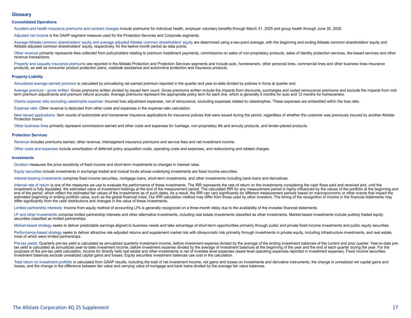 Glossary Consolidated Operations Accident and health insurance premiums and contract charges include premiums for individual health, employer voluntary benefits through March 31, 2025 and group health through June 30, 2025. Adjusted net income is the GAAP segment measure used for the Protection Services and Corporate segments. Average Allstate common shareholders' equity and average adjusted Allstate common shareholders' equity are determined using a two-point average, with the beginning and ending Allstate common shareholders' equity and Allstate adjusted common shareholders' equity, respectively, for the twelve-month period as data points. Other revenue primarily represents fees collected from policyholders relating to premium installment payments, commissions on sales of non-proprietary products, sales of identity protection services, fee-based services and other revenue transactions. Property and casualty insurance premiums are reported in the Allstate Protection and Protection Services segments and include auto, homeowners, other personal lines, commercial lines and other business lines insurance products, as well as consumer product protection plans, roadside assistance and automotive protection and insurance products. Property-Liability Annualized average earned premium is calculated by annualizing net earned premium reported in the quarter and year-to-date divided by policies in force at quarter end. Average premium - gross written: Gross premiums written divided by issued item count. Gross premiums written include the impacts from discounts, surcharges and ceded reinsurance premiums and exclude the impacts from mid- term premium adjustments and premium refund accruals. Average premiums represent the appropriate policy term for each line, which is generally 6 months for auto and 12 months for homeowners. Claims expense ratio excluding catastrophe expense: Incurred loss adjustment expenses, net of reinsurance, excluding expenses related to catastrophes. These expenses are embedded within the loss ratio. Expense ratio: Other revenue is deducted from other costs and expenses in the expense ratio calculation. New issued applications: Item counts of automobile and homeowner insurance applications for insurance policies that were issued during the period, regardless of whether the customer was previously insured by another Allstate Protection brand. Other business lines primarily represent commissions earned and other costs and expenses for Ivantage, non-proprietary life and annuity products, and lender-placed products. Protection Services Revenue includes premiums earned, other revenue, intersegment insurance premiums and service fees and net investment income. Other costs and expenses include amortization of deferred policy acquisition costs, operating costs and expenses, and restructuring and related charges. Investments Duration measures the price sensitivity of fixed income and short-term investments to changes in interest rates. Equity securities include investments in exchange traded and mutual funds whose underlying investments are fixed income securities. Interest-bearing investments comprise fixed income securities, mortgage loans, short-term investments, and other investments including bank loans and derivatives. Internal rate of return is one of the measures we use to evaluate the performance of these investments. The IRR represents the rate of return on the investments considering the cash flows paid and received and, until the investment is fully liquidated, the estimated value of investment holdings at the end of the measurement period. The calculated IRR for any measurement period is highly influenced by the values of the portfolio at the beginning and end of the period, which reflect the estimated fair values of the investments as of such dates. As a result, the IRR can vary significantly for different measurement periods based on macroeconomic or other events that impact the estimated beginning or ending portfolio value, such as the global financial crisis. Our IRR calculation method may differ from those used by other investors. The timing of the recognition of income in the financial statements may differ significantly from the cash distributions and changes in the value of these investments. Limited partnership interests: Income from equity method of accounting LPs is generally recognized on a three-month delay due to the availability of the investee financial statements. LP and other investments comprise limited partnership interests and other alternative investments, including real estate investments classified as other investments. Market-based investments include publicly traded equity securities classified as limited partnerships. Market-based strategy seeks to deliver predictable earnings aligned to business needs and take advantage of short-term opportunities primarily through public and private fixed income investments and public equity securities. Performance-based strategy seeks to deliver attractive risk-adjusted returns and supplement market risk with idiosyncratic risk primarily through investments in private equity, including infrastructure investments, and real estate, most of which were limited partnerships. Pre-tax yields: Quarterly pre-tax yield is calculated as annualized quarterly investment income, before investment expense divided by the average of the ending investment balances of the current and prior quarter. Year-to-date pre- tax yield is calculated as annualized year-to-date investment income, before investment expense divided by the average of investment balances at the beginning of the year and the end of each quarter during the year. For the purposes of the pre-tax yield calculation, income for directly held real estate and other investments is net of investee level expenses (asset level operating expenses reported in investment expense). Fixed income securities investment balances exclude unrealized capital gains and losses. Equity se