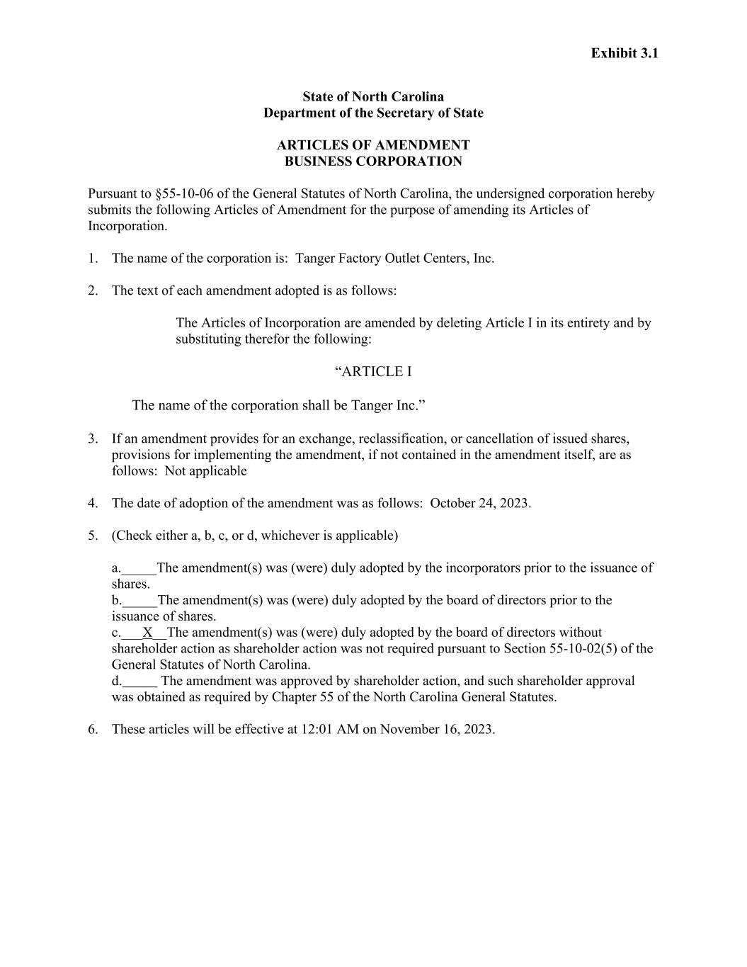 Exhibit 3.1 State of North Carolina Department of the Secretary of State ARTICLES OF AMENDMENT BUSINESS CORPORATION Pursuant to §55-10-06 of the General Statutes of North Carolina, the undersigned corporation hereby submits the following Articles of Amendment for the purpose of amending its Articles of Incorporation. 1. The name of the corporation is: Tanger Factory Outlet Centers, Inc. 2. The text of each amendment adopted is as follows: The Articles of Incorporation are amended by deleting Article I in its entirety and by substituting therefor the following: “ARTICLE I The name of the corporation shall be Tanger Inc.” 3. If an amendment provides for an exchange, reclassification, or cancellation of issued shares, provisions for implementing the amendment, if not contained in the amendment itself, are as follows: Not applicable 4. The date of adoption of the amendment was as follows: October 24, 2023. 5. (Check either a, b, c, or d, whichever is applicable) a._____The amendment(s) was (were) duly adopted by the incorporators prior to the issuance of shares. b._____The amendment(s) was (were) duly adopted by the board of directors prior to the issuance of shares. c.___X__The amendment(s) was (were) duly adopted by the board of directors without shareholder action as shareholder action was not required pursuant to Section 55-10-02(5) of the General Statutes of North Carolina. d. The amendment was approved by shareholder action, and such shareholder approval was obtained as required by Chapter 55 of the North Carolina General Statutes. 6. These articles will be effective at 12:01 AM on November 16, 2023.