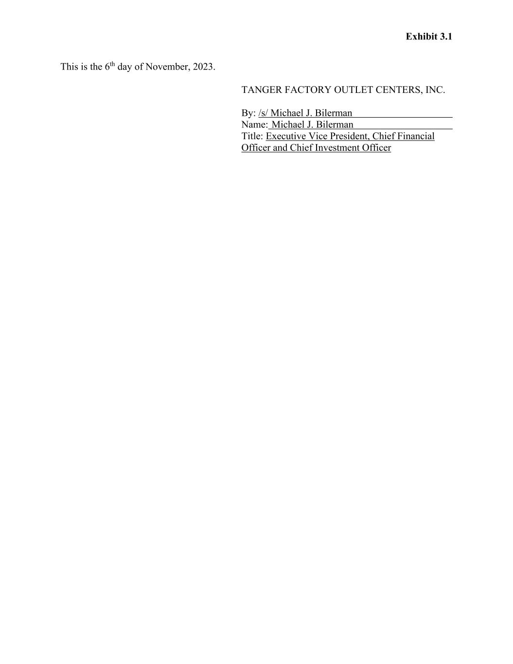 Exhibit 3.1 This is the 6th day of November, 2023. TANGER FACTORY OUTLET CENTERS, INC. By: /s/ Michael J. Bilerman Name: Michael J. Bilerman Title: Executive Vice President, Chief Financial Officer and Chief Investment Officer