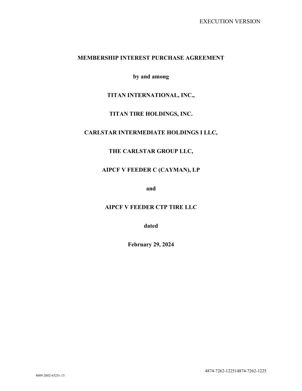 EXECUTION VERSION 4874-7262-122514874-7262-1225 MEMBERSHIP INTEREST PURCHASE AGREEMENT by and among TITAN INTERNATIONAL, INC., TITAN TIRE HOLDINGS, INC. CARLSTAR INTERMEDIATE HOLDINGS I LLC, THE CARLSTAR GROUP LLC, AIPCF V FEEDER C (CAYMAN), LP and AIPCF V FEEDER CTP TIRE LLC dated February 29, 2024 4889-2802-6525v.15