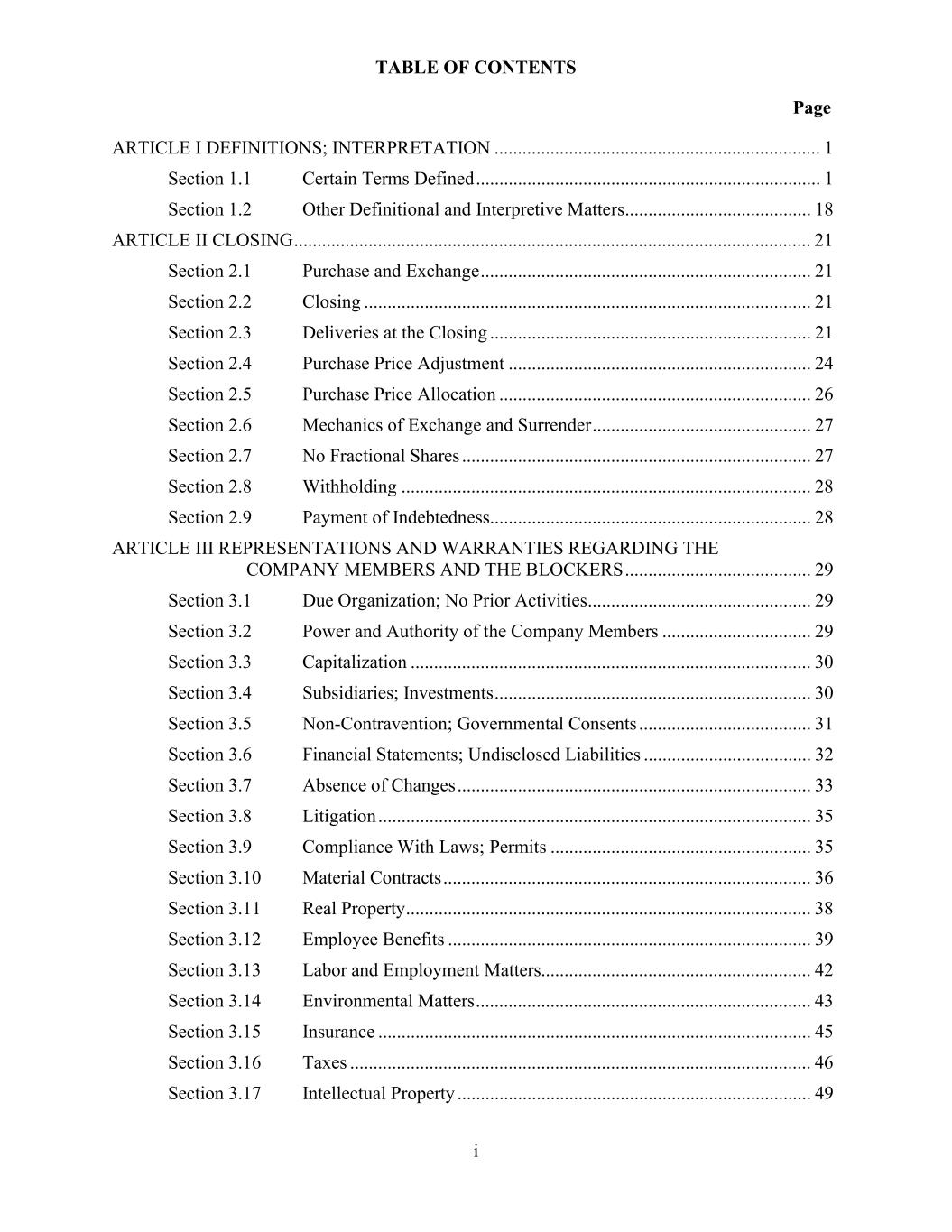 TABLE OF CONTENTS Page i ARTICLE I DEFINITIONS; INTERPRETATION ...................................................................... 1 Section 1.1 Certain Terms Defined .......................................................................... 1 Section 1.2 Other Definitional and Interpretive Matters ........................................ 18 ARTICLE II CLOSING ............................................................................................................... 21 Section 2.1 Purchase and Exchange ....................................................................... 21 Section 2.2 Closing ................................................................................................ 21 Section 2.3 Deliveries at the Closing ..................................................................... 21 Section 2.4 Purchase Price Adjustment ................................................................. 24 Section 2.5 Purchase Price Allocation ................................................................... 26 Section 2.6 Mechanics of Exchange and Surrender ............................................... 27 Section 2.7 No Fractional Shares ........................................................................... 27 Section 2.8 Withholding ........................................................................................ 28 Section 2.9 Payment of Indebtedness..................................................................... 28 ARTICLE III REPRESENTATIONS AND WARRANTIES REGARDING THE COMPANY MEMBERS AND THE BLOCKERS ........................................ 29 Section 3.1 Due Organization; No Prior Activities ................................................ 29 Section 3.2 Power and Authority of the Company Members ................................ 29 Section 3.3 Capitalization ...................................................................................... 30 Section 3.4 Subsidiaries; Investments .................................................................... 30 Section 3.5 Non-Contravention; Governmental Consents ..................................... 31 Section 3.6 Financial Statements; Undisclosed Liabilities .................................... 32 Section 3.7 Absence of Changes ............................................................................ 33 Section 3.8 Litigation ............................................................................................. 35 Section 3.9 Compliance With Laws; Permits ........................................................ 35 Section 3.10 Material Contracts ............................................................................... 36 Section 3.11 Real Property ....................................................................................... 38 Section 3.12 Employee Benefits .............................................................................. 39 Section 3.13 Labor and Employment Matters.......................................................... 42 Section 3.14 Environmental Matters ........................................................................ 43 Section 3.15 Insurance ............................................................................................. 45 Section 3.16 Taxes ................................................................................................... 46 Section 3.17 Intellectual Property ............................................................................ 49