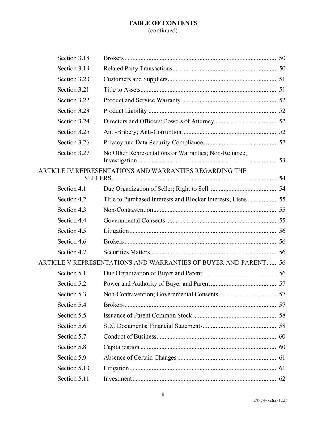 TABLE OF CONTENTS (continued) ii 24874-7262-1225 Section 3.18 Brokers ................................................................................................ 50 Section 3.19 Related Party Transactions .................................................................. 50 Section 3.20 Customers and Suppliers ..................................................................... 51 Section 3.21 Title to Assets ...................................................................................... 51 Section 3.22 Product and Service Warranty ............................................................ 52 Section 3.23 Product Liability ................................................................................. 52 Section 3.24 Directors and Officers; Powers of Attorney ....................................... 52 Section 3.25 Anti-Bribery; Anti-Corruption ............................................................ 52 Section 3.26 Privacy and Data Security Compliance............................................... 52 Section 3.27 No Other Representations or Warranties; Non-Reliance; Investigation ........................................................................................ 53 ARTICLE IV REPRESENTATIONS AND WARRANTIES REGARDING THE SELLERS ........................................................................................................ 54 Section 4.1 Due Organization of Seller; Right to Sell ........................................... 54 Section 4.2 Title to Purchased Interests and Blocker Interests; Liens ................... 55 Section 4.3 Non-Contravention .............................................................................. 55 Section 4.4 Governmental Consents ...................................................................... 55 Section 4.5 Litigation ............................................................................................. 56 Section 4.6 Brokers ................................................................................................ 56 Section 4.7 Securities Matters ................................................................................ 56 ARTICLE V REPRESENTATIONS AND WARRANTIES OF BUYER AND PARENT ....... 56 Section 5.1 Due Organization of Buyer and Parent ............................................... 56 Section 5.2 Power and Authority of Buyer and Parent .......................................... 57 Section 5.3 Non-Contravention; Governmental Consents ..................................... 57 Section 5.4 Brokers ................................................................................................ 57 Section 5.5 Issuance of Parent Common Stock ..................................................... 58 Section 5.6 SEC Documents; Financial Statements ............................................... 58 Section 5.7 Conduct of Business ............................................................................ 60 Section 5.8 Capitalization ...................................................................................... 60 Section 5.9 Absence of Certain Changes ............................................................... 61 Section 5.10 Litigation ............................................................................................. 61 Section 5.11 Investment ........................................................................................... 62