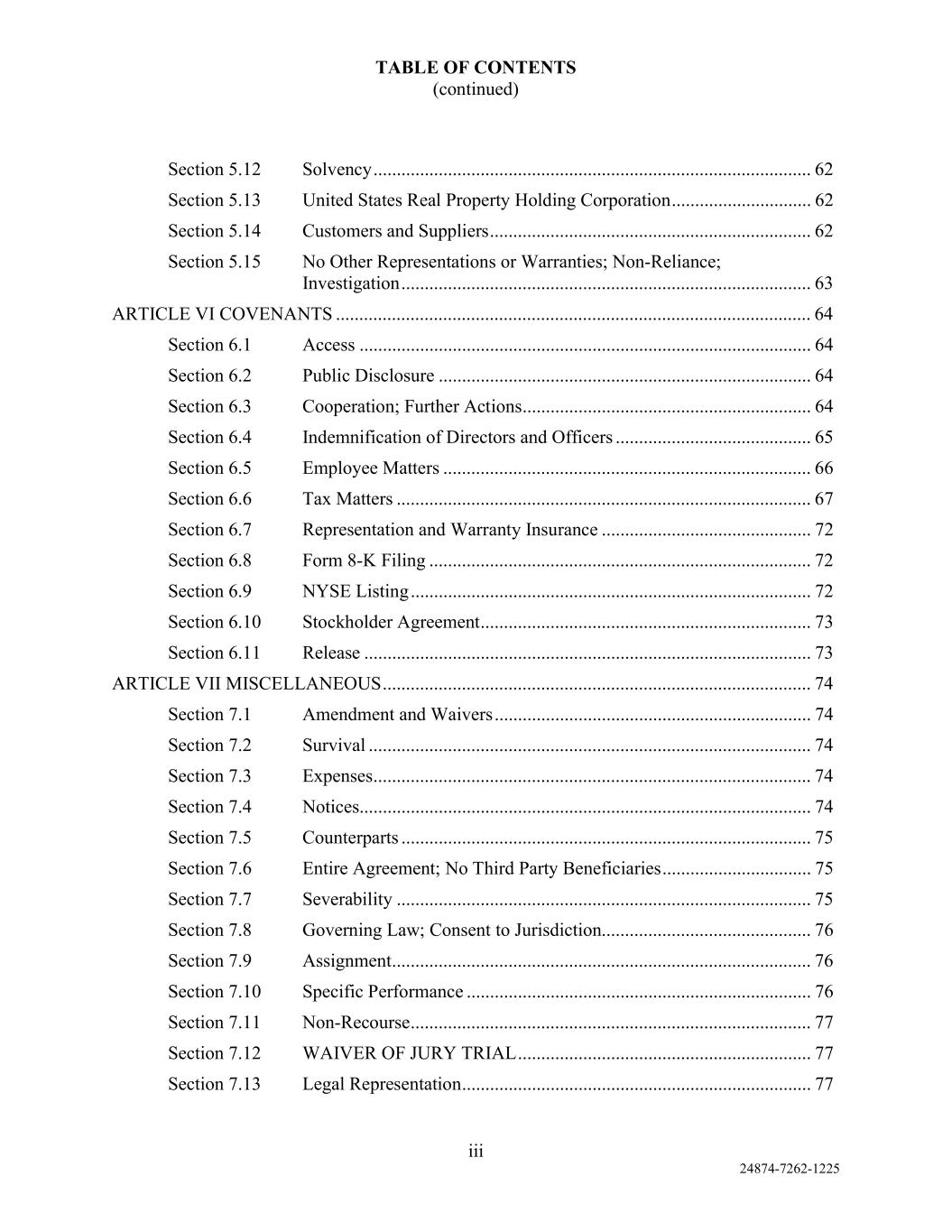 TABLE OF CONTENTS (continued) iii 24874-7262-1225 Section 5.12 Solvency .............................................................................................. 62 Section 5.13 United States Real Property Holding Corporation .............................. 62 Section 5.14 Customers and Suppliers ..................................................................... 62 Section 5.15 No Other Representations or Warranties; Non-Reliance; Investigation ........................................................................................ 63 ARTICLE VI COVENANTS ...................................................................................................... 64 Section 6.1 Access ................................................................................................. 64 Section 6.2 Public Disclosure ................................................................................ 64 Section 6.3 Cooperation; Further Actions .............................................................. 64 Section 6.4 Indemnification of Directors and Officers .......................................... 65 Section 6.5 Employee Matters ............................................................................... 66 Section 6.6 Tax Matters ......................................................................................... 67 Section 6.7 Representation and Warranty Insurance ............................................. 72 Section 6.8 Form 8-K Filing .................................................................................. 72 Section 6.9 NYSE Listing ...................................................................................... 72 Section 6.10 Stockholder Agreement ....................................................................... 73 Section 6.11 Release ................................................................................................ 73 ARTICLE VII MISCELLANEOUS ............................................................................................ 74 Section 7.1 Amendment and Waivers .................................................................... 74 Section 7.2 Survival ............................................................................................... 74 Section 7.3 Expenses .............................................................................................. 74 Section 7.4 Notices................................................................................................. 74 Section 7.5 Counterparts ........................................................................................ 75 Section 7.6 Entire Agreement; No Third Party Beneficiaries ................................ 75 Section 7.7 Severability ......................................................................................... 75 Section 7.8 Governing Law; Consent to Jurisdiction............................................. 76 Section 7.9 Assignment .......................................................................................... 76 Section 7.10 Specific Performance .......................................................................... 76 Section 7.11 Non-Recourse ...................................................................................... 77 Section 7.12 WAIVER OF JURY TRIAL ............................................................... 77 Section 7.13 Legal Representation ........................................................................... 77