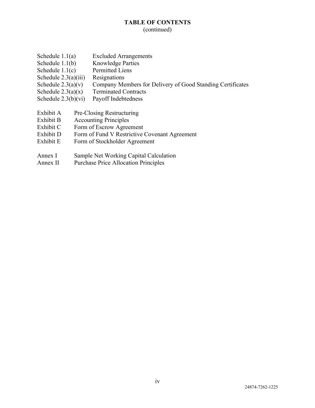TABLE OF CONTENTS (continued) iv 24874-7262-1225 Schedule 1.1(a) Excluded Arrangements Schedule 1.1(b) Knowledge Parties Schedule 1.1(c) Permitted Liens Schedule 2.3(a)(iii) Resignations Schedule 2.3(a)(v) Company Members for Delivery of Good Standing Certificates Schedule 2.3(a)(x) Terminated Contracts Schedule 2.3(b)(vi) Payoff Indebtedness Exhibit A Pre-Closing Restructuring Exhibit B Accounting Principles Exhibit C Form of Escrow Agreement Exhibit D Form of Fund V Restrictive Covenant Agreement Exhibit E Form of Stockholder Agreement Annex I Sample Net Working Capital Calculation Annex II Purchase Price Allocation Principles