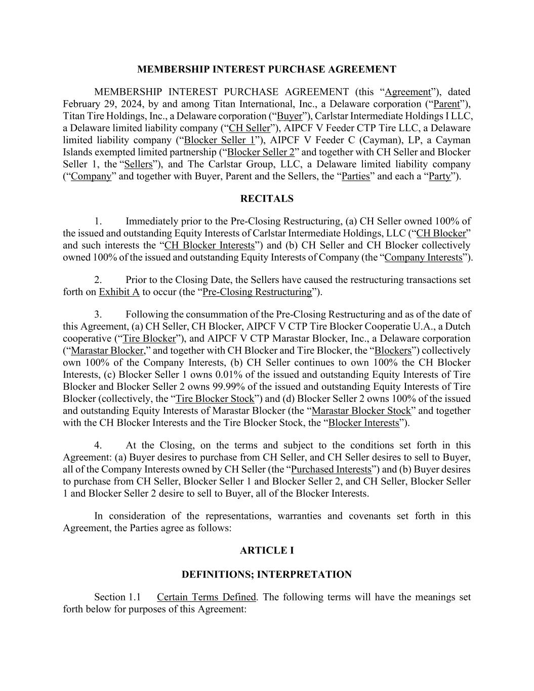 MEMBERSHIP INTEREST PURCHASE AGREEMENT MEMBERSHIP INTEREST PURCHASE AGREEMENT (this “Agreement”), dated February 29, 2024, by and among Titan International, Inc., a Delaware corporation (“Parent”), Titan Tire Holdings, Inc., a Delaware corporation (“Buyer”), Carlstar Intermediate Holdings I LLC, a Delaware limited liability company (“CH Seller”), AIPCF V Feeder CTP Tire LLC, a Delaware limited liability company (“Blocker Seller 1”), AIPCF V Feeder C (Cayman), LP, a Cayman Islands exempted limited partnership (“Blocker Seller 2” and together with CH Seller and Blocker Seller 1, the “Sellers”), and The Carlstar Group, LLC, a Delaware limited liability company (“Company” and together with Buyer, Parent and the Sellers, the “Parties” and each a “Party”). RECITALS 1. Immediately prior to the Pre-Closing Restructuring, (a) CH Seller owned 100% of the issued and outstanding Equity Interests of Carlstar Intermediate Holdings, LLC (“CH Blocker” and such interests the “CH Blocker Interests”) and (b) CH Seller and CH Blocker collectively owned 100% of the issued and outstanding Equity Interests of Company (the “Company Interests”). 2. Prior to the Closing Date, the Sellers have caused the restructuring transactions set forth on Exhibit A to occur (the “Pre-Closing Restructuring”). 3. Following the consummation of the Pre-Closing Restructuring and as of the date of this Agreement, (a) CH Seller, CH Blocker, AIPCF V CTP Tire Blocker Cooperatie U.A., a Dutch cooperative (“Tire Blocker”), and AIPCF V CTP Marastar Blocker, Inc., a Delaware corporation (“Marastar Blocker,” and together with CH Blocker and Tire Blocker, the “Blockers”) collectively own 100% of the Company Interests, (b) CH Seller continues to own 100% the CH Blocker Interests, (c) Blocker Seller 1 owns 0.01% of the issued and outstanding Equity Interests of Tire Blocker and Blocker Seller 2 owns 99.99% of the issued and outstanding Equity Interests of Tire Blocker (collectively, the “Tire Blocker Stock”) and (d) Blocker Seller 2 owns 100% of the issued and outstanding Equity Interests of Marastar Blocker (the “Marastar Blocker Stock” and together with the CH Blocker Interests and the Tire Blocker Stock, the “Blocker Interests”). 4. At the Closing, on the terms and subject to the conditions set forth in this Agreement: (a) Buyer desires to purchase from CH Seller, and CH Seller desires to sell to Buyer, all of the Company Interests owned by CH Seller (the “Purchased Interests”) and (b) Buyer desires to purchase from CH Seller, Blocker Seller 1 and Blocker Seller 2, and CH Seller, Blocker Seller 1 and Blocker Seller 2 desire to sell to Buyer, all of the Blocker Interests. In consideration of the representations, warranties and covenants set forth in this Agreement, the Parties agree as follows: ARTICLE I DEFINITIONS; INTERPRETATION Section 1.1 Certain Terms Defined. The following terms will have the meanings set forth below for purposes of this Agreement: