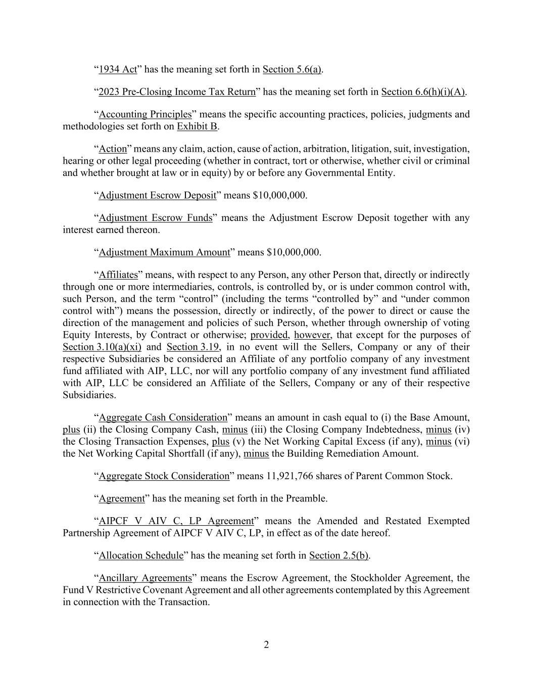 2 “1934 Act” has the meaning set forth in Section 5.6(a). “2023 Pre-Closing Income Tax Return” has the meaning set forth in Section 6.6(h)(i)(A). “Accounting Principles” means the specific accounting practices, policies, judgments and methodologies set forth on Exhibit B. “Action” means any claim, action, cause of action, arbitration, litigation, suit, investigation, hearing or other legal proceeding (whether in contract, tort or otherwise, whether civil or criminal and whether brought at law or in equity) by or before any Governmental Entity. “Adjustment Escrow Deposit” means $10,000,000. “Adjustment Escrow Funds” means the Adjustment Escrow Deposit together with any interest earned thereon. “Adjustment Maximum Amount” means $10,000,000. “Affiliates” means, with respect to any Person, any other Person that, directly or indirectly through one or more intermediaries, controls, is controlled by, or is under common control with, such Person, and the term “control” (including the terms “controlled by” and “under common control with”) means the possession, directly or indirectly, of the power to direct or cause the direction of the management and policies of such Person, whether through ownership of voting Equity Interests, by Contract or otherwise; provided, however, that except for the purposes of Section 3.10(a)(xi) and Section 3.19, in no event will the Sellers, Company or any of their respective Subsidiaries be considered an Affiliate of any portfolio company of any investment fund affiliated with AIP, LLC, nor will any portfolio company of any investment fund affiliated with AIP, LLC be considered an Affiliate of the Sellers, Company or any of their respective Subsidiaries. “Aggregate Cash Consideration” means an amount in cash equal to (i) the Base Amount, plus (ii) the Closing Company Cash, minus (iii) the Closing Company Indebtedness, minus (iv) the Closing Transaction Expenses, plus (v) the Net Working Capital Excess (if any), minus (vi) the Net Working Capital Shortfall (if any), minus the Building Remediation Amount. “Aggregate Stock Consideration” means 11,921,766 shares of Parent Common Stock. “Agreement” has the meaning set forth in the Preamble. “AIPCF V AIV C, LP Agreement” means the Amended and Restated Exempted Partnership Agreement of AIPCF V AIV C, LP, in effect as of the date hereof. “Allocation Schedule” has the meaning set forth in Section 2.5(b). “Ancillary Agreements” means the Escrow Agreement, the Stockholder Agreement, the Fund V Restrictive Covenant Agreement and all other agreements contemplated by this Agreement in connection with the Transaction.