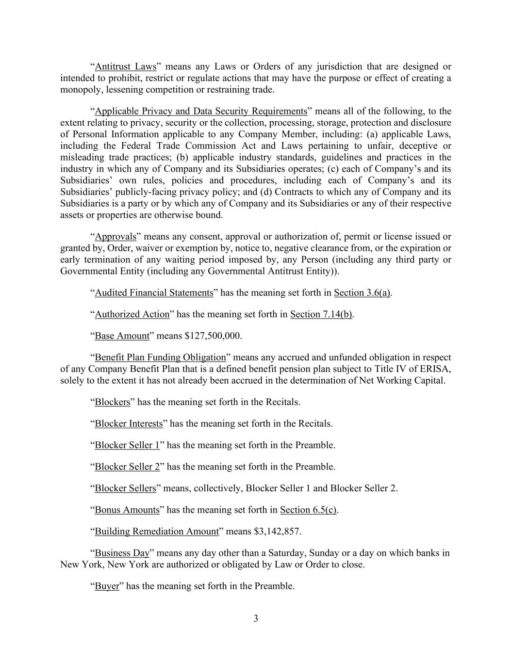 3 “Antitrust Laws” means any Laws or Orders of any jurisdiction that are designed or intended to prohibit, restrict or regulate actions that may have the purpose or effect of creating a monopoly, lessening competition or restraining trade. “Applicable Privacy and Data Security Requirements” means all of the following, to the extent relating to privacy, security or the collection, processing, storage, protection and disclosure of Personal Information applicable to any Company Member, including: (a) applicable Laws, including the Federal Trade Commission Act and Laws pertaining to unfair, deceptive or misleading trade practices; (b) applicable industry standards, guidelines and practices in the industry in which any of Company and its Subsidiaries operates; (c) each of Company’s and its Subsidiaries’ own rules, policies and procedures, including each of Company’s and its Subsidiaries’ publicly-facing privacy policy; and (d) Contracts to which any of Company and its Subsidiaries is a party or by which any of Company and its Subsidiaries or any of their respective assets or properties are otherwise bound. “Approvals” means any consent, approval or authorization of, permit or license issued or granted by, Order, waiver or exemption by, notice to, negative clearance from, or the expiration or early termination of any waiting period imposed by, any Person (including any third party or Governmental Entity (including any Governmental Antitrust Entity)). “Audited Financial Statements” has the meaning set forth in Section 3.6(a). “Authorized Action” has the meaning set forth in Section 7.14(b). “Base Amount” means $127,500,000. “Benefit Plan Funding Obligation” means any accrued and unfunded obligation in respect of any Company Benefit Plan that is a defined benefit pension plan subject to Title IV of ERISA, solely to the extent it has not already been accrued in the determination of Net Working Capital. “Blockers” has the meaning set forth in the Recitals. “Blocker Interests” has the meaning set forth in the Recitals. “Blocker Seller 1” has the meaning set forth in the Preamble. “Blocker Seller 2” has the meaning set forth in the Preamble. “Blocker Sellers” means, collectively, Blocker Seller 1 and Blocker Seller 2. “Bonus Amounts” has the meaning set forth in Section 6.5(c). “Building Remediation Amount” means $3,142,857. “Business Day” means any day other than a Saturday, Sunday or a day on which banks in New York, New York are authorized or obligated by Law or Order to close. “Buyer” has the meaning set forth in the Preamble.