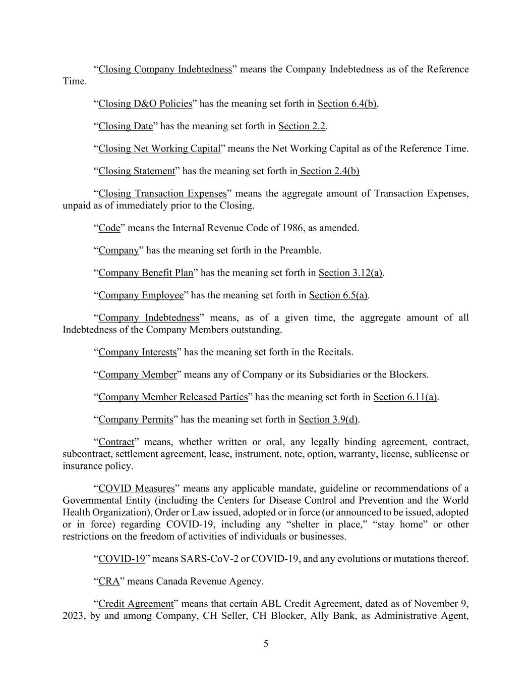 5 “Closing Company Indebtedness” means the Company Indebtedness as of the Reference Time. “Closing D&O Policies” has the meaning set forth in Section 6.4(b). “Closing Date” has the meaning set forth in Section 2.2. “Closing Net Working Capital” means the Net Working Capital as of the Reference Time. “Closing Statement” has the meaning set forth in Section 2.4(b) “Closing Transaction Expenses” means the aggregate amount of Transaction Expenses, unpaid as of immediately prior to the Closing. “Code” means the Internal Revenue Code of 1986, as amended. “Company” has the meaning set forth in the Preamble. “Company Benefit Plan” has the meaning set forth in Section 3.12(a). “Company Employee” has the meaning set forth in Section 6.5(a). “Company Indebtedness” means, as of a given time, the aggregate amount of all Indebtedness of the Company Members outstanding. “Company Interests” has the meaning set forth in the Recitals. “Company Member” means any of Company or its Subsidiaries or the Blockers. “Company Member Released Parties” has the meaning set forth in Section 6.11(a). “Company Permits” has the meaning set forth in Section 3.9(d). “Contract” means, whether written or oral, any legally binding agreement, contract, subcontract, settlement agreement, lease, instrument, note, option, warranty, license, sublicense or insurance policy. “COVID Measures” means any applicable mandate, guideline or recommendations of a Governmental Entity (including the Centers for Disease Control and Prevention and the World Health Organization), Order or Law issued, adopted or in force (or announced to be issued, adopted or in force) regarding COVID-19, including any “shelter in place,” “stay home” or other restrictions on the freedom of activities of individuals or businesses. “COVID-19” means SARS-CoV-2 or COVID-19, and any evolutions or mutations thereof. “CRA” means Canada Revenue Agency. “Credit Agreement” means that certain ABL Credit Agreement, dated as of November 9, 2023, by and among Company, CH Seller, CH Blocker, Ally Bank, as Administrative Agent,