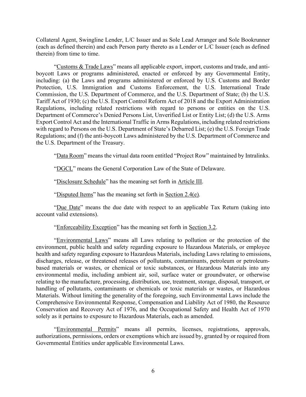 6 Collateral Agent, Swingline Lender, L/C Issuer and as Sole Lead Arranger and Sole Bookrunner (each as defined therein) and each Person party thereto as a Lender or L/C Issuer (each as defined therein) from time to time. “Customs & Trade Laws” means all applicable export, import, customs and trade, and anti- boycott Laws or programs administered, enacted or enforced by any Governmental Entity, including: (a) the Laws and programs administered or enforced by U.S. Customs and Border Protection, U.S. Immigration and Customs Enforcement, the U.S. International Trade Commission, the U.S. Department of Commerce, and the U.S. Department of State; (b) the U.S. Tariff Act of 1930; (c) the U.S. Export Control Reform Act of 2018 and the Export Administration Regulations, including related restrictions with regard to persons or entities on the U.S. Department of Commerce’s Denied Persons List, Unverified List or Entity List; (d) the U.S. Arms Export Control Act and the International Traffic in Arms Regulations, including related restrictions with regard to Persons on the U.S. Department of State’s Debarred List; (e) the U.S. Foreign Trade Regulations; and (f) the anti-boycott Laws administered by the U.S. Department of Commerce and the U.S. Department of the Treasury. “Data Room” means the virtual data room entitled “Project Row” maintained by Intralinks. “DGCL” means the General Corporation Law of the State of Delaware. “Disclosure Schedule” has the meaning set forth in Article III. “Disputed Items” has the meaning set forth in Section 2.4(e). “Due Date” means the due date with respect to an applicable Tax Return (taking into account valid extensions). “Enforceability Exception” has the meaning set forth in Section 3.2. “Environmental Laws” means all Laws relating to pollution or the protection of the environment, public health and safety regarding exposure to Hazardous Materials, or employee health and safety regarding exposure to Hazardous Materials, including Laws relating to emissions, discharges, release, or threatened releases of pollutants, contaminants, petroleum or petroleum- based materials or wastes, or chemical or toxic substances, or Hazardous Materials into any environmental media, including ambient air, soil, surface water or groundwater, or otherwise relating to the manufacture, processing, distribution, use, treatment, storage, disposal, transport, or handling of pollutants, contaminants or chemicals or toxic materials or wastes, or Hazardous Materials. Without limiting the generality of the foregoing, such Environmental Laws include the Comprehensive Environmental Response, Compensation and Liability Act of 1980, the Resource Conservation and Recovery Act of 1976, and the Occupational Safety and Health Act of 1970 solely as it pertains to exposure to Hazardous Materials, each as amended. “Environmental Permits” means all permits, licenses, registrations, approvals, authorizations, permissions, orders or exemptions which are issued by, granted by or required from Governmental Entities under applicable Environmental Laws.