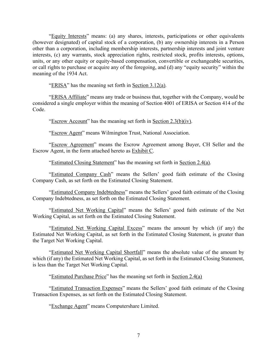 7 “Equity Interests” means: (a) any shares, interests, participations or other equivalents (however designated) of capital stock of a corporation, (b) any ownership interests in a Person other than a corporation, including membership interests, partnership interests and joint venture interests, (c) any warrants, stock appreciation rights, restricted stock, profits interests, options, units, or any other equity or equity-based compensation, convertible or exchangeable securities, or call rights to purchase or acquire any of the foregoing, and (d) any “equity security” within the meaning of the 1934 Act. “ERISA” has the meaning set forth in Section 3.12(a). “ERISA Affiliate” means any trade or business that, together with the Company, would be considered a single employer within the meaning of Section 4001 of ERISA or Section 414 of the Code. “Escrow Account” has the meaning set forth in Section 2.3(b)(iv). “Escrow Agent” means Wilmington Trust, National Association. “Escrow Agreement” means the Escrow Agreement among Buyer, CH Seller and the Escrow Agent, in the form attached hereto as Exhibit C. “Estimated Closing Statement” has the meaning set forth in Section 2.4(a). “Estimated Company Cash” means the Sellers’ good faith estimate of the Closing Company Cash, as set forth on the Estimated Closing Statement. “Estimated Company Indebtedness” means the Sellers’ good faith estimate of the Closing Company Indebtedness, as set forth on the Estimated Closing Statement. “Estimated Net Working Capital” means the Sellers’ good faith estimate of the Net Working Capital, as set forth on the Estimated Closing Statement. “Estimated Net Working Capital Excess” means the amount by which (if any) the Estimated Net Working Capital, as set forth in the Estimated Closing Statement, is greater than the Target Net Working Capital. “Estimated Net Working Capital Shortfall” means the absolute value of the amount by which (if any) the Estimated Net Working Capital, as set forth in the Estimated Closing Statement, is less than the Target Net Working Capital. “Estimated Purchase Price” has the meaning set forth in Section 2.4(a) “Estimated Transaction Expenses” means the Sellers’ good faith estimate of the Closing Transaction Expenses, as set forth on the Estimated Closing Statement. “Exchange Agent” means Computershare Limited.