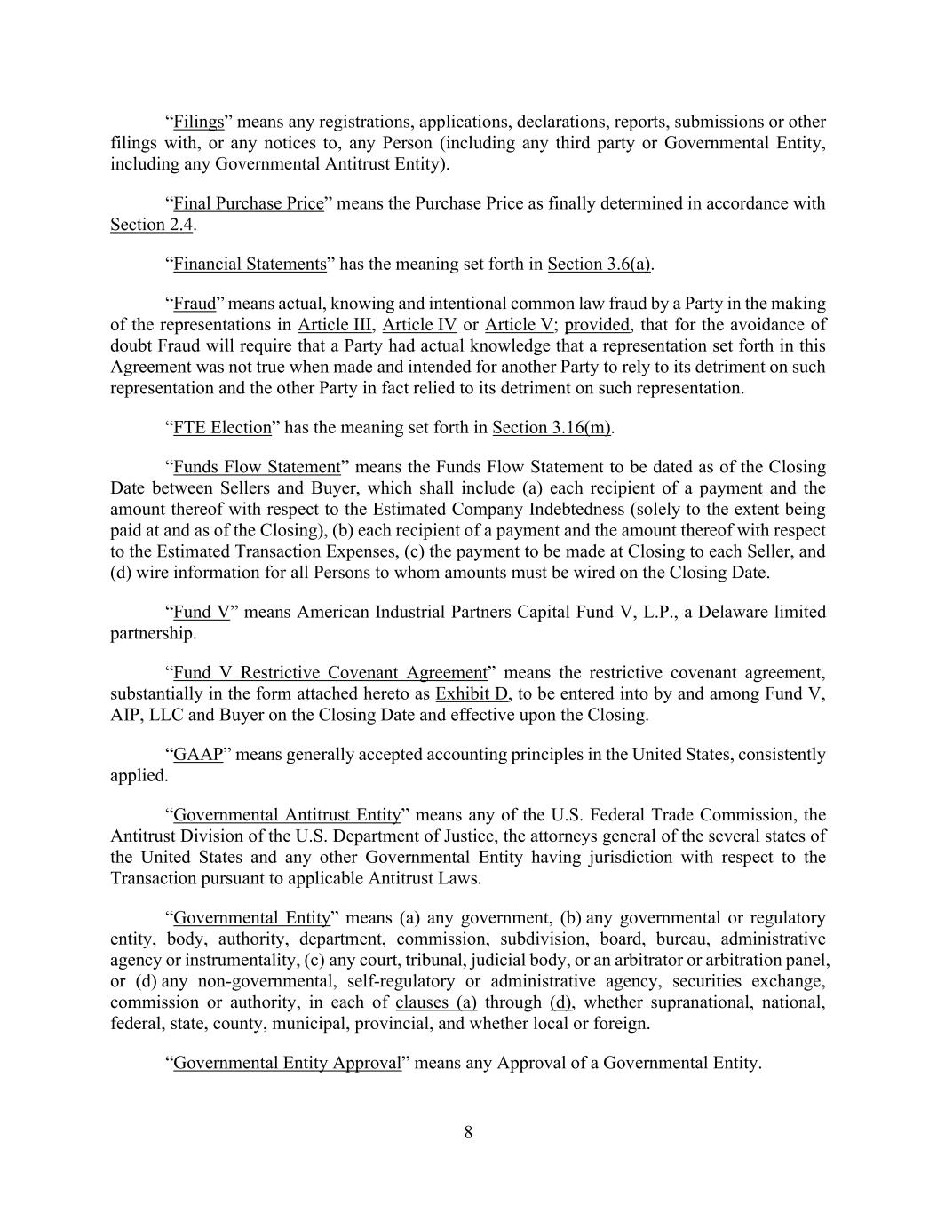 8 “Filings” means any registrations, applications, declarations, reports, submissions or other filings with, or any notices to, any Person (including any third party or Governmental Entity, including any Governmental Antitrust Entity). “Final Purchase Price” means the Purchase Price as finally determined in accordance with Section 2.4. “Financial Statements” has the meaning set forth in Section 3.6(a). “Fraud” means actual, knowing and intentional common law fraud by a Party in the making of the representations in Article III, Article IV or Article V; provided, that for the avoidance of doubt Fraud will require that a Party had actual knowledge that a representation set forth in this Agreement was not true when made and intended for another Party to rely to its detriment on such representation and the other Party in fact relied to its detriment on such representation. “FTE Election” has the meaning set forth in Section 3.16(m). “Funds Flow Statement” means the Funds Flow Statement to be dated as of the Closing Date between Sellers and Buyer, which shall include (a) each recipient of a payment and the amount thereof with respect to the Estimated Company Indebtedness (solely to the extent being paid at and as of the Closing), (b) each recipient of a payment and the amount thereof with respect to the Estimated Transaction Expenses, (c) the payment to be made at Closing to each Seller, and (d) wire information for all Persons to whom amounts must be wired on the Closing Date. “Fund V” means American Industrial Partners Capital Fund V, L.P., a Delaware limited partnership. “Fund V Restrictive Covenant Agreement” means the restrictive covenant agreement, substantially in the form attached hereto as Exhibit D, to be entered into by and among Fund V, AIP, LLC and Buyer on the Closing Date and effective upon the Closing. “GAAP” means generally accepted accounting principles in the United States, consistently applied. “Governmental Antitrust Entity” means any of the U.S. Federal Trade Commission, the Antitrust Division of the U.S. Department of Justice, the attorneys general of the several states of the United States and any other Governmental Entity having jurisdiction with respect to the Transaction pursuant to applicable Antitrust Laws. “Governmental Entity” means (a) any government, (b) any governmental or regulatory entity, body, authority, department, commission, subdivision, board, bureau, administrative agency or instrumentality, (c) any court, tribunal, judicial body, or an arbitrator or arbitration panel, or (d) any non-governmental, self-regulatory or administrative agency, securities exchange, commission or authority, in each of clauses (a) through (d), whether supranational, national, federal, state, county, municipal, provincial, and whether local or foreign. “Governmental Entity Approval” means any Approval of a Governmental Entity.