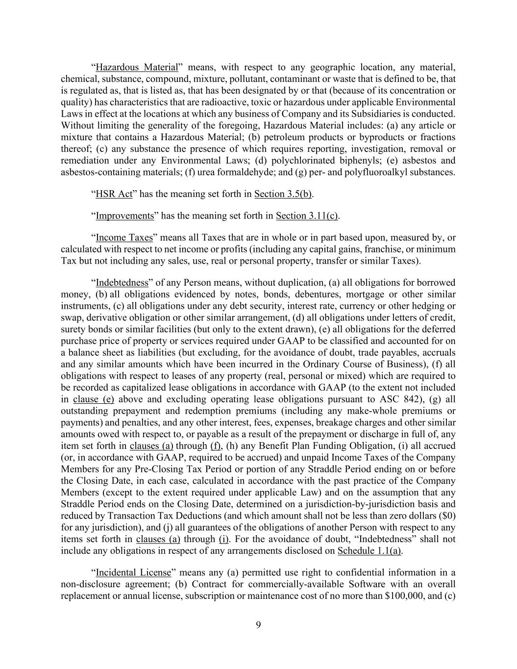 9 “Hazardous Material” means, with respect to any geographic location, any material, chemical, substance, compound, mixture, pollutant, contaminant or waste that is defined to be, that is regulated as, that is listed as, that has been designated by or that (because of its concentration or quality) has characteristics that are radioactive, toxic or hazardous under applicable Environmental Laws in effect at the locations at which any business of Company and its Subsidiaries is conducted. Without limiting the generality of the foregoing, Hazardous Material includes: (a) any article or mixture that contains a Hazardous Material; (b) petroleum products or byproducts or fractions thereof; (c) any substance the presence of which requires reporting, investigation, removal or remediation under any Environmental Laws; (d) polychlorinated biphenyls; (e) asbestos and asbestos-containing materials; (f) urea formaldehyde; and (g) per- and polyfluoroalkyl substances. “HSR Act” has the meaning set forth in Section 3.5(b). “Improvements” has the meaning set forth in Section 3.11(c). “Income Taxes” means all Taxes that are in whole or in part based upon, measured by, or calculated with respect to net income or profits (including any capital gains, franchise, or minimum Tax but not including any sales, use, real or personal property, transfer or similar Taxes). “Indebtedness” of any Person means, without duplication, (a) all obligations for borrowed money, (b) all obligations evidenced by notes, bonds, debentures, mortgage or other similar instruments, (c) all obligations under any debt security, interest rate, currency or other hedging or swap, derivative obligation or other similar arrangement, (d) all obligations under letters of credit, surety bonds or similar facilities (but only to the extent drawn), (e) all obligations for the deferred purchase price of property or services required under GAAP to be classified and accounted for on a balance sheet as liabilities (but excluding, for the avoidance of doubt, trade payables, accruals and any similar amounts which have been incurred in the Ordinary Course of Business), (f) all obligations with respect to leases of any property (real, personal or mixed) which are required to be recorded as capitalized lease obligations in accordance with GAAP (to the extent not included in clause (e) above and excluding operating lease obligations pursuant to ASC 842), (g) all outstanding prepayment and redemption premiums (including any make-whole premiums or payments) and penalties, and any other interest, fees, expenses, breakage charges and other similar amounts owed with respect to, or payable as a result of the prepayment or discharge in full of, any item set forth in clauses (a) through (f), (h) any Benefit Plan Funding Obligation, (i) all accrued (or, in accordance with GAAP, required to be accrued) and unpaid Income Taxes of the Company Members for any Pre-Closing Tax Period or portion of any Straddle Period ending on or before the Closing Date, in each case, calculated in accordance with the past practice of the Company Members (except to the extent required under applicable Law) and on the assumption that any Straddle Period ends on the Closing Date, determined on a jurisdiction-by-jurisdiction basis and reduced by Transaction Tax Deductions (and which amount shall not be less than zero dollars ($0) for any jurisdiction), and (j) all guarantees of the obligations of another Person with respect to any items set forth in clauses (a) through (i). For the avoidance of doubt, “Indebtedness” shall not include any obligations in respect of any arrangements disclosed on Schedule 1.1(a). “Incidental License” means any (a) permitted use right to confidential information in a non-disclosure agreement; (b) Contract for commercially-available Software with an overall replacement or annual license, subscription or maintenance cost of no more than $100,000, and (c)