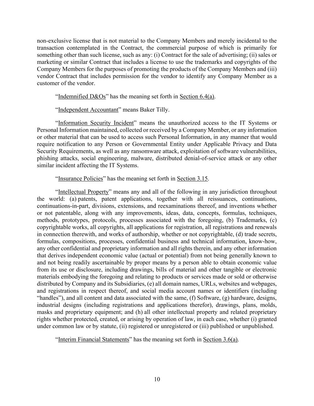 10 non-exclusive license that is not material to the Company Members and merely incidental to the transaction contemplated in the Contract, the commercial purpose of which is primarily for something other than such license, such as any: (i) Contract for the sale of advertising; (ii) sales or marketing or similar Contract that includes a license to use the trademarks and copyrights of the Company Members for the purposes of promoting the products of the Company Members and (iii) vendor Contract that includes permission for the vendor to identify any Company Member as a customer of the vendor. “Indemnified D&Os” has the meaning set forth in Section 6.4(a). “Independent Accountant” means Baker Tilly. “Information Security Incident” means the unauthorized access to the IT Systems or Personal Information maintained, collected or received by a Company Member, or any information or other material that can be used to access such Personal Information, in any manner that would require notification to any Person or Governmental Entity under Applicable Privacy and Data Security Requirements, as well as any ransomware attack, exploitation of software vulnerabilities, phishing attacks, social engineering, malware, distributed denial-of-service attack or any other similar incident affecting the IT Systems. “Insurance Policies” has the meaning set forth in Section 3.15. “Intellectual Property” means any and all of the following in any jurisdiction throughout the world: (a) patents, patent applications, together with all reissuances, continuations, continuations-in-part, divisions, extensions, and reexaminations thereof, and inventions whether or not patentable, along with any improvements, ideas, data, concepts, formulas, techniques, methods, prototypes, protocols, processes associated with the foregoing, (b) Trademarks, (c) copyrightable works, all copyrights, all applications for registration, all registrations and renewals in connection therewith, and works of authorship, whether or not copyrightable, (d) trade secrets, formulas, compositions, processes, confidential business and technical information, know-how, any other confidential and proprietary information and all rights therein, and any other information that derives independent economic value (actual or potential) from not being generally known to and not being readily ascertainable by proper means by a person able to obtain economic value from its use or disclosure, including drawings, bills of material and other tangible or electronic materials embodying the foregoing and relating to products or services made or sold or otherwise distributed by Company and its Subsidiaries, (e) all domain names, URLs, websites and webpages, and registrations in respect thereof, and social media account names or identifiers (including “handles”), and all content and data associated with the same, (f) Software, (g) hardware, designs, industrial designs (including registrations and applications therefor), drawings, plans, molds, masks and proprietary equipment; and (h) all other intellectual property and related proprietary rights whether protected, created, or arising by operation of law, in each case, whether (i) granted under common law or by statute, (ii) registered or unregistered or (iii) published or unpublished. “Interim Financial Statements” has the meaning set forth in Section 3.6(a).