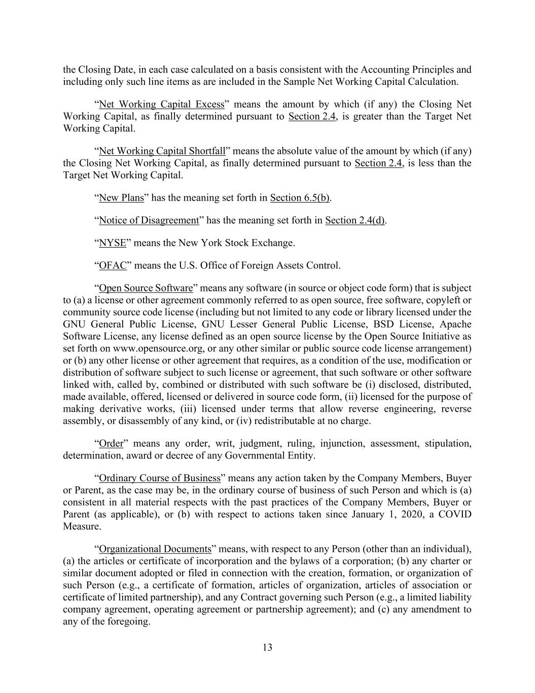 13 the Closing Date, in each case calculated on a basis consistent with the Accounting Principles and including only such line items as are included in the Sample Net Working Capital Calculation. “Net Working Capital Excess” means the amount by which (if any) the Closing Net Working Capital, as finally determined pursuant to Section 2.4, is greater than the Target Net Working Capital. “Net Working Capital Shortfall” means the absolute value of the amount by which (if any) the Closing Net Working Capital, as finally determined pursuant to Section 2.4, is less than the Target Net Working Capital. “New Plans” has the meaning set forth in Section 6.5(b). “Notice of Disagreement” has the meaning set forth in Section 2.4(d). “NYSE” means the New York Stock Exchange. “OFAC” means the U.S. Office of Foreign Assets Control. “Open Source Software” means any software (in source or object code form) that is subject to (a) a license or other agreement commonly referred to as open source, free software, copyleft or community source code license (including but not limited to any code or library licensed under the GNU General Public License, GNU Lesser General Public License, BSD License, Apache Software License, any license defined as an open source license by the Open Source Initiative as set forth on www.opensource.org, or any other similar or public source code license arrangement) or (b) any other license or other agreement that requires, as a condition of the use, modification or distribution of software subject to such license or agreement, that such software or other software linked with, called by, combined or distributed with such software be (i) disclosed, distributed, made available, offered, licensed or delivered in source code form, (ii) licensed for the purpose of making derivative works, (iii) licensed under terms that allow reverse engineering, reverse assembly, or disassembly of any kind, or (iv) redistributable at no charge. “Order” means any order, writ, judgment, ruling, injunction, assessment, stipulation, determination, award or decree of any Governmental Entity. “Ordinary Course of Business” means any action taken by the Company Members, Buyer or Parent, as the case may be, in the ordinary course of business of such Person and which is (a) consistent in all material respects with the past practices of the Company Members, Buyer or Parent (as applicable), or (b) with respect to actions taken since January 1, 2020, a COVID Measure. “Organizational Documents” means, with respect to any Person (other than an individual), (a) the articles or certificate of incorporation and the bylaws of a corporation; (b) any charter or similar document adopted or filed in connection with the creation, formation, or organization of such Person (e.g., a certificate of formation, articles of organization, articles of association or certificate of limited partnership), and any Contract governing such Person (e.g., a limited liability company agreement, operating agreement or partnership agreement); and (c) any amendment to any of the foregoing.