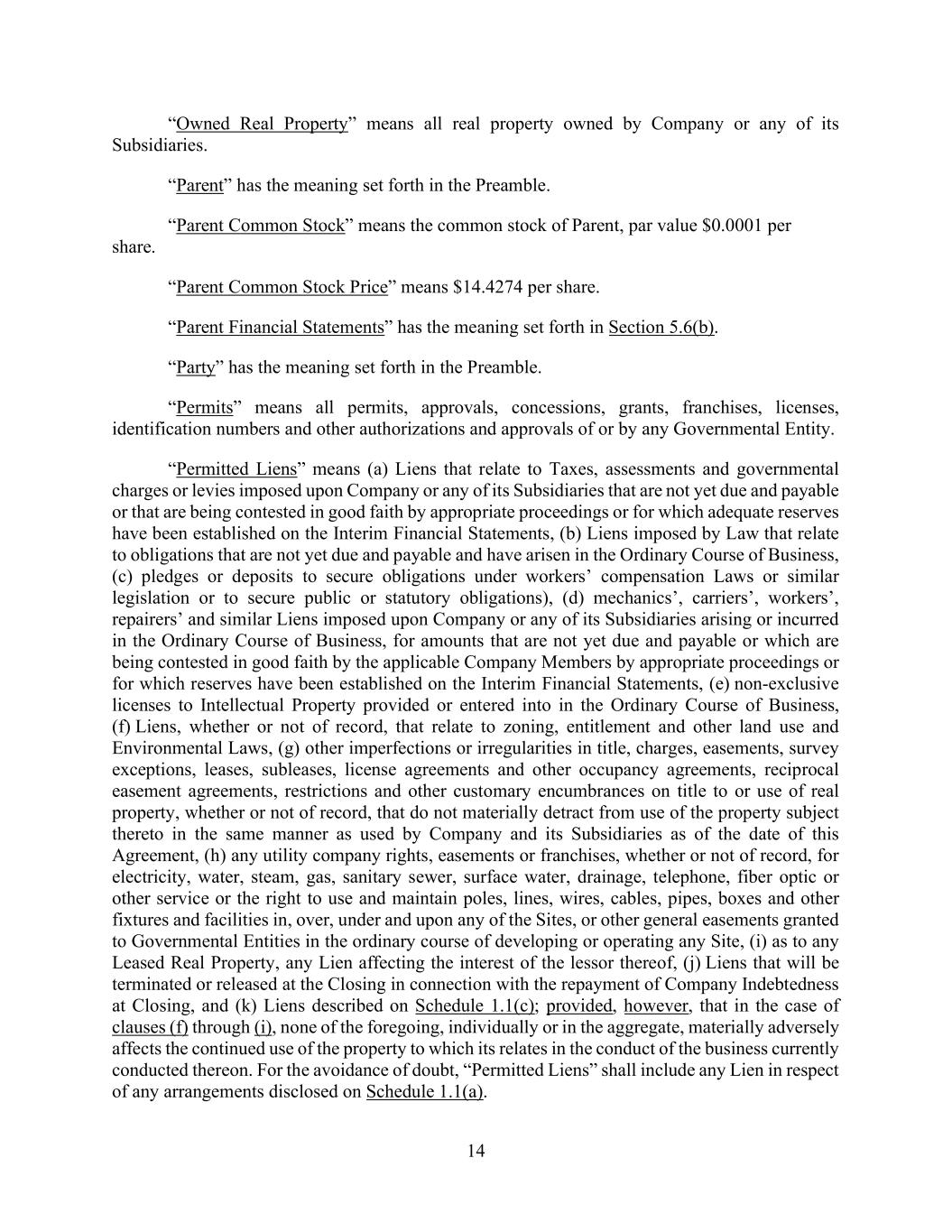 14 “Owned Real Property” means all real property owned by Company or any of its Subsidiaries. “Parent” has the meaning set forth in the Preamble. “Parent Common Stock” means the common stock of Parent, par value $0.0001 per share. “Parent Common Stock Price” means $14.4274 per share. “Parent Financial Statements” has the meaning set forth in Section 5.6(b). “Party” has the meaning set forth in the Preamble. “Permits” means all permits, approvals, concessions, grants, franchises, licenses, identification numbers and other authorizations and approvals of or by any Governmental Entity. “Permitted Liens” means (a) Liens that relate to Taxes, assessments and governmental charges or levies imposed upon Company or any of its Subsidiaries that are not yet due and payable or that are being contested in good faith by appropriate proceedings or for which adequate reserves have been established on the Interim Financial Statements, (b) Liens imposed by Law that relate to obligations that are not yet due and payable and have arisen in the Ordinary Course of Business, (c) pledges or deposits to secure obligations under workers’ compensation Laws or similar legislation or to secure public or statutory obligations), (d) mechanics’, carriers’, workers’, repairers’ and similar Liens imposed upon Company or any of its Subsidiaries arising or incurred in the Ordinary Course of Business, for amounts that are not yet due and payable or which are being contested in good faith by the applicable Company Members by appropriate proceedings or for which reserves have been established on the Interim Financial Statements, (e) non-exclusive licenses to Intellectual Property provided or entered into in the Ordinary Course of Business, (f) Liens, whether or not of record, that relate to zoning, entitlement and other land use and Environmental Laws, (g) other imperfections or irregularities in title, charges, easements, survey exceptions, leases, subleases, license agreements and other occupancy agreements, reciprocal easement agreements, restrictions and other customary encumbrances on title to or use of real property, whether or not of record, that do not materially detract from use of the property subject thereto in the same manner as used by Company and its Subsidiaries as of the date of this Agreement, (h) any utility company rights, easements or franchises, whether or not of record, for electricity, water, steam, gas, sanitary sewer, surface water, drainage, telephone, fiber optic or other service or the right to use and maintain poles, lines, wires, cables, pipes, boxes and other fixtures and facilities in, over, under and upon any of the Sites, or other general easements granted to Governmental Entities in the ordinary course of developing or operating any Site, (i) as to any Leased Real Property, any Lien affecting the interest of the lessor thereof, (j) Liens that will be terminated or released at the Closing in connection with the repayment of Company Indebtedness at Closing, and (k) Liens described on Schedule 1.1(c); provided, however, that in the case of clauses (f) through (i), none of the foregoing, individually or in the aggregate, materially adversely affects the continued use of the property to which its relates in the conduct of the business currently conducted thereon. For the avoidance of doubt, “Permitted Liens” shall include any Lien in respect of any arrangements disclosed on Schedule 1.1(a).