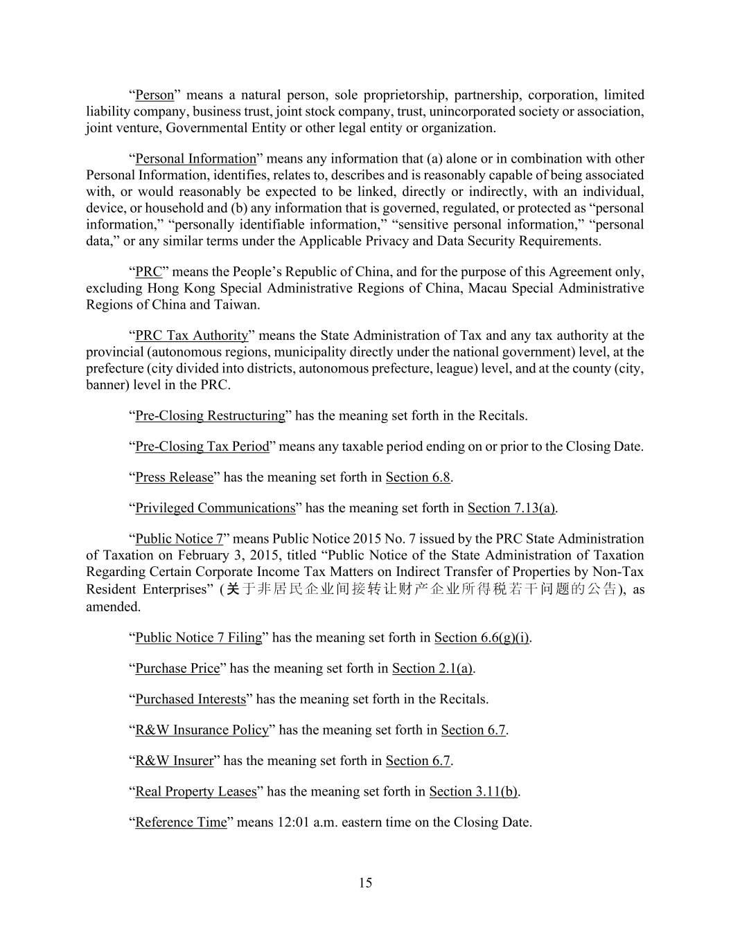 15 “Person” means a natural person, sole proprietorship, partnership, corporation, limited liability company, business trust, joint stock company, trust, unincorporated society or association, joint venture, Governmental Entity or other legal entity or organization. “Personal Information” means any information that (a) alone or in combination with other Personal Information, identifies, relates to, describes and is reasonably capable of being associated with, or would reasonably be expected to be linked, directly or indirectly, with an individual, device, or household and (b) any information that is governed, regulated, or protected as “personal information,” “personally identifiable information,” “sensitive personal information,” “personal data,” or any similar terms under the Applicable Privacy and Data Security Requirements. “PRC” means the People’s Republic of China, and for the purpose of this Agreement only, excluding Hong Kong Special Administrative Regions of China, Macau Special Administrative Regions of China and Taiwan. “PRC Tax Authority” means the State Administration of Tax and any tax authority at the provincial (autonomous regions, municipality directly under the national government) level, at the prefecture (city divided into districts, autonomous prefecture, league) level, and at the county (city, banner) level in the PRC. “Pre-Closing Restructuring” has the meaning set forth in the Recitals. “Pre-Closing Tax Period” means any taxable period ending on or prior to the Closing Date. “Press Release” has the meaning set forth in Section 6.8. “Privileged Communications” has the meaning set forth in Section 7.13(a). “Public Notice 7” means Public Notice 2015 No. 7 issued by the PRC State Administration of Taxation on February 3, 2015, titled “Public Notice of the State Administration of Taxation Regarding Certain Corporate Income Tax Matters on Indirect Transfer of Properties by Non-Tax Resident Enterprises” (关于非居民企业间接转让财产企业所得税若干问题的公告), as amended. “Public Notice 7 Filing” has the meaning set forth in Section 6.6(g)(i). “Purchase Price” has the meaning set forth in Section 2.1(a). “Purchased Interests” has the meaning set forth in the Recitals. “R&W Insurance Policy” has the meaning set forth in Section 6.7. “R&W Insurer” has the meaning set forth in Section 6.7. “Real Property Leases” has the meaning set forth in Section 3.11(b). “Reference Time” means 12:01 a.m. eastern time on the Closing Date.