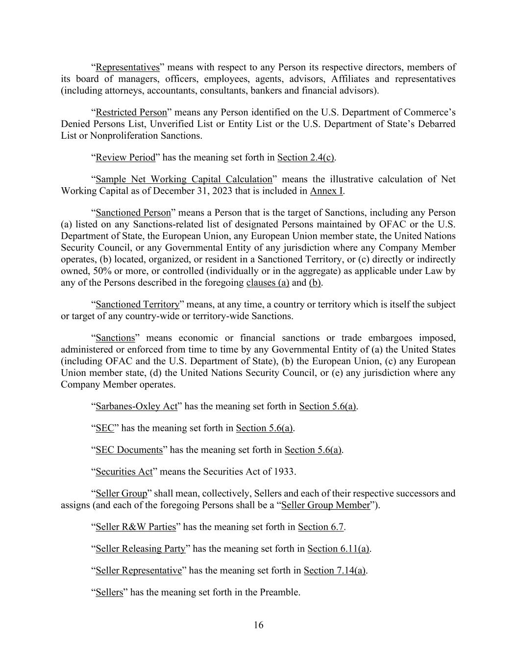 16 “Representatives” means with respect to any Person its respective directors, members of its board of managers, officers, employees, agents, advisors, Affiliates and representatives (including attorneys, accountants, consultants, bankers and financial advisors). “Restricted Person” means any Person identified on the U.S. Department of Commerce’s Denied Persons List, Unverified List or Entity List or the U.S. Department of State’s Debarred List or Nonproliferation Sanctions. “Review Period” has the meaning set forth in Section 2.4(c). “Sample Net Working Capital Calculation” means the illustrative calculation of Net Working Capital as of December 31, 2023 that is included in Annex I. “Sanctioned Person” means a Person that is the target of Sanctions, including any Person (a) listed on any Sanctions-related list of designated Persons maintained by OFAC or the U.S. Department of State, the European Union, any European Union member state, the United Nations Security Council, or any Governmental Entity of any jurisdiction where any Company Member operates, (b) located, organized, or resident in a Sanctioned Territory, or (c) directly or indirectly owned, 50% or more, or controlled (individually or in the aggregate) as applicable under Law by any of the Persons described in the foregoing clauses (a) and (b). “Sanctioned Territory” means, at any time, a country or territory which is itself the subject or target of any country-wide or territory-wide Sanctions. “Sanctions” means economic or financial sanctions or trade embargoes imposed, administered or enforced from time to time by any Governmental Entity of (a) the United States (including OFAC and the U.S. Department of State), (b) the European Union, (c) any European Union member state, (d) the United Nations Security Council, or (e) any jurisdiction where any Company Member operates. “Sarbanes-Oxley Act” has the meaning set forth in Section 5.6(a). “SEC” has the meaning set forth in Section 5.6(a). “SEC Documents” has the meaning set forth in Section 5.6(a). “Securities Act” means the Securities Act of 1933. “Seller Group” shall mean, collectively, Sellers and each of their respective successors and assigns (and each of the foregoing Persons shall be a “Seller Group Member”). “Seller R&W Parties” has the meaning set forth in Section 6.7. “Seller Releasing Party” has the meaning set forth in Section 6.11(a). “Seller Representative” has the meaning set forth in Section 7.14(a). “Sellers” has the meaning set forth in the Preamble.