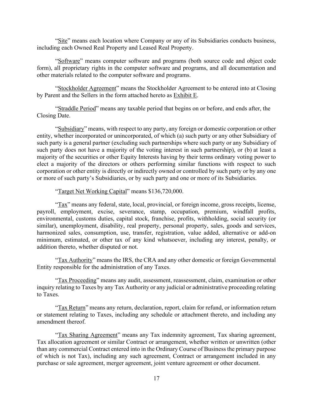 17 “Site” means each location where Company or any of its Subsidiaries conducts business, including each Owned Real Property and Leased Real Property. “Software” means computer software and programs (both source code and object code form), all proprietary rights in the computer software and programs, and all documentation and other materials related to the computer software and programs. “Stockholder Agreement” means the Stockholder Agreement to be entered into at Closing by Parent and the Sellers in the form attached hereto as Exhibit E. “Straddle Period” means any taxable period that begins on or before, and ends after, the Closing Date. “Subsidiary” means, with respect to any party, any foreign or domestic corporation or other entity, whether incorporated or unincorporated, of which (a) such party or any other Subsidiary of such party is a general partner (excluding such partnerships where such party or any Subsidiary of such party does not have a majority of the voting interest in such partnership), or (b) at least a majority of the securities or other Equity Interests having by their terms ordinary voting power to elect a majority of the directors or others performing similar functions with respect to such corporation or other entity is directly or indirectly owned or controlled by such party or by any one or more of such party’s Subsidiaries, or by such party and one or more of its Subsidiaries. “Target Net Working Capital” means $136,720,000. “Tax” means any federal, state, local, provincial, or foreign income, gross receipts, license, payroll, employment, excise, severance, stamp, occupation, premium, windfall profits, environmental, customs duties, capital stock, franchise, profits, withholding, social security (or similar), unemployment, disability, real property, personal property, sales, goods and services, harmonized sales, consumption, use, transfer, registration, value added, alternative or add-on minimum, estimated, or other tax of any kind whatsoever, including any interest, penalty, or addition thereto, whether disputed or not. “Tax Authority” means the IRS, the CRA and any other domestic or foreign Governmental Entity responsible for the administration of any Taxes. “Tax Proceeding” means any audit, assessment, reassessment, claim, examination or other inquiry relating to Taxes by any Tax Authority or any judicial or administrative proceeding relating to Taxes. “Tax Return” means any return, declaration, report, claim for refund, or information return or statement relating to Taxes, including any schedule or attachment thereto, and including any amendment thereof. “Tax Sharing Agreement” means any Tax indemnity agreement, Tax sharing agreement, Tax allocation agreement or similar Contract or arrangement, whether written or unwritten (other than any commercial Contract entered into in the Ordinary Course of Business the primary purpose of which is not Tax), including any such agreement, Contract or arrangement included in any purchase or sale agreement, merger agreement, joint venture agreement or other document.