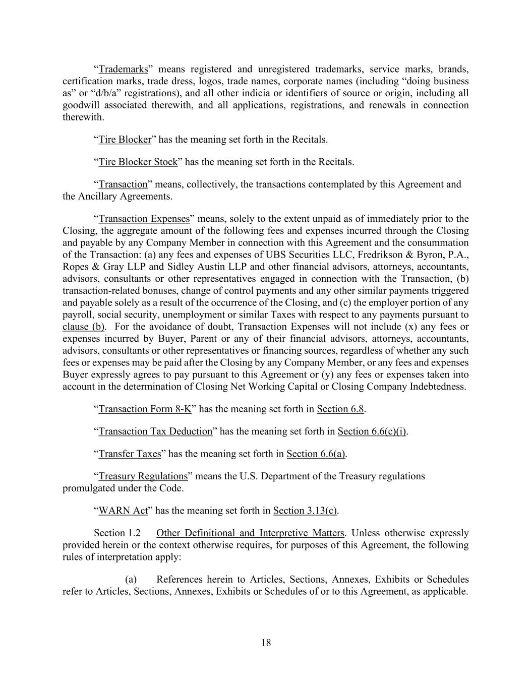 18 “Trademarks” means registered and unregistered trademarks, service marks, brands, certification marks, trade dress, logos, trade names, corporate names (including “doing business as” or “d/b/a” registrations), and all other indicia or identifiers of source or origin, including all goodwill associated therewith, and all applications, registrations, and renewals in connection therewith. “Tire Blocker” has the meaning set forth in the Recitals. “Tire Blocker Stock” has the meaning set forth in the Recitals. “Transaction” means, collectively, the transactions contemplated by this Agreement and the Ancillary Agreements. “Transaction Expenses” means, solely to the extent unpaid as of immediately prior to the Closing, the aggregate amount of the following fees and expenses incurred through the Closing and payable by any Company Member in connection with this Agreement and the consummation of the Transaction: (a) any fees and expenses of UBS Securities LLC, Fredrikson & Byron, P.A., Ropes & Gray LLP and Sidley Austin LLP and other financial advisors, attorneys, accountants, advisors, consultants or other representatives engaged in connection with the Transaction, (b) transaction-related bonuses, change of control payments and any other similar payments triggered and payable solely as a result of the occurrence of the Closing, and (c) the employer portion of any payroll, social security, unemployment or similar Taxes with respect to any payments pursuant to clause (b). For the avoidance of doubt, Transaction Expenses will not include (x) any fees or expenses incurred by Buyer, Parent or any of their financial advisors, attorneys, accountants, advisors, consultants or other representatives or financing sources, regardless of whether any such fees or expenses may be paid after the Closing by any Company Member, or any fees and expenses Buyer expressly agrees to pay pursuant to this Agreement or (y) any fees or expenses taken into account in the determination of Closing Net Working Capital or Closing Company Indebtedness. “Transaction Form 8-K” has the meaning set forth in Section 6.8. “Transaction Tax Deduction” has the meaning set forth in Section 6.6(c)(i). “Transfer Taxes” has the meaning set forth in Section 6.6(a). “Treasury Regulations” means the U.S. Department of the Treasury regulations promulgated under the Code. “WARN Act” has the meaning set forth in Section 3.13(c). Section 1.2 Other Definitional and Interpretive Matters. Unless otherwise expressly provided herein or the context otherwise requires, for purposes of this Agreement, the following rules of interpretation apply: (a) References herein to Articles, Sections, Annexes, Exhibits or Schedules refer to Articles, Sections, Annexes, Exhibits or Schedules of or to this Agreement, as applicable.