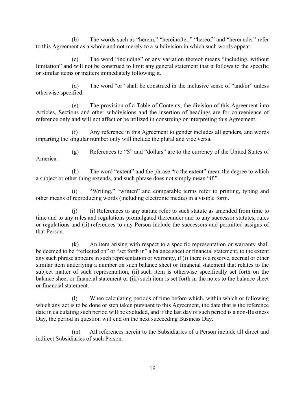 19 (b) The words such as “herein,” “hereinafter,” “hereof” and “hereunder” refer to this Agreement as a whole and not merely to a subdivision in which such words appear. (c) The word “including” or any variation thereof means “including, without limitation” and will not be construed to limit any general statement that it follows to the specific or similar items or matters immediately following it. (d) The word “or” shall be construed in the inclusive sense of “and/or” unless otherwise specified. (e) The provision of a Table of Contents, the division of this Agreement into Articles, Sections and other subdivisions and the insertion of headings are for convenience of reference only and will not affect or be utilized in construing or interpreting this Agreement. (f) Any reference in this Agreement to gender includes all genders, and words imparting the singular number only will include the plural and vice versa. (g) References to “$” and “dollars” are to the currency of the United States of America. (h) The word “extent” and the phrase “to the extent” mean the degree to which a subject or other thing extends, and such phrase does not simply mean “if.” (i) “Writing,” “written” and comparable terms refer to printing, typing and other means of reproducing words (including electronic media) in a visible form. (j) (i) References to any statute refer to such statute as amended from time to time and to any rules and regulations promulgated thereunder and to any successor statutes, rules or regulations and (ii) references to any Person include the successors and permitted assigns of that Person. (k) An item arising with respect to a specific representation or warranty shall be deemed to be “reflected on” or “set forth in” a balance sheet or financial statement, to the extent any such phrase appears in such representation or warranty, if (i) there is a reserve, accrual or other similar item underlying a number on such balance sheet or financial statement that relates to the subject matter of such representation, (ii) such item is otherwise specifically set forth on the balance sheet or financial statement or (iii) such item is set forth in the notes to the balance sheet or financial statement. (l) When calculating periods of time before which, within which or following which any act is to be done or step taken pursuant to this Agreement, the date that is the reference date in calculating such period will be excluded, and if the last day of such period is a non-Business Day, the period in question will end on the next succeeding Business Day. (m) All references herein to the Subsidiaries of a Person include all direct and indirect Subsidiaries of such Person.