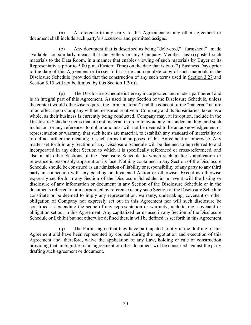 20 (n) A reference to any party to this Agreement or any other agreement or document shall include such party’s successors and permitted assigns. (o) Any document that is described as being “delivered,” “furnished,” “made available” or similarly means that the Sellers or any Company Member has (i) posted such materials to the Data Room, in a manner that enables viewing of such materials by Buyer or its Representatives prior to 5:00 p.m. (Eastern Time) on the date that is two (2) Business Days prior to the date of this Agreement or (ii) set forth a true and complete copy of such materials in the Disclosure Schedule (provided that the construction of any such terms used in Section 3.27 and Section 5.15 will not be limited by this Section 1.2(o)). (p) The Disclosure Schedule is hereby incorporated and made a part hereof and is an integral part of this Agreement. As used in any Section of the Disclosure Schedule, unless the context would otherwise require, the term “material” and the concept of the “material” nature of an effect upon Company will be measured relative to Company and its Subsidiaries, taken as a whole, as their business is currently being conducted. Company may, at its option, include in the Disclosure Schedule items that are not material in order to avoid any misunderstanding, and such inclusion, or any references to dollar amounts, will not be deemed to be an acknowledgement or representation or warranty that such items are material, to establish any standard of materiality or to define further the meaning of such terms for purposes of this Agreement or otherwise. Any matter set forth in any Section of any Disclosure Schedule will be deemed to be referred to and incorporated in any other Section to which it is specifically referenced or cross-referenced, and also in all other Sections of the Disclosure Schedule to which such matter’s application or relevance is reasonably apparent on its face. Nothing contained in any Section of the Disclosure Schedule should be construed as an admission of liability or responsibility of any party to any third party in connection with any pending or threatened Action or otherwise. Except as otherwise expressly set forth in any Section of the Disclosure Schedule, in no event will the listing or disclosure of any information or document in any Section of the Disclosure Schedule or in the documents referred to or incorporated by reference in any such Section of the Disclosure Schedule constitute or be deemed to imply any representation, warranty, undertaking, covenant or other obligation of Company not expressly set out in this Agreement nor will such disclosure be construed as extending the scope of any representation or warranty, undertaking, covenant or obligation set out in this Agreement. Any capitalized terms used in any Section of the Disclosure Schedule or Exhibit but not otherwise defined therein will be defined as set forth in this Agreement. (q) The Parties agree that they have participated jointly in the drafting of this Agreement and have been represented by counsel during the negotiation and execution of this Agreement and, therefore, waive the application of any Law, holding or rule of construction providing that ambiguities in an agreement or other document will be construed against the party drafting such agreement or document.