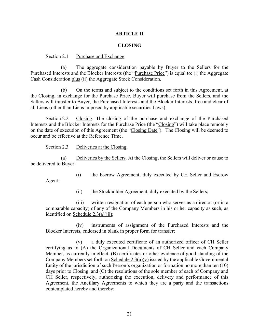 21 ARTICLE II CLOSING Section 2.1 Purchase and Exchange. (a) The aggregate consideration payable by Buyer to the Sellers for the Purchased Interests and the Blocker Interests (the “Purchase Price”) is equal to: (i) the Aggregate Cash Consideration plus (ii) the Aggregate Stock Consideration. (b) On the terms and subject to the conditions set forth in this Agreement, at the Closing, in exchange for the Purchase Price, Buyer will purchase from the Sellers, and the Sellers will transfer to Buyer, the Purchased Interests and the Blocker Interests, free and clear of all Liens (other than Liens imposed by applicable securities Laws). Section 2.2 Closing. The closing of the purchase and exchange of the Purchased Interests and the Blocker Interests for the Purchase Price (the “Closing”) will take place remotely on the date of execution of this Agreement (the “Closing Date”). The Closing will be deemed to occur and be effective at the Reference Time. Section 2.3 Deliveries at the Closing. (a) Deliveries by the Sellers. At the Closing, the Sellers will deliver or cause to be delivered to Buyer: (i) the Escrow Agreement, duly executed by CH Seller and Escrow Agent; (ii) the Stockholder Agreement, duly executed by the Sellers; (iii) written resignation of each person who serves as a director (or in a comparable capacity) of any of the Company Members in his or her capacity as such, as identified on Schedule 2.3(a)(iii); (iv) instruments of assignment of the Purchased Interests and the Blocker Interests, endorsed in blank in proper form for transfer; (v) a duly executed certificate of an authorized officer of CH Seller certifying as to (A) the Organizational Documents of CH Seller and each Company Member, as currently in effect, (B) certificates or other evidence of good standing of the Company Members set forth on Schedule 2.3(a)(v) issued by the applicable Governmental Entity of the jurisdiction of such Person’s organization or formation no more than ten (10) days prior to Closing, and (C) the resolutions of the sole member of each of Company and CH Seller, respectively, authorizing the execution, delivery and performance of this Agreement, the Ancillary Agreements to which they are a party and the transactions contemplated hereby and thereby;