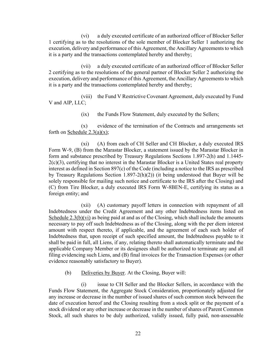 22 (vi) a duly executed certificate of an authorized officer of Blocker Seller 1 certifying as to the resolutions of the sole member of Blocker Seller 1 authorizing the execution, delivery and performance of this Agreement, the Ancillary Agreements to which it is a party and the transactions contemplated hereby and thereby; (vii) a duly executed certificate of an authorized officer of Blocker Seller 2 certifying as to the resolutions of the general partner of Blocker Seller 2 authorizing the execution, delivery and performance of this Agreement, the Ancillary Agreements to which it is a party and the transactions contemplated hereby and thereby; (viii) the Fund V Restrictive Covenant Agreement, duly executed by Fund V and AIP, LLC; (ix) the Funds Flow Statement, duly executed by the Sellers; (x) evidence of the termination of the Contracts and arrangements set forth on Schedule 2.3(a)(x); (xi) (A) from each of CH Seller and CH Blocker, a duly executed IRS Form W-9, (B) from the Marastar Blocker, a statement issued by the Marastar Blocker in form and substance prescribed by Treasury Regulations Sections 1.897-2(h) and 1.1445- 2(c)(3), certifying that no interest in the Marastar Blocker is a United States real property interest as defined in Section 897(c) of the Code (including a notice to the IRS as prescribed by Treasury Regulations Section 1.897-2(h)(2)) (it being understood that Buyer will be solely responsible for mailing such notice and certificate to the IRS after the Closing) and (C) from Tire Blocker, a duly executed IRS Form W-8BEN-E, certifying its status as a foreign entity; and (xii) (A) customary payoff letters in connection with repayment of all Indebtedness under the Credit Agreement and any other Indebtedness items listed on Schedule 2.3(b)(vi) as being paid at and as of the Closing, which shall include the amounts necessary to pay off such Indebtedness as of the Closing, along with the per diem interest amount with respect thereto, if applicable, and the agreement of each such holder of Indebtedness that, upon receipt of such specified amount, the Indebtedness payable to it shall be paid in full, all Liens, if any, relating thereto shall automatically terminate and the applicable Company Member or its designees shall be authorized to terminate any and all filing evidencing such Liens, and (B) final invoices for the Transaction Expenses (or other evidence reasonably satisfactory to Buyer). (b) Deliveries by Buyer. At the Closing, Buyer will: (i) issue to CH Seller and the Blocker Sellers, in accordance with the Funds Flow Statement, the Aggregate Stock Consideration, proportionately adjusted for any increase or decrease in the number of issued shares of such common stock between the date of execution hereof and the Closing resulting from a stock split or the payment of a stock dividend or any other increase or decrease in the number of shares of Parent Common Stock, all such shares to be duly authorized, validly issued, fully paid, non-assessable