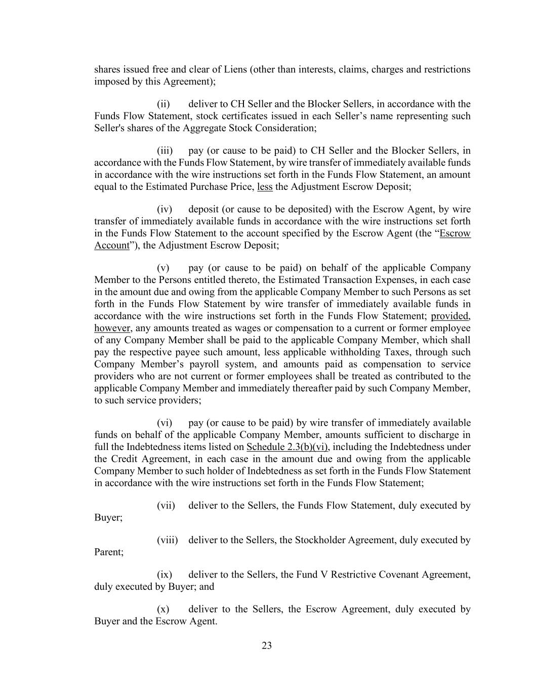 23 shares issued free and clear of Liens (other than interests, claims, charges and restrictions imposed by this Agreement); (ii) deliver to CH Seller and the Blocker Sellers, in accordance with the Funds Flow Statement, stock certificates issued in each Seller’s name representing such Seller's shares of the Aggregate Stock Consideration; (iii) pay (or cause to be paid) to CH Seller and the Blocker Sellers, in accordance with the Funds Flow Statement, by wire transfer of immediately available funds in accordance with the wire instructions set forth in the Funds Flow Statement, an amount equal to the Estimated Purchase Price, less the Adjustment Escrow Deposit; (iv) deposit (or cause to be deposited) with the Escrow Agent, by wire transfer of immediately available funds in accordance with the wire instructions set forth in the Funds Flow Statement to the account specified by the Escrow Agent (the “Escrow Account”), the Adjustment Escrow Deposit; (v) pay (or cause to be paid) on behalf of the applicable Company Member to the Persons entitled thereto, the Estimated Transaction Expenses, in each case in the amount due and owing from the applicable Company Member to such Persons as set forth in the Funds Flow Statement by wire transfer of immediately available funds in accordance with the wire instructions set forth in the Funds Flow Statement; provided, however, any amounts treated as wages or compensation to a current or former employee of any Company Member shall be paid to the applicable Company Member, which shall pay the respective payee such amount, less applicable withholding Taxes, through such Company Member’s payroll system, and amounts paid as compensation to service providers who are not current or former employees shall be treated as contributed to the applicable Company Member and immediately thereafter paid by such Company Member, to such service providers; (vi) pay (or cause to be paid) by wire transfer of immediately available funds on behalf of the applicable Company Member, amounts sufficient to discharge in full the Indebtedness items listed on Schedule 2.3(b)(vi), including the Indebtedness under the Credit Agreement, in each case in the amount due and owing from the applicable Company Member to such holder of Indebtedness as set forth in the Funds Flow Statement in accordance with the wire instructions set forth in the Funds Flow Statement; (vii) deliver to the Sellers, the Funds Flow Statement, duly executed by Buyer; (viii) deliver to the Sellers, the Stockholder Agreement, duly executed by Parent; (ix) deliver to the Sellers, the Fund V Restrictive Covenant Agreement, duly executed by Buyer; and (x) deliver to the Sellers, the Escrow Agreement, duly executed by Buyer and the Escrow Agent.