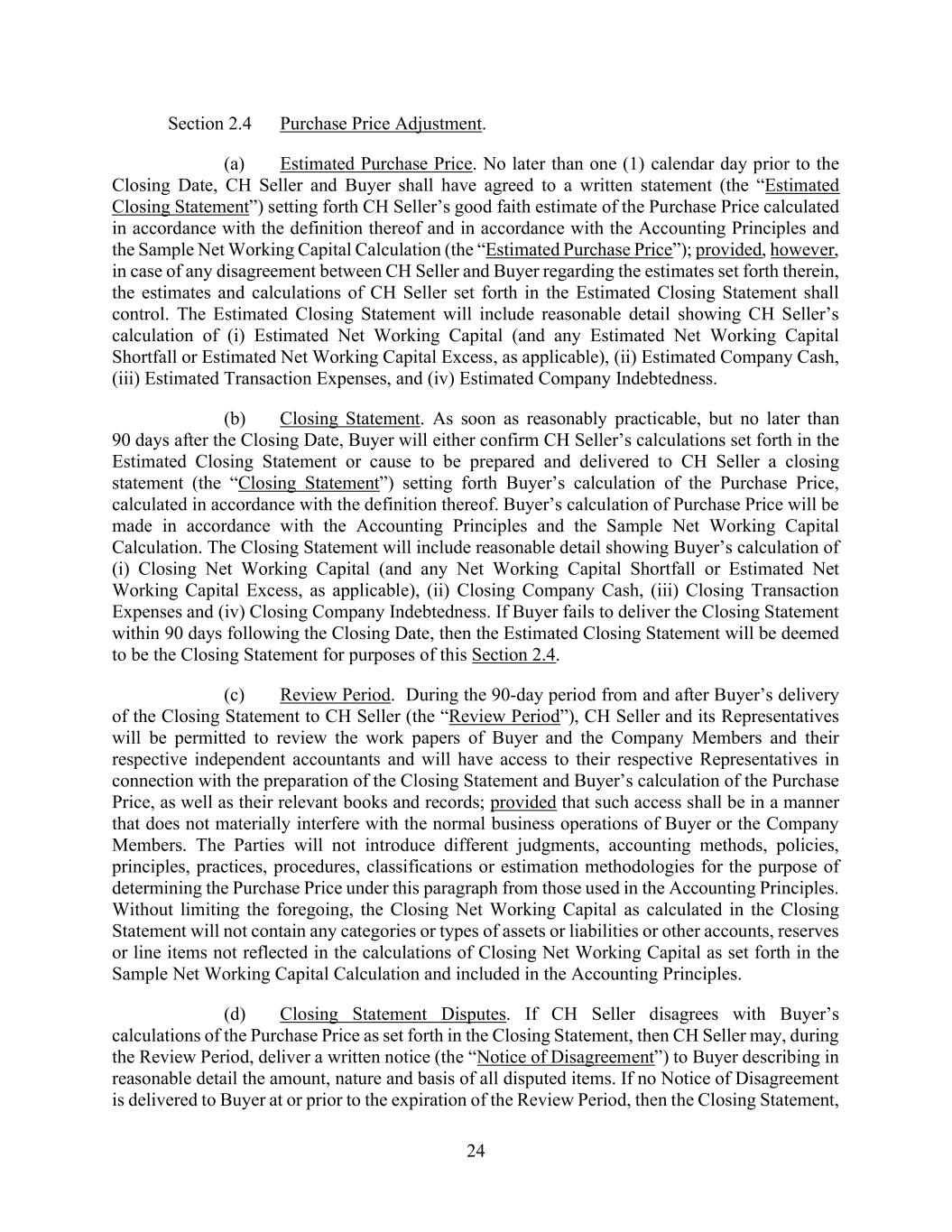 24 Section 2.4 Purchase Price Adjustment. (a) Estimated Purchase Price. No later than one (1) calendar day prior to the Closing Date, CH Seller and Buyer shall have agreed to a written statement (the “Estimated Closing Statement”) setting forth CH Seller’s good faith estimate of the Purchase Price calculated in accordance with the definition thereof and in accordance with the Accounting Principles and the Sample Net Working Capital Calculation (the “Estimated Purchase Price”); provided, however, in case of any disagreement between CH Seller and Buyer regarding the estimates set forth therein, the estimates and calculations of CH Seller set forth in the Estimated Closing Statement shall control. The Estimated Closing Statement will include reasonable detail showing CH Seller’s calculation of (i) Estimated Net Working Capital (and any Estimated Net Working Capital Shortfall or Estimated Net Working Capital Excess, as applicable), (ii) Estimated Company Cash, (iii) Estimated Transaction Expenses, and (iv) Estimated Company Indebtedness. (b) Closing Statement. As soon as reasonably practicable, but no later than 90 days after the Closing Date, Buyer will either confirm CH Seller’s calculations set forth in the Estimated Closing Statement or cause to be prepared and delivered to CH Seller a closing statement (the “Closing Statement”) setting forth Buyer’s calculation of the Purchase Price, calculated in accordance with the definition thereof. Buyer’s calculation of Purchase Price will be made in accordance with the Accounting Principles and the Sample Net Working Capital Calculation. The Closing Statement will include reasonable detail showing Buyer’s calculation of (i) Closing Net Working Capital (and any Net Working Capital Shortfall or Estimated Net Working Capital Excess, as applicable), (ii) Closing Company Cash, (iii) Closing Transaction Expenses and (iv) Closing Company Indebtedness. If Buyer fails to deliver the Closing Statement within 90 days following the Closing Date, then the Estimated Closing Statement will be deemed to be the Closing Statement for purposes of this Section 2.4. (c) Review Period. During the 90-day period from and after Buyer’s delivery of the Closing Statement to CH Seller (the “Review Period”), CH Seller and its Representatives will be permitted to review the work papers of Buyer and the Company Members and their respective independent accountants and will have access to their respective Representatives in connection with the preparation of the Closing Statement and Buyer’s calculation of the Purchase Price, as well as their relevant books and records; provided that such access shall be in a manner that does not materially interfere with the normal business operations of Buyer or the Company Members. The Parties will not introduce different judgments, accounting methods, policies, principles, practices, procedures, classifications or estimation methodologies for the purpose of determining the Purchase Price under this paragraph from those used in the Accounting Principles. Without limiting the foregoing, the Closing Net Working Capital as calculated in the Closing Statement will not contain any categories or types of assets or liabilities or other accounts, reserves or line items not reflected in the calculations of Closing Net Working Capital as set forth in the Sample Net Working Capital Calculation and included in the Accounting Principles. (d) Closing Statement Disputes. If CH Seller disagrees with Buyer’s calculations of the Purchase Price as set forth in the Closing Statement, then CH Seller may, during the Review Period, deliver a written notice (the “Notice of Disagreement”) to Buyer describing in reasonable detail the amount, nature and basis of all disputed items. If no Notice of Disagreement is delivered to Buyer at or prior to the expiration of the Review Period, then the Closing Statement,
