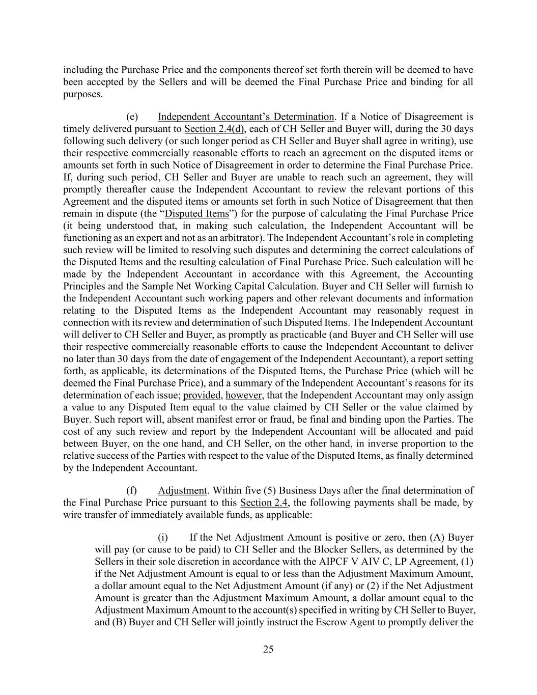 25 including the Purchase Price and the components thereof set forth therein will be deemed to have been accepted by the Sellers and will be deemed the Final Purchase Price and binding for all purposes. (e) Independent Accountant’s Determination. If a Notice of Disagreement is timely delivered pursuant to Section 2.4(d), each of CH Seller and Buyer will, during the 30 days following such delivery (or such longer period as CH Seller and Buyer shall agree in writing), use their respective commercially reasonable efforts to reach an agreement on the disputed items or amounts set forth in such Notice of Disagreement in order to determine the Final Purchase Price. If, during such period, CH Seller and Buyer are unable to reach such an agreement, they will promptly thereafter cause the Independent Accountant to review the relevant portions of this Agreement and the disputed items or amounts set forth in such Notice of Disagreement that then remain in dispute (the “Disputed Items”) for the purpose of calculating the Final Purchase Price (it being understood that, in making such calculation, the Independent Accountant will be functioning as an expert and not as an arbitrator). The Independent Accountant’s role in completing such review will be limited to resolving such disputes and determining the correct calculations of the Disputed Items and the resulting calculation of Final Purchase Price. Such calculation will be made by the Independent Accountant in accordance with this Agreement, the Accounting Principles and the Sample Net Working Capital Calculation. Buyer and CH Seller will furnish to the Independent Accountant such working papers and other relevant documents and information relating to the Disputed Items as the Independent Accountant may reasonably request in connection with its review and determination of such Disputed Items. The Independent Accountant will deliver to CH Seller and Buyer, as promptly as practicable (and Buyer and CH Seller will use their respective commercially reasonable efforts to cause the Independent Accountant to deliver no later than 30 days from the date of engagement of the Independent Accountant), a report setting forth, as applicable, its determinations of the Disputed Items, the Purchase Price (which will be deemed the Final Purchase Price), and a summary of the Independent Accountant’s reasons for its determination of each issue; provided, however, that the Independent Accountant may only assign a value to any Disputed Item equal to the value claimed by CH Seller or the value claimed by Buyer. Such report will, absent manifest error or fraud, be final and binding upon the Parties. The cost of any such review and report by the Independent Accountant will be allocated and paid between Buyer, on the one hand, and CH Seller, on the other hand, in inverse proportion to the relative success of the Parties with respect to the value of the Disputed Items, as finally determined by the Independent Accountant. (f) Adjustment. Within five (5) Business Days after the final determination of the Final Purchase Price pursuant to this Section 2.4, the following payments shall be made, by wire transfer of immediately available funds, as applicable: (i) If the Net Adjustment Amount is positive or zero, then (A) Buyer will pay (or cause to be paid) to CH Seller and the Blocker Sellers, as determined by the Sellers in their sole discretion in accordance with the AIPCF V AIV C, LP Agreement, (1) if the Net Adjustment Amount is equal to or less than the Adjustment Maximum Amount, a dollar amount equal to the Net Adjustment Amount (if any) or (2) if the Net Adjustment Amount is greater than the Adjustment Maximum Amount, a dollar amount equal to the Adjustment Maximum Amount to the account(s) specified in writing by CH Seller to Buyer, and (B) Buyer and CH Seller will jointly instruct the Escrow Agent to promptly deliver the