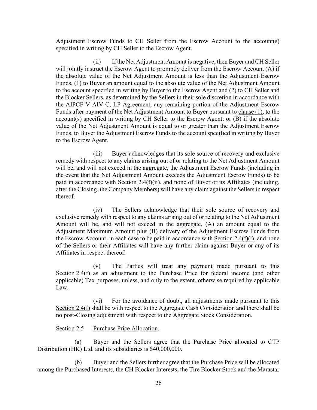 26 Adjustment Escrow Funds to CH Seller from the Escrow Account to the account(s) specified in writing by CH Seller to the Escrow Agent. (ii) If the Net Adjustment Amount is negative, then Buyer and CH Seller will jointly instruct the Escrow Agent to promptly deliver from the Escrow Account (A) if the absolute value of the Net Adjustment Amount is less than the Adjustment Escrow Funds, (1) to Buyer an amount equal to the absolute value of the Net Adjustment Amount to the account specified in writing by Buyer to the Escrow Agent and (2) to CH Seller and the Blocker Sellers, as determined by the Sellers in their sole discretion in accordance with the AIPCF V AIV C, LP Agreement, any remaining portion of the Adjustment Escrow Funds after payment of the Net Adjustment Amount to Buyer pursuant to clause (1), to the account(s) specified in writing by CH Seller to the Escrow Agent; or (B) if the absolute value of the Net Adjustment Amount is equal to or greater than the Adjustment Escrow Funds, to Buyer the Adjustment Escrow Funds to the account specified in writing by Buyer to the Escrow Agent. (iii) Buyer acknowledges that its sole source of recovery and exclusive remedy with respect to any claims arising out of or relating to the Net Adjustment Amount will be, and will not exceed in the aggregate, the Adjustment Escrow Funds (including in the event that the Net Adjustment Amount exceeds the Adjustment Escrow Funds) to be paid in accordance with Section 2.4(f)(ii), and none of Buyer or its Affiliates (including, after the Closing, the Company Members) will have any claim against the Sellers in respect thereof. (iv) The Sellers acknowledge that their sole source of recovery and exclusive remedy with respect to any claims arising out of or relating to the Net Adjustment Amount will be, and will not exceed in the aggregate, (A) an amount equal to the Adjustment Maximum Amount plus (B) delivery of the Adjustment Escrow Funds from the Escrow Account, in each case to be paid in accordance with Section 2.4(f)(i), and none of the Sellers or their Affiliates will have any further claim against Buyer or any of its Affiliates in respect thereof. (v) The Parties will treat any payment made pursuant to this Section 2.4(f) as an adjustment to the Purchase Price for federal income (and other applicable) Tax purposes, unless, and only to the extent, otherwise required by applicable Law. (vi) For the avoidance of doubt, all adjustments made pursuant to this Section 2.4(f) shall be with respect to the Aggregate Cash Consideration and there shall be no post-Closing adjustment with respect to the Aggregate Stock Consideration. Section 2.5 Purchase Price Allocation. (a) Buyer and the Sellers agree that the Purchase Price allocated to CTP Distribution (HK) Ltd. and its subsidiaries is $40,000,000. (b) Buyer and the Sellers further agree that the Purchase Price will be allocated among the Purchased Interests, the CH Blocker Interests, the Tire Blocker Stock and the Marastar